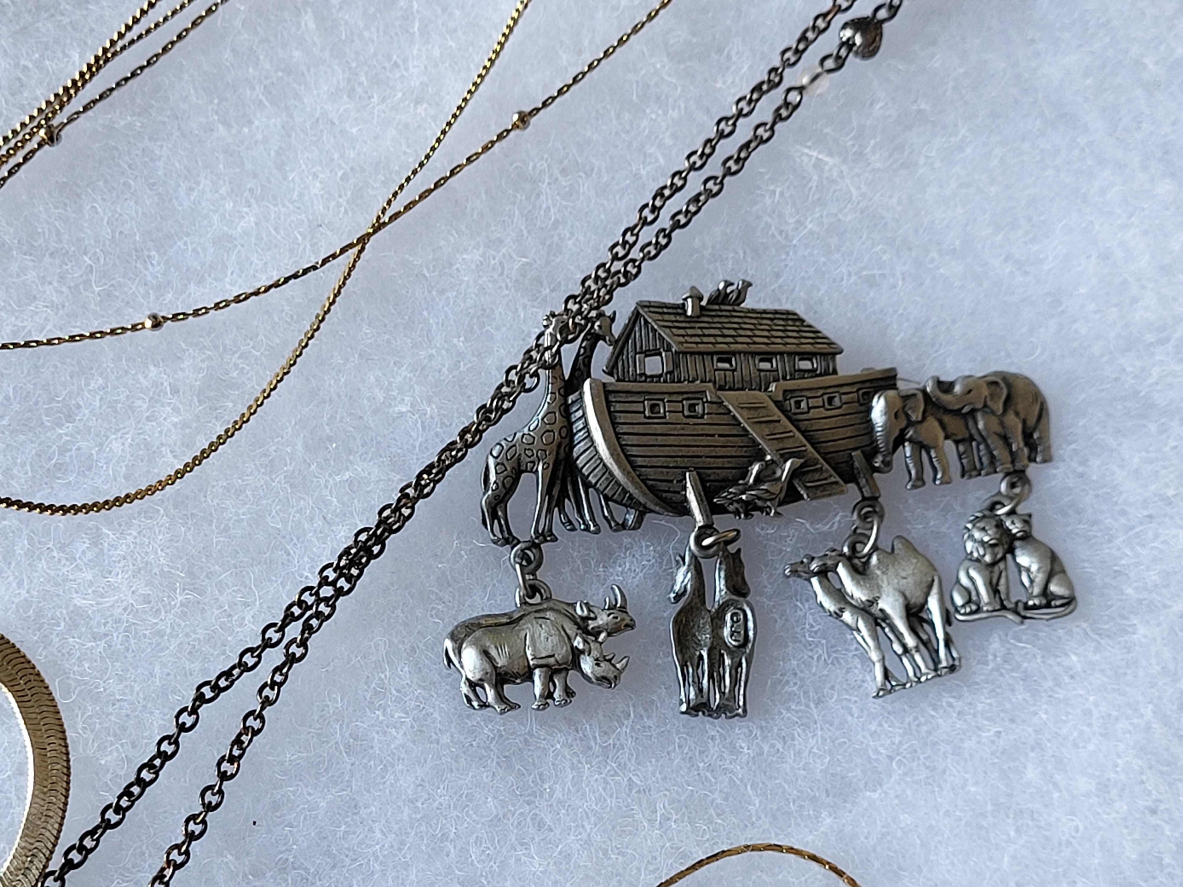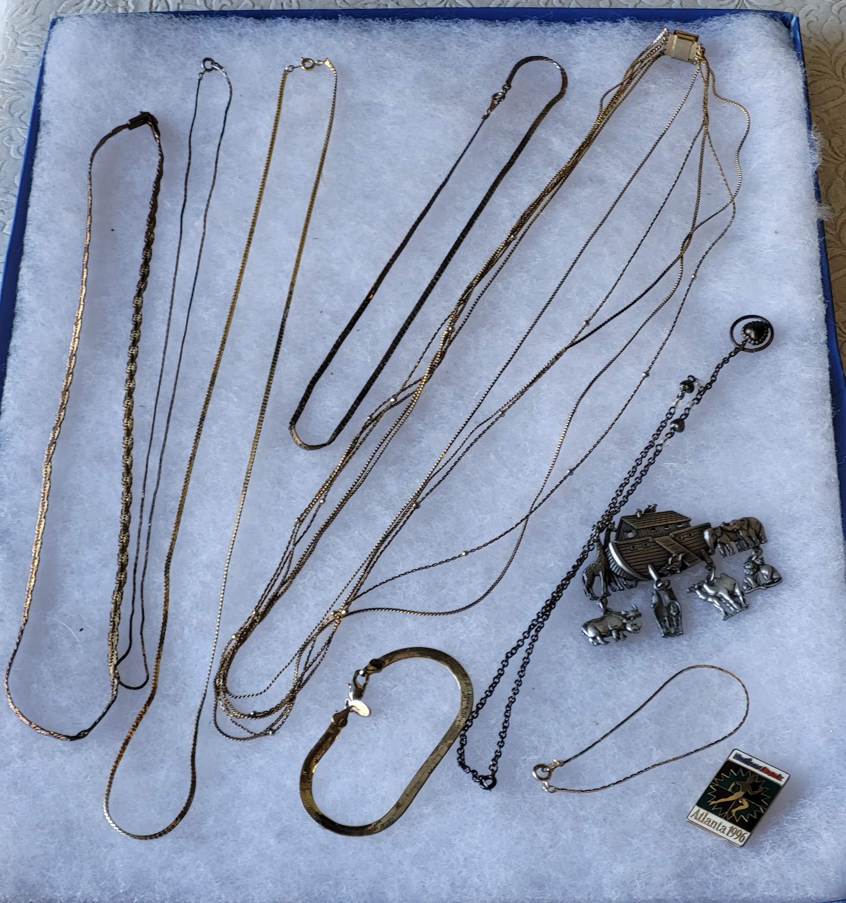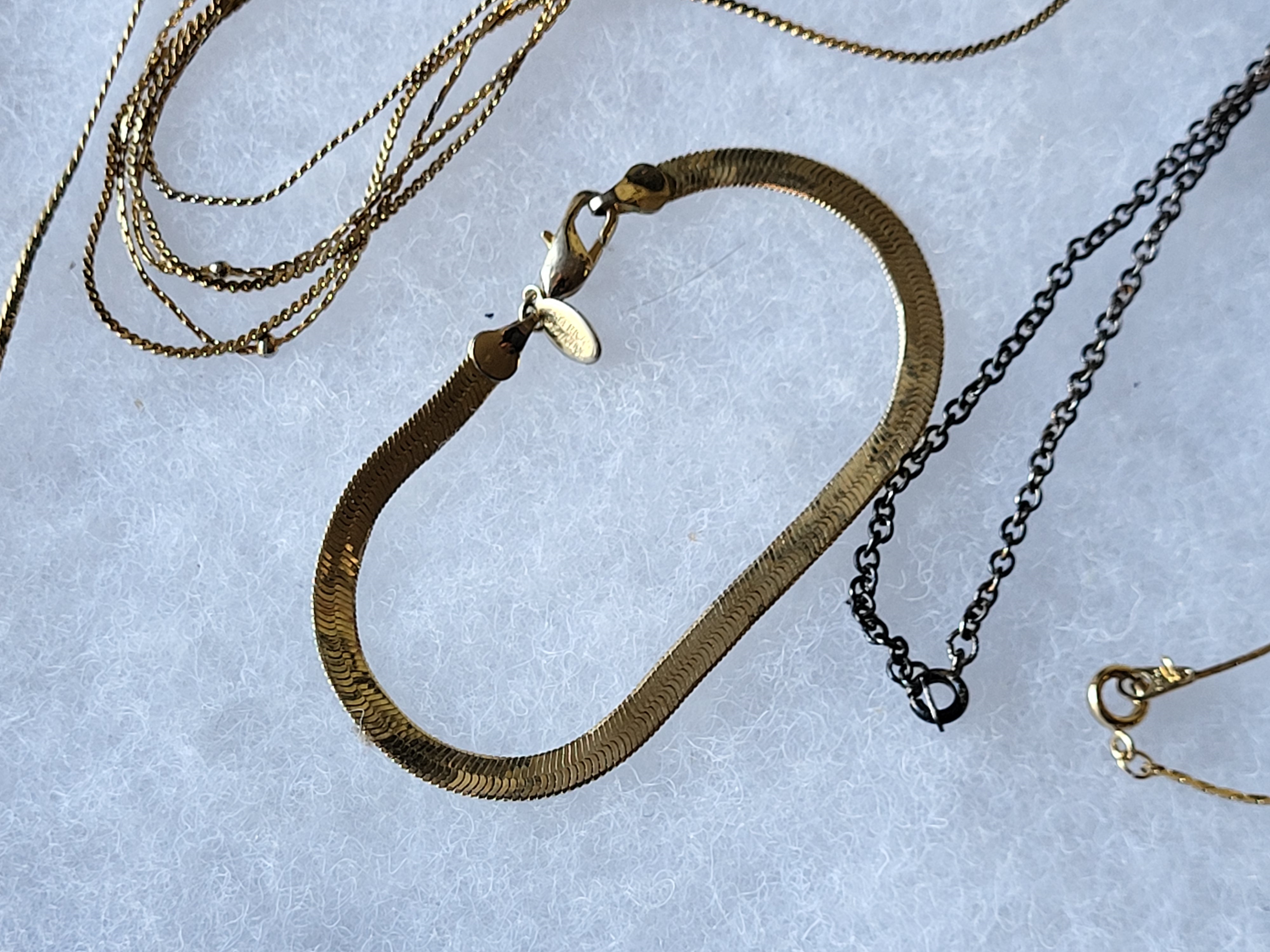 estate jewelry ot gold tone chains 14k gf, silver tone chain, brooches etc