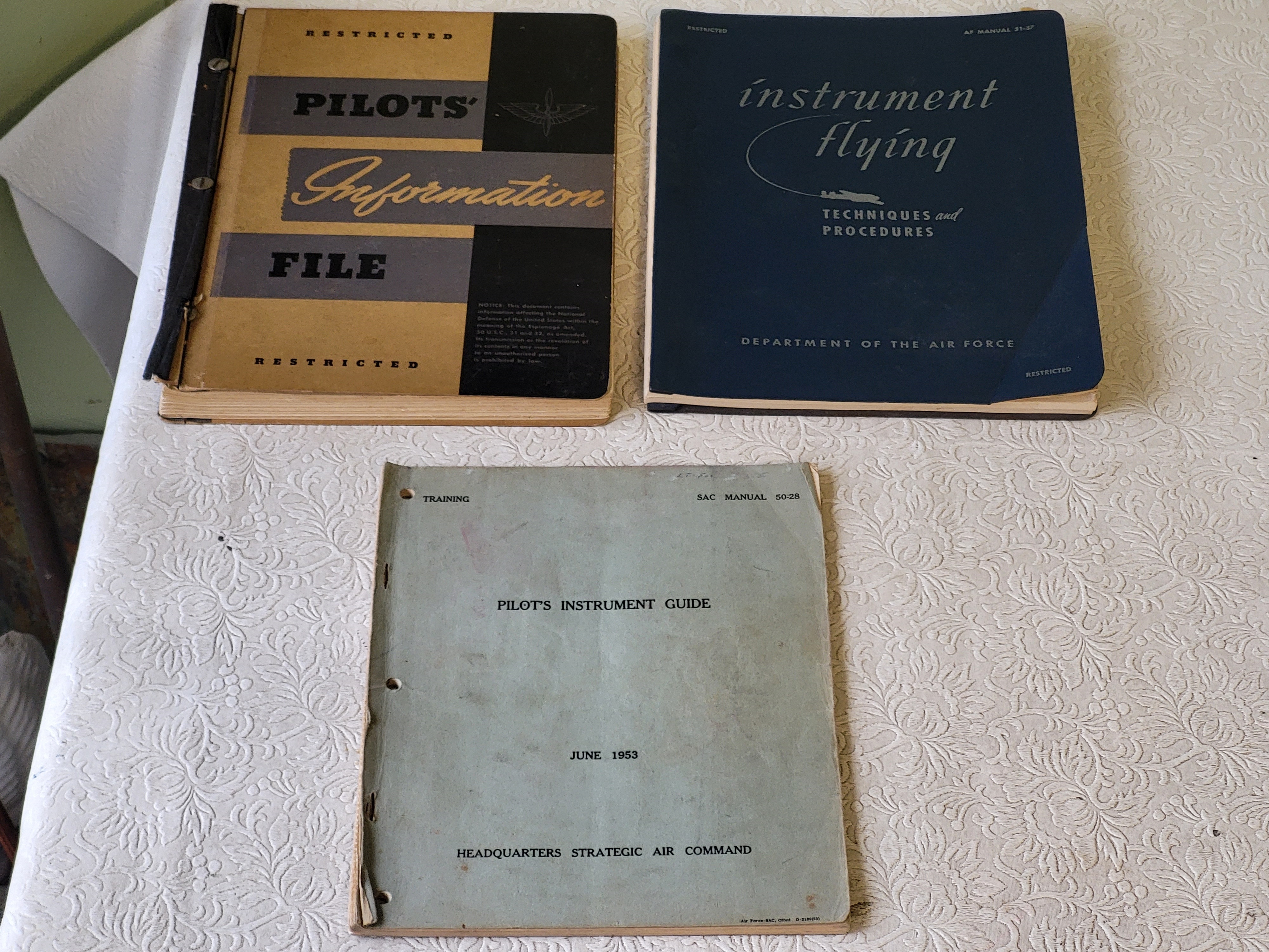 lot of 3 books 1945 pilot information file restricted, pilots instrument guide 1953 and instrument flying techniques and procedure 1951 all 3 for one bid