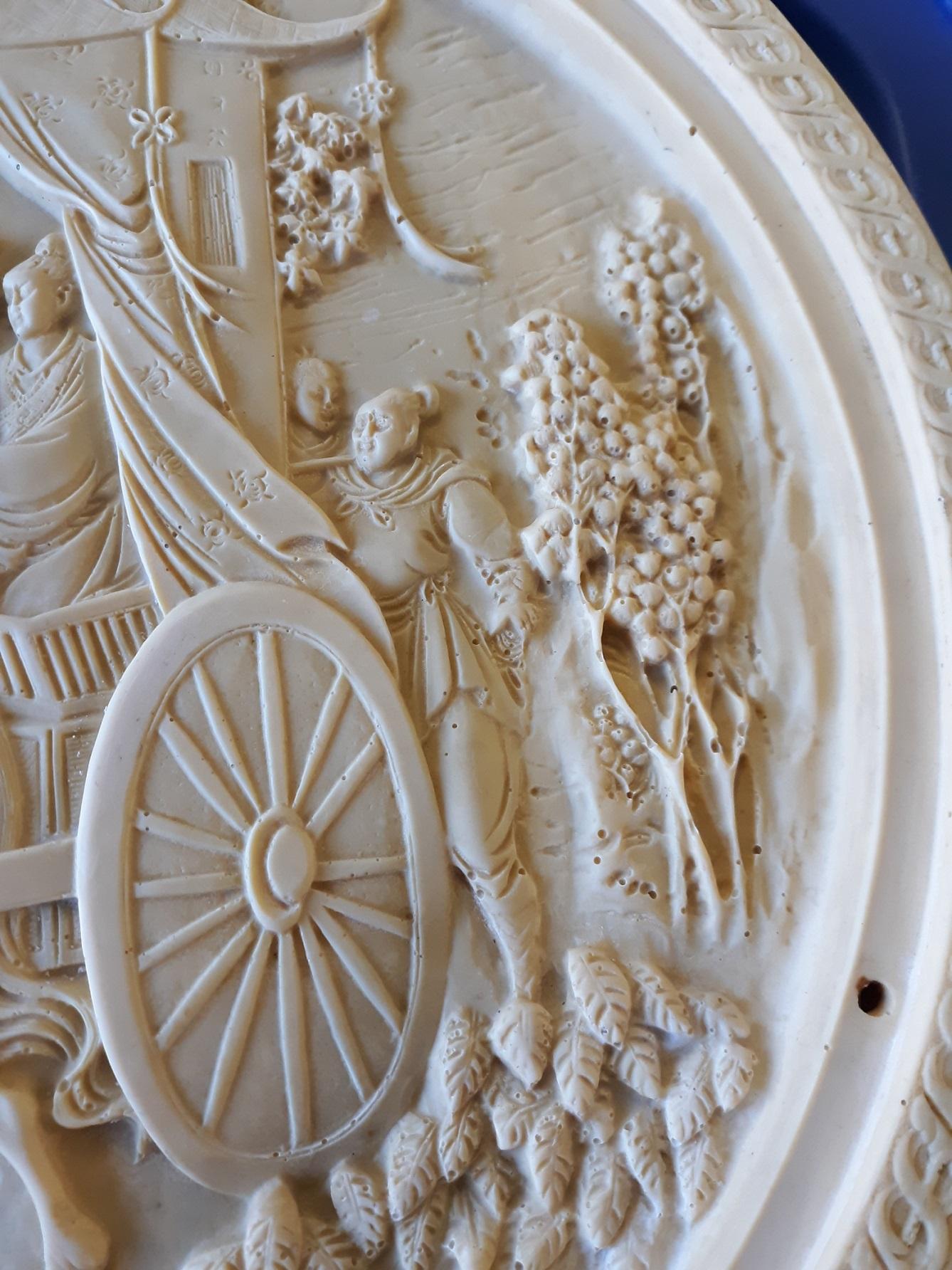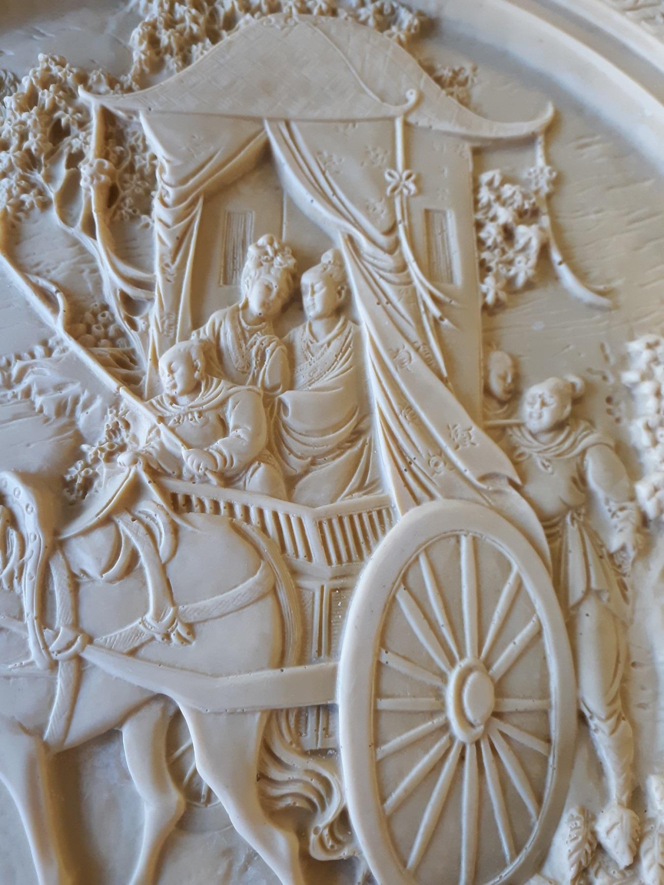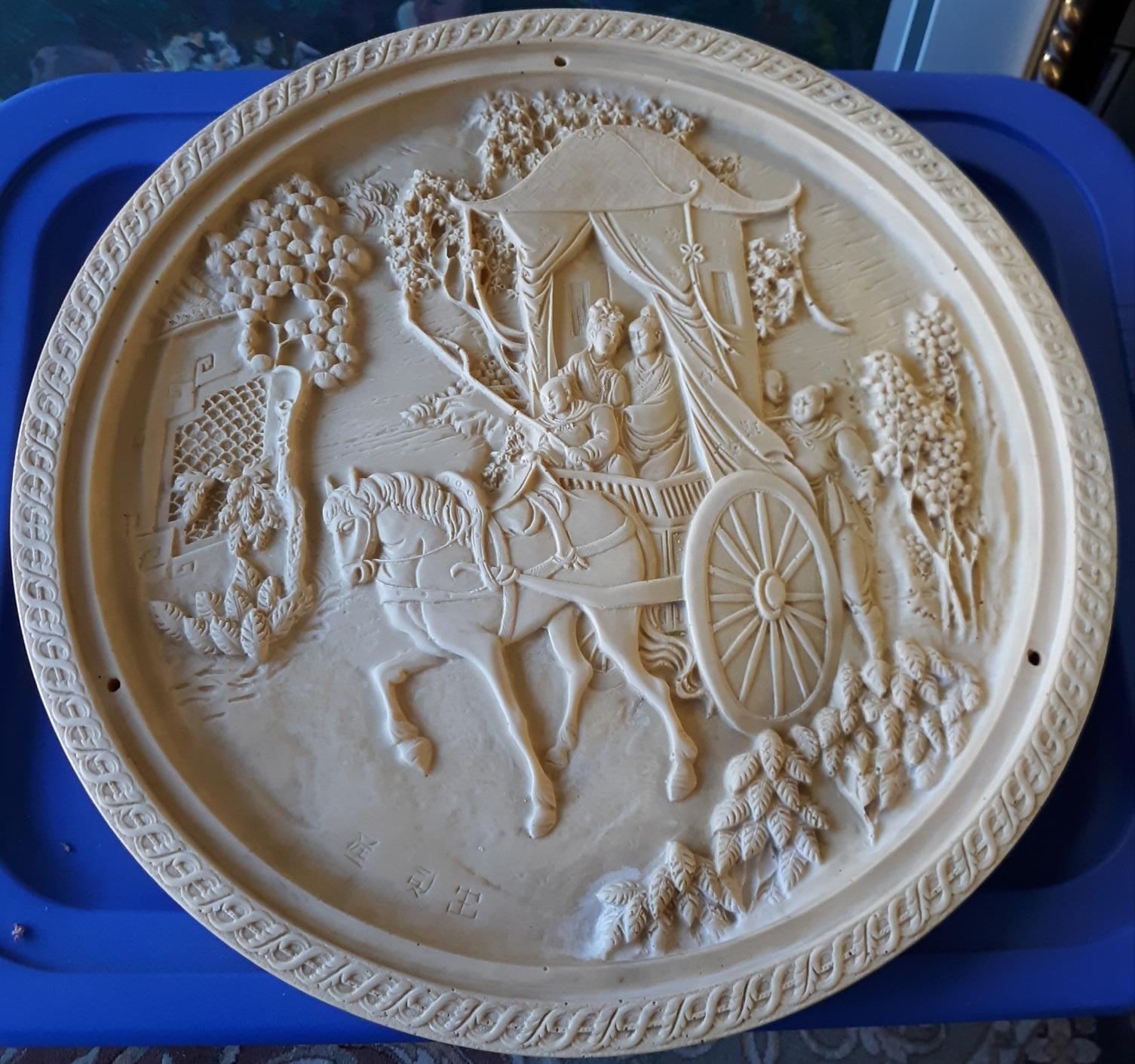 beautiful estate piece faux carved wall story plaque signed by artist lower left lots of detail 17 1/2″ across see pics