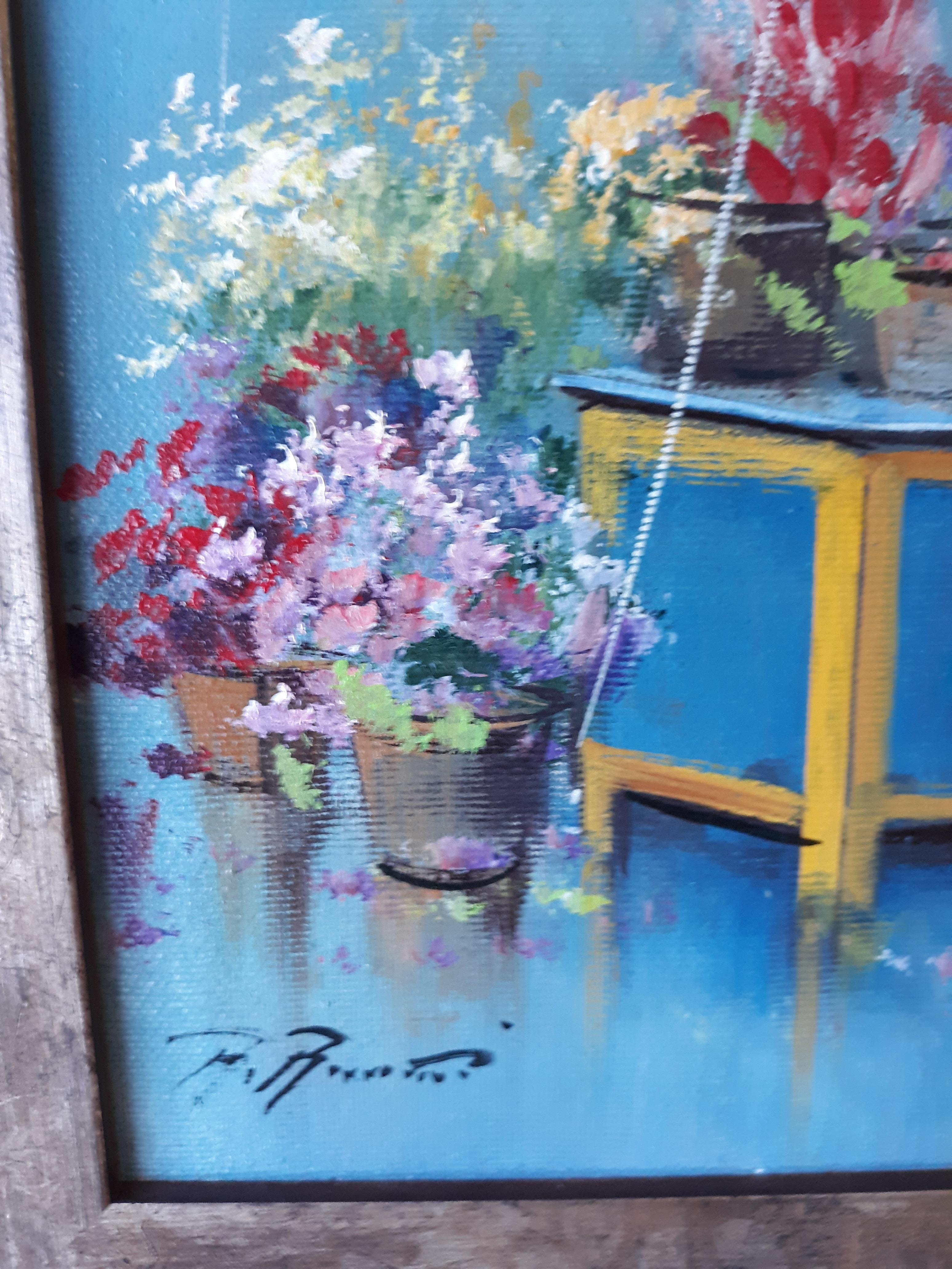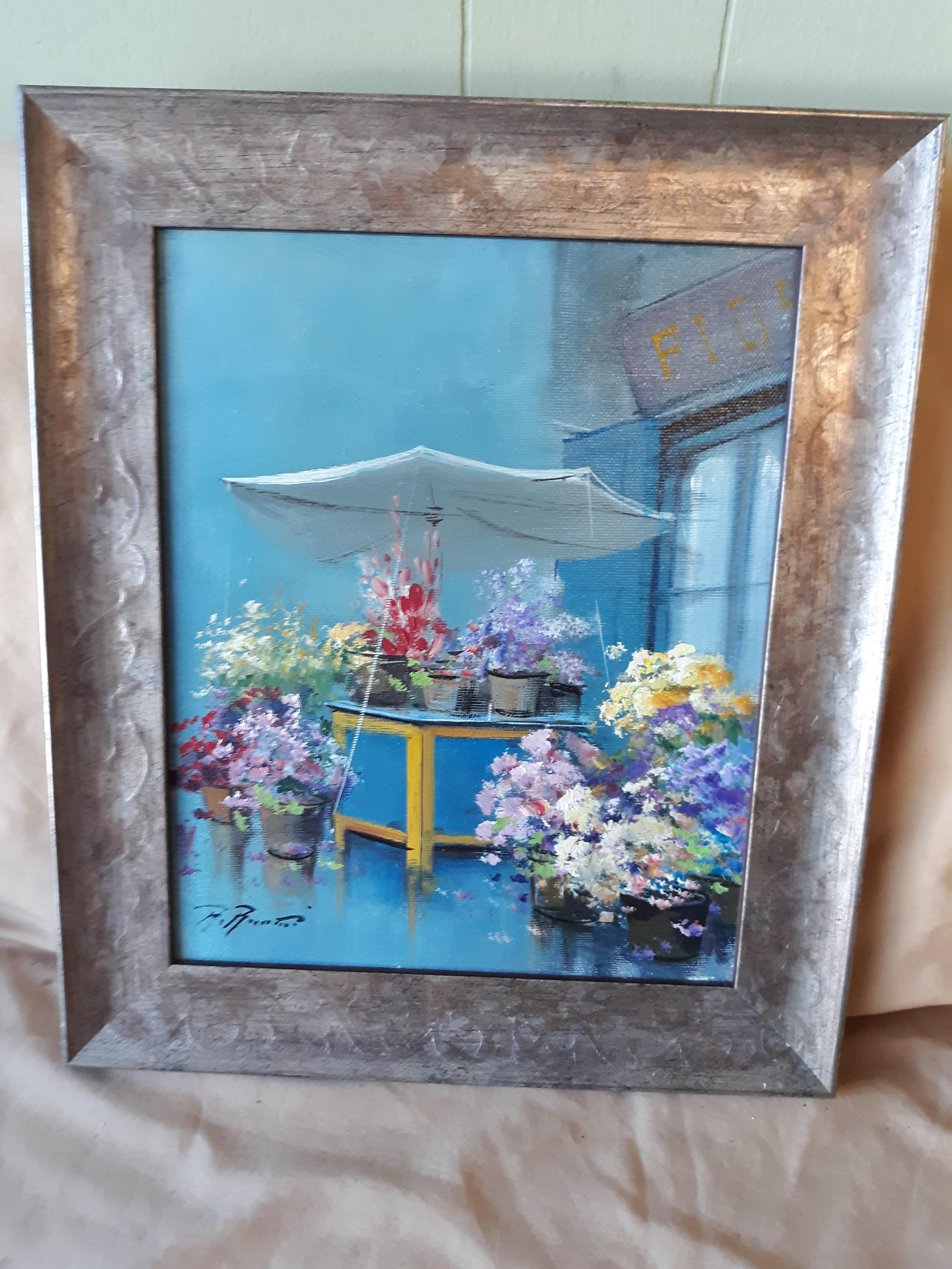 beautiful market flowers vendor scene in paris orig oil on canvas artist signed 15 1/2″ x 12 1/2″ frame size see pics