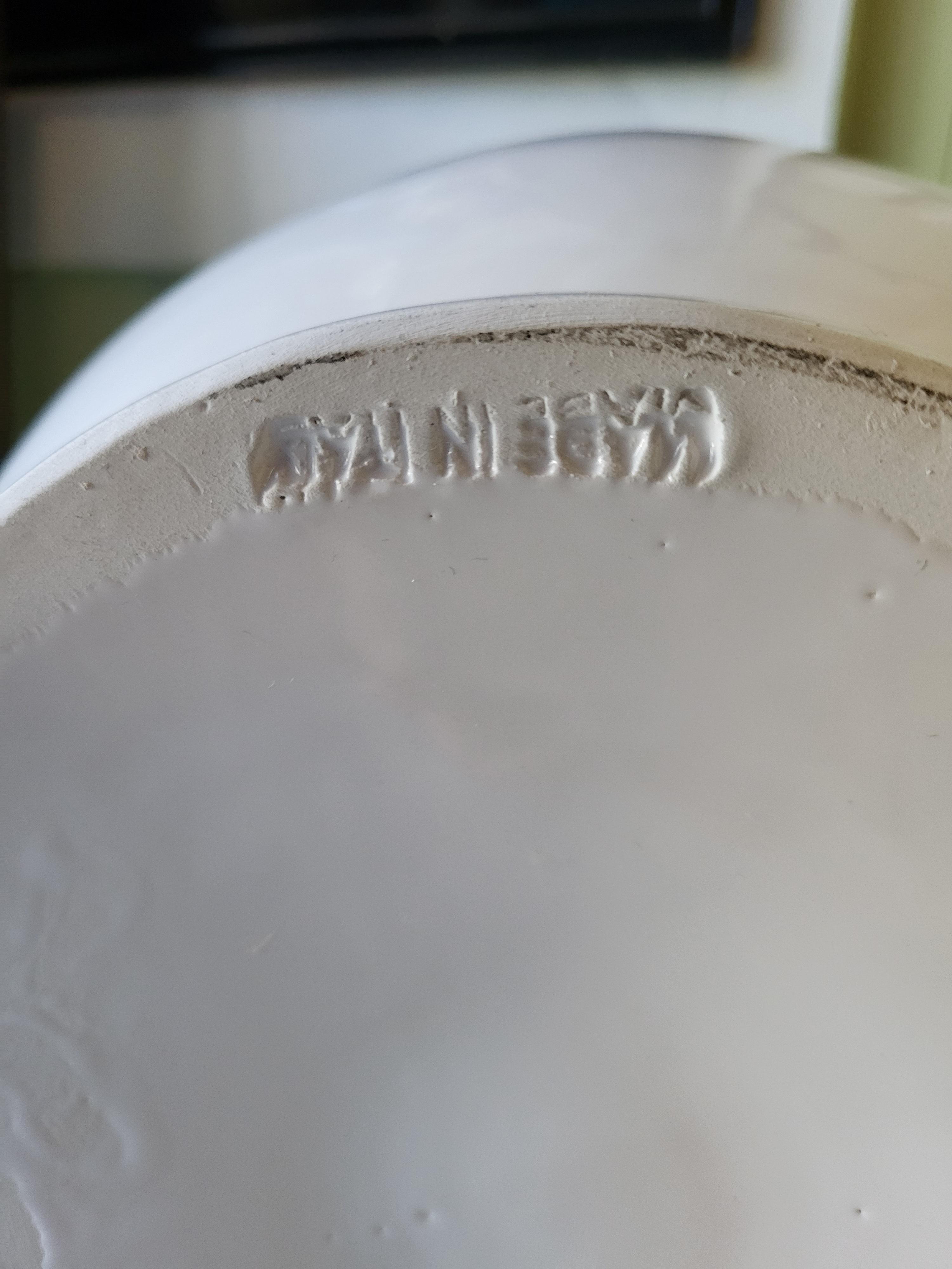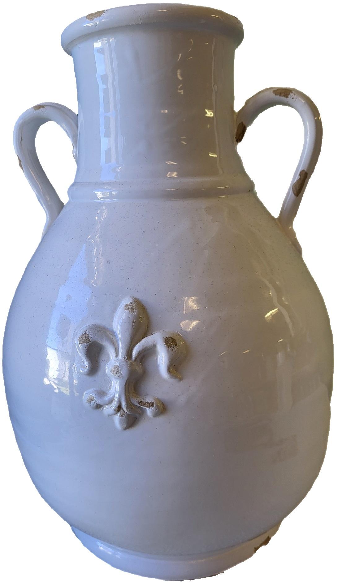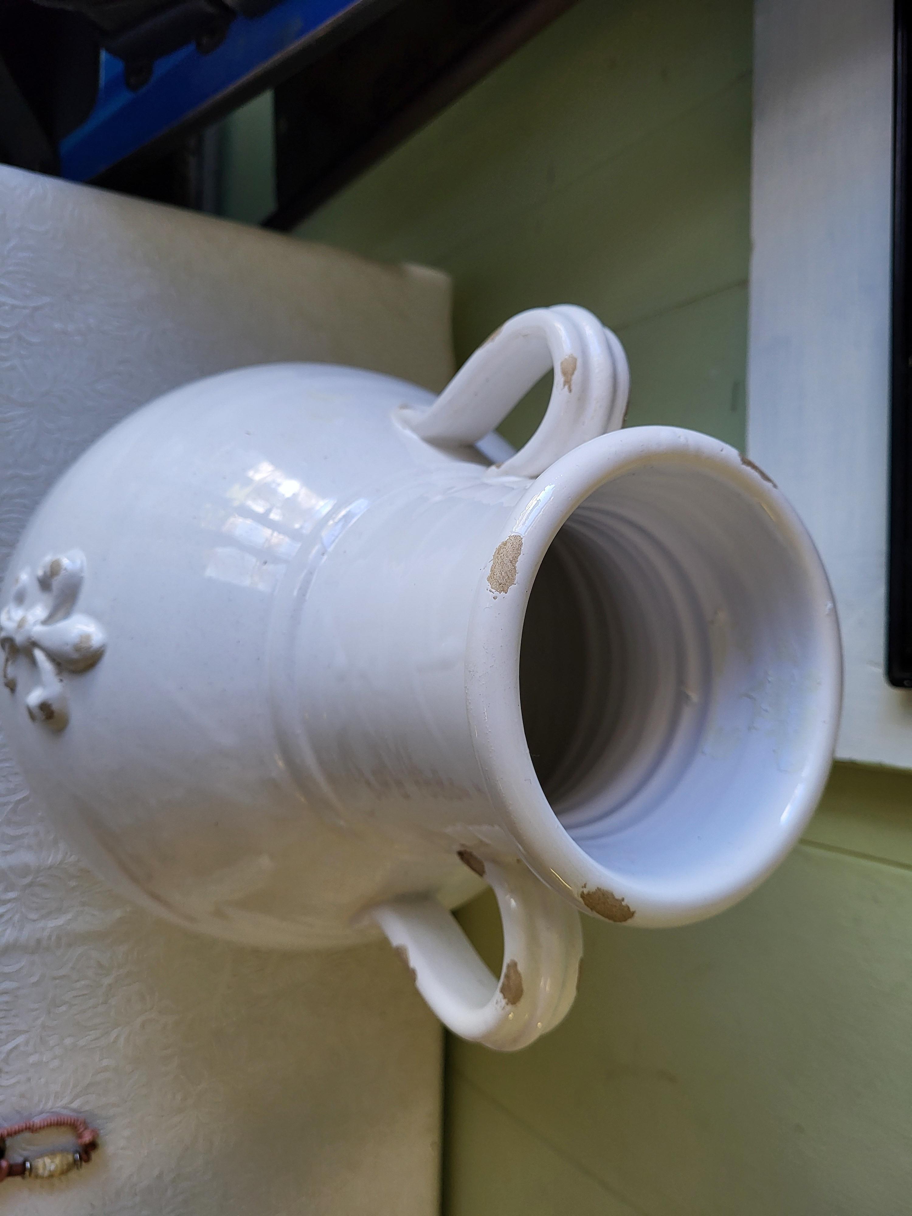 beautiful large italian white glaze pottery vase, light distressing detail two handles no breaks 14″ tall marked on bottom made in italy see pics