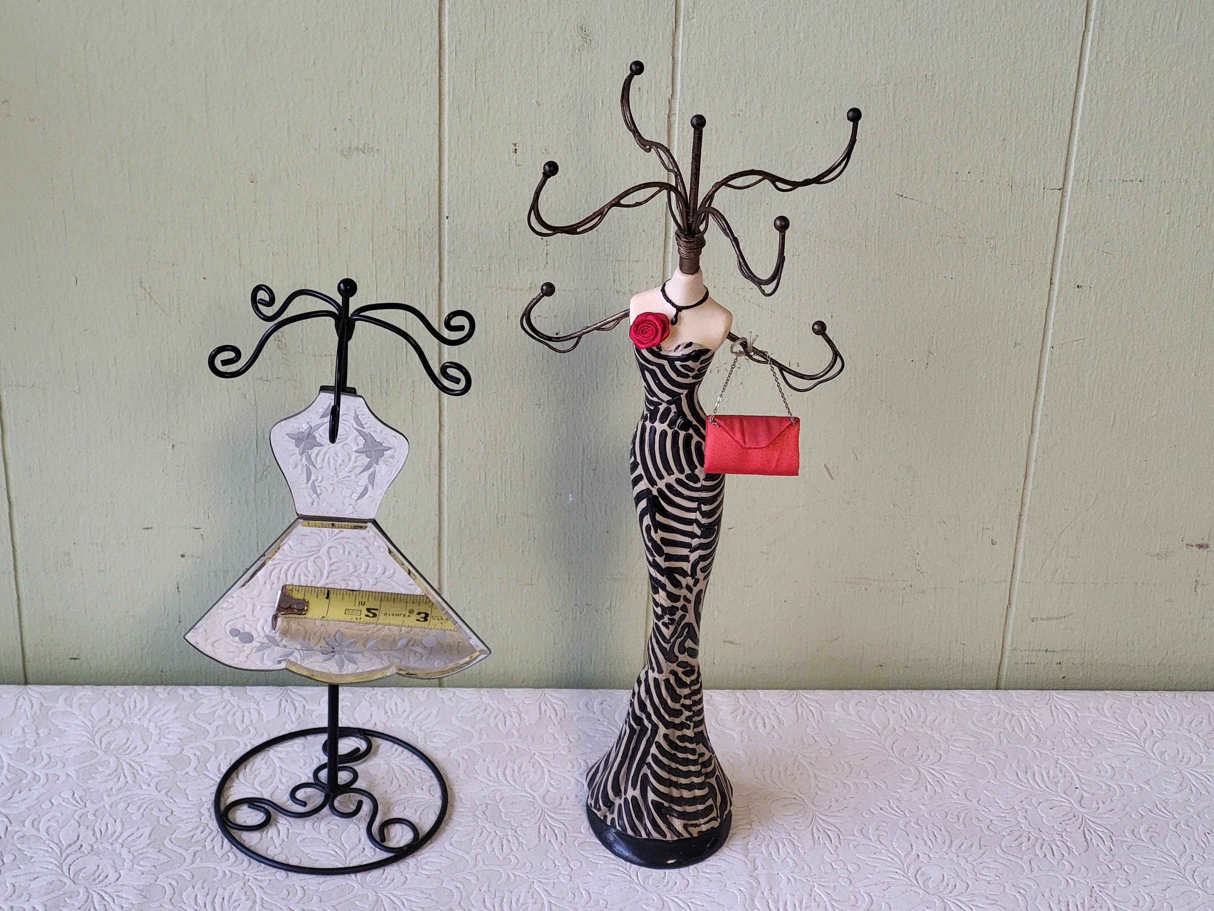 11″ tall one with beveled and etched mirror in shape of a dress, and 14″ lady. top rotates she even has a purse both forone bid excellent condition see pics