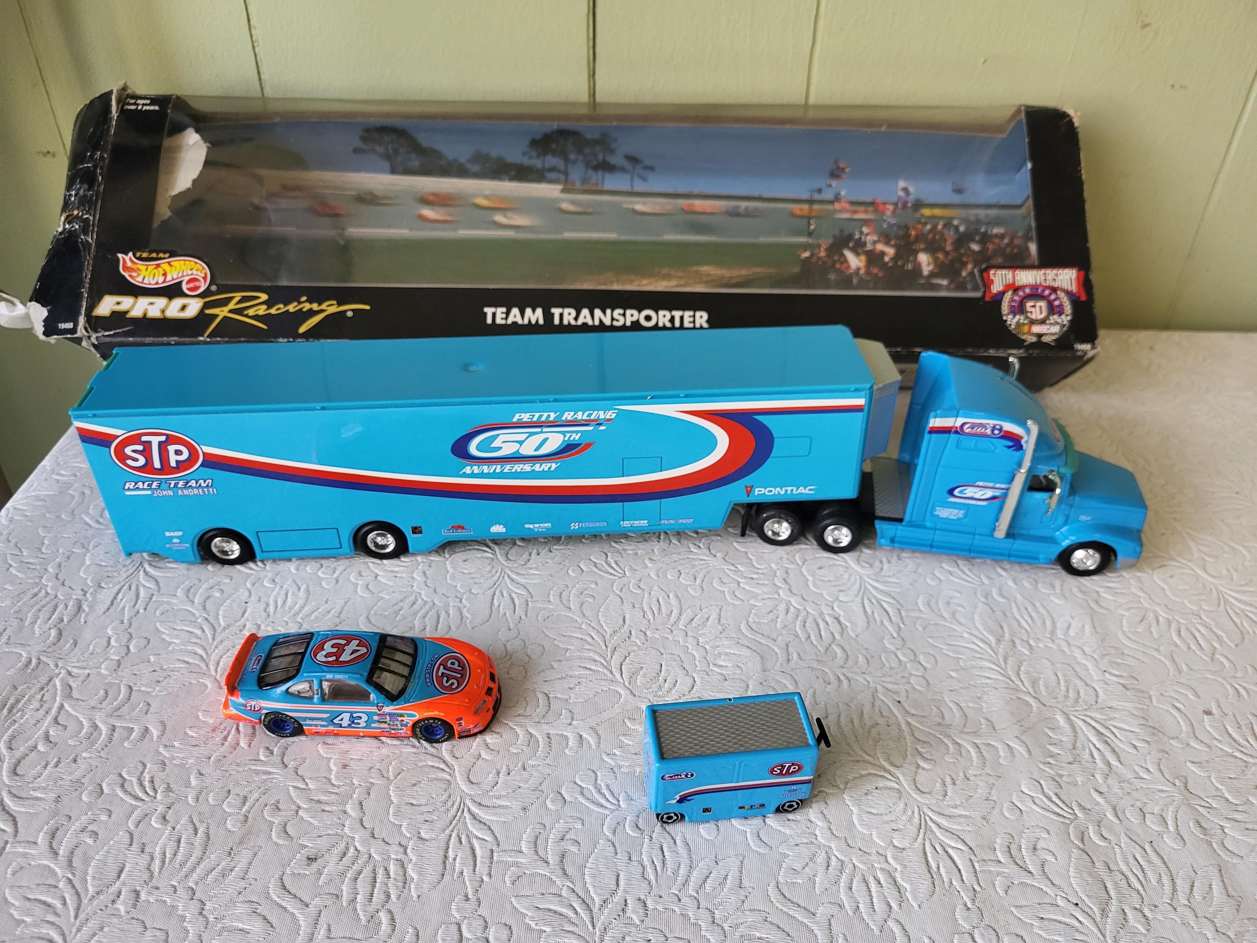 nascar petty racing hotwheels transporter w/car &toolbox in orig box ww/ car and tool box end is rough semi and car etc is mont seepics