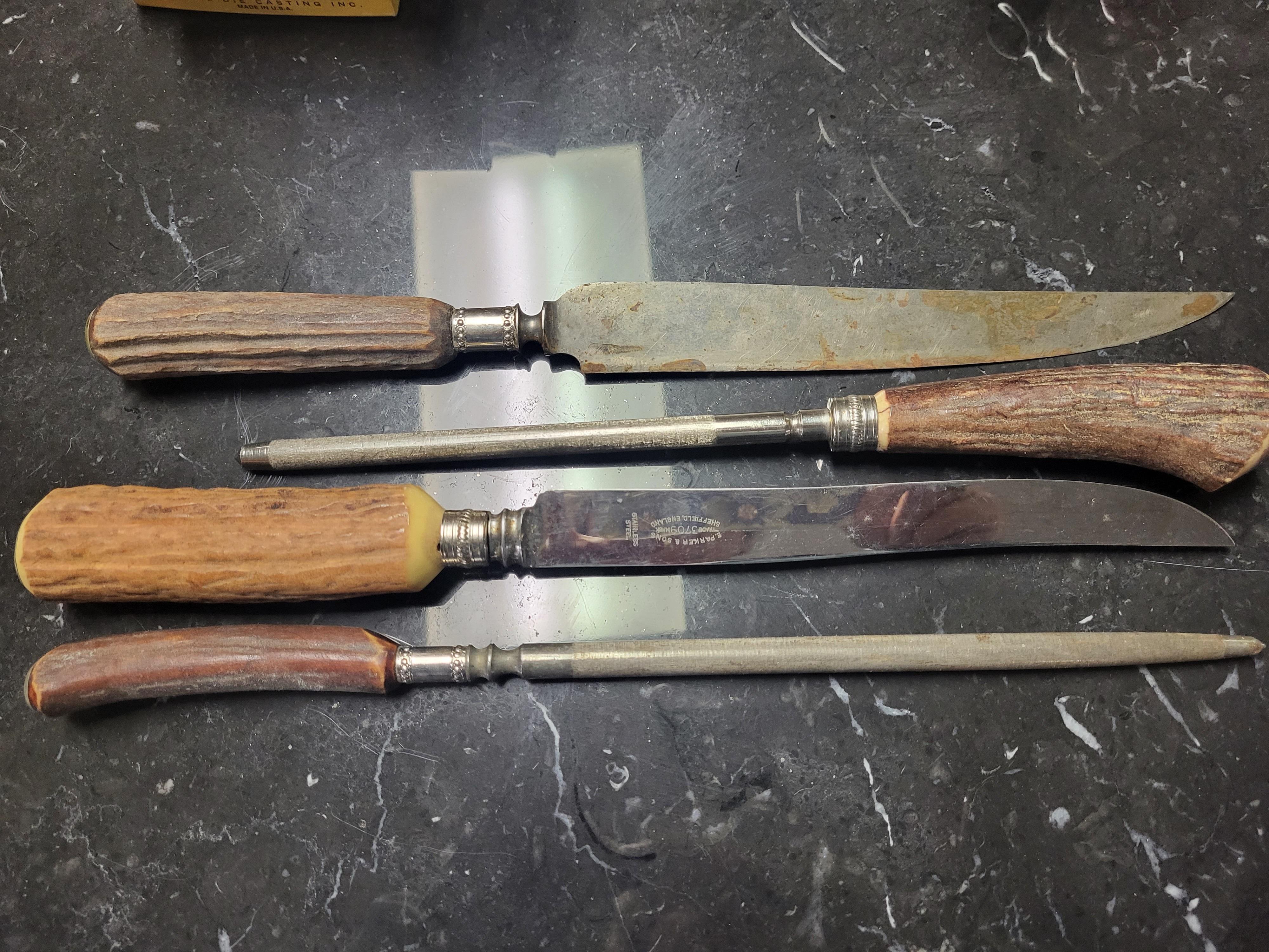 lot of 4 northampton carving knife and E parker & sons carving knife and two sharpeners all 4 for one bid! see pics