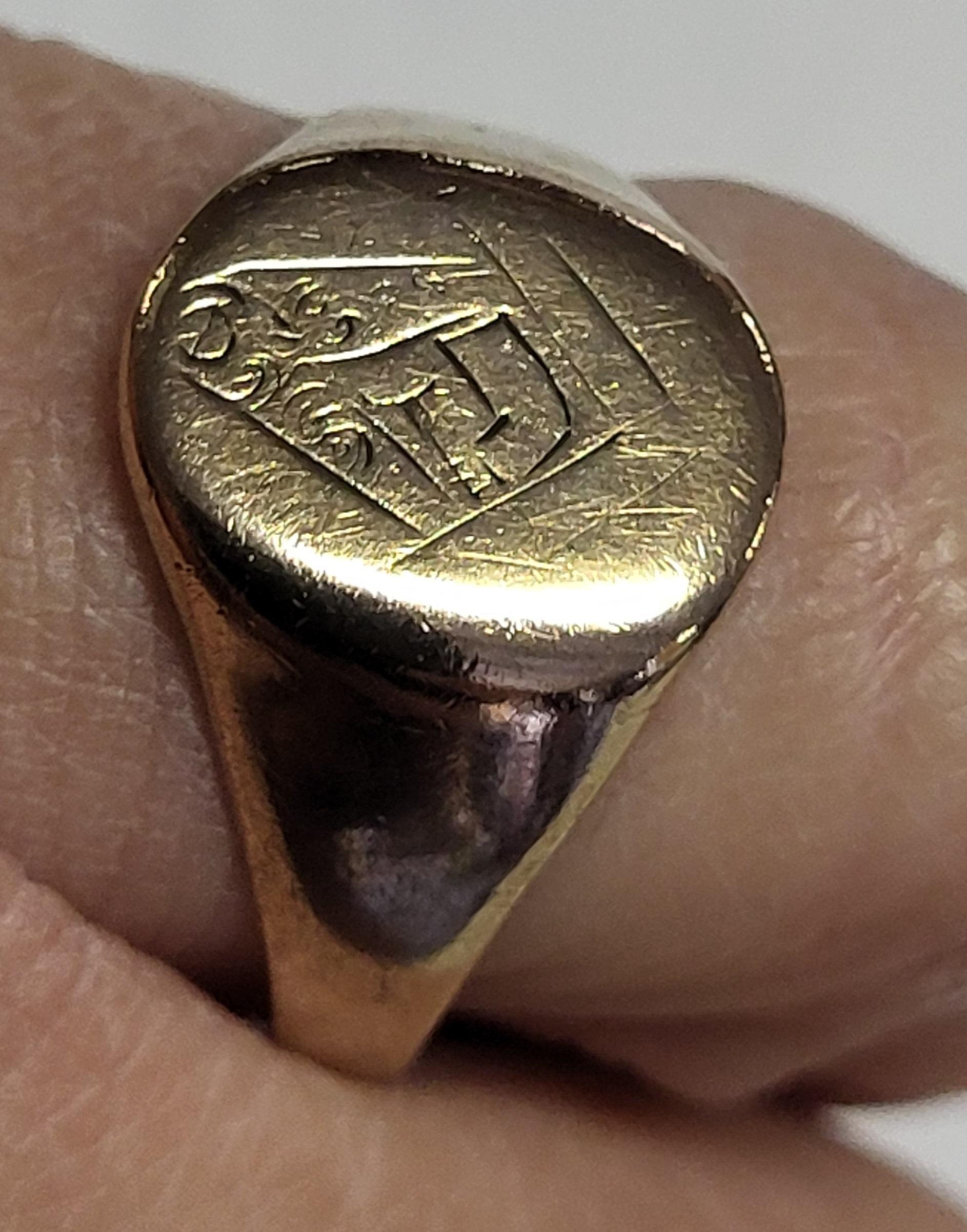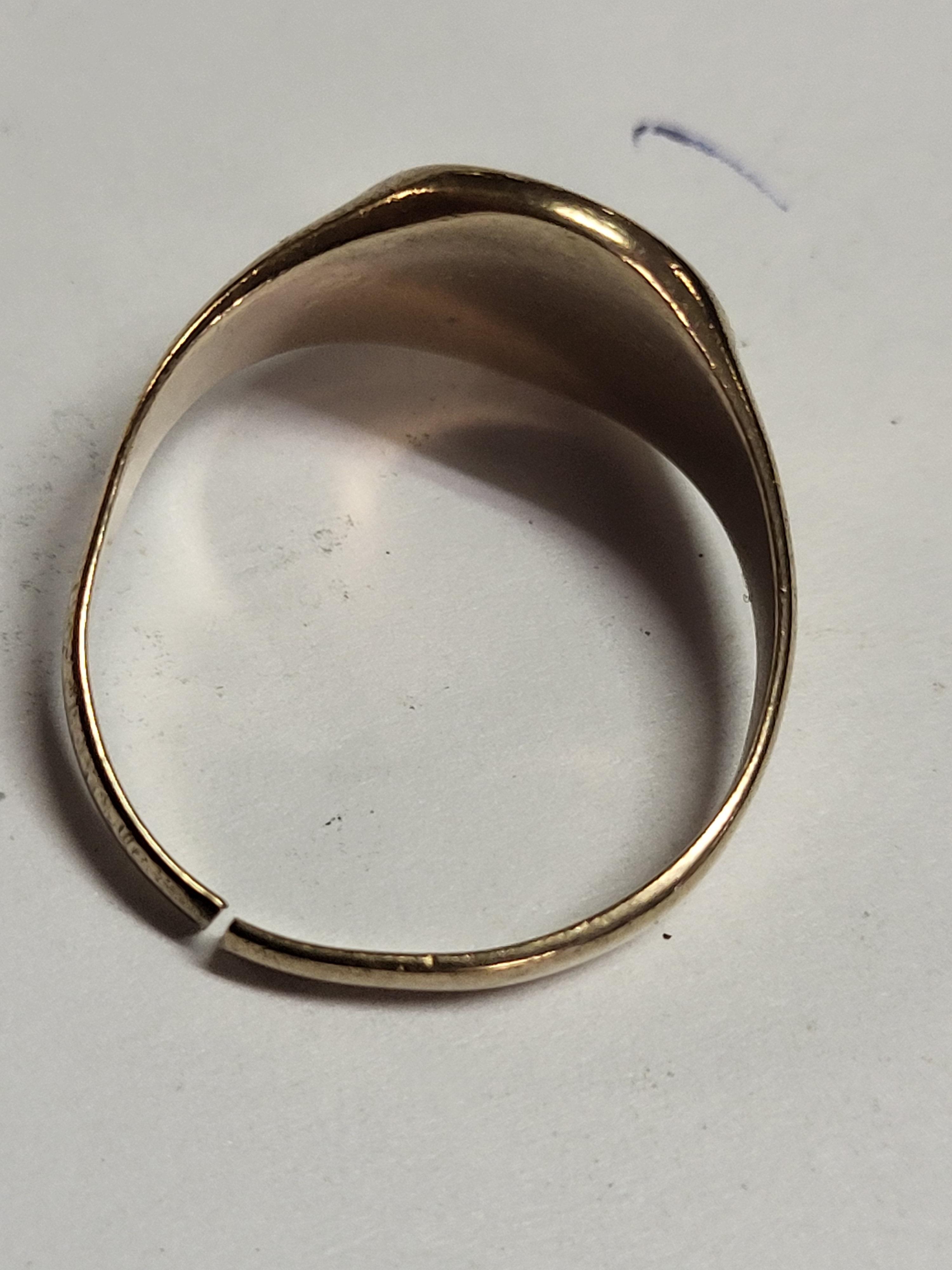 from estate grandfathers ring was cut but very easy tot repair or resize. 5.3 grams see pics
