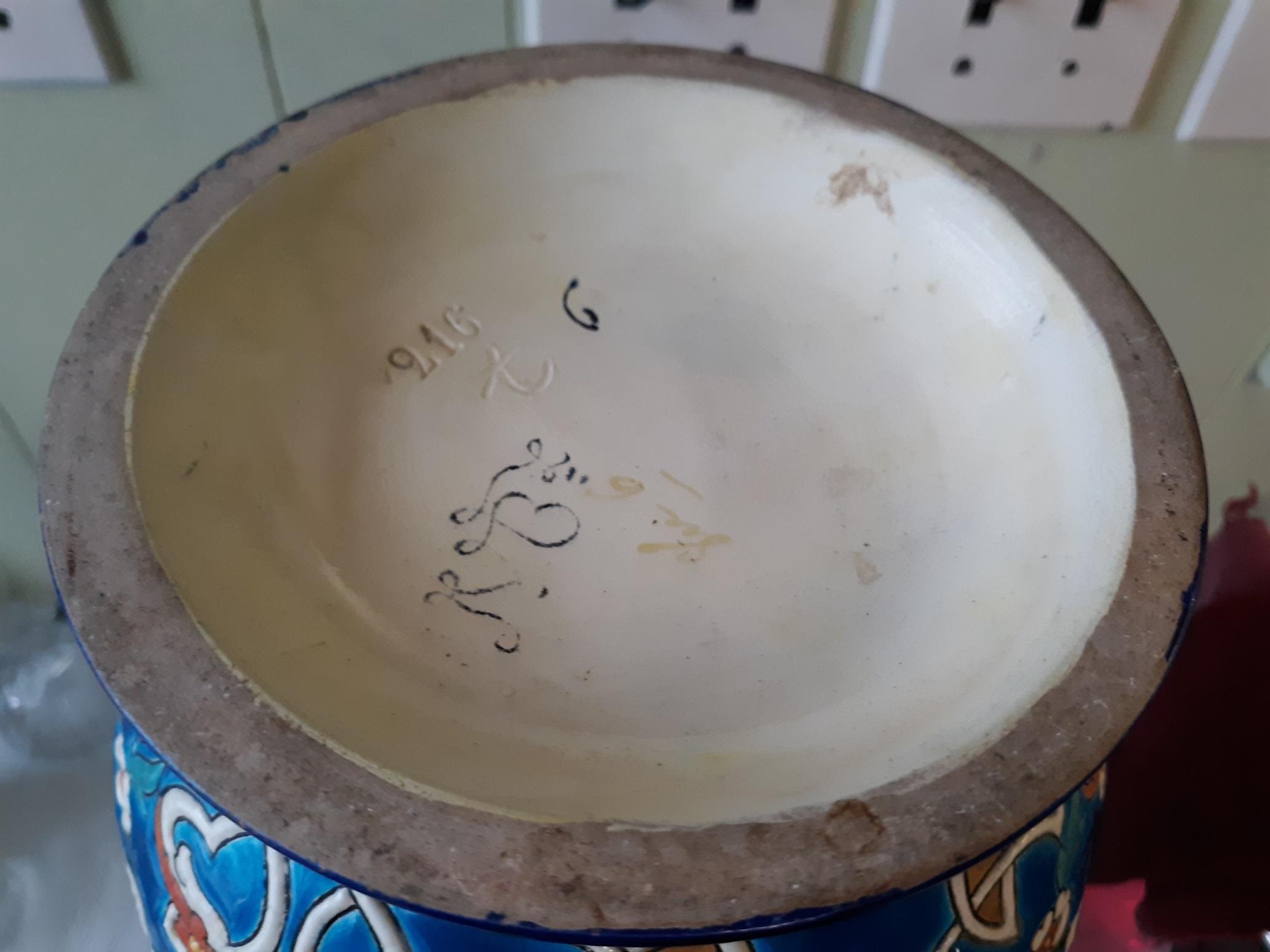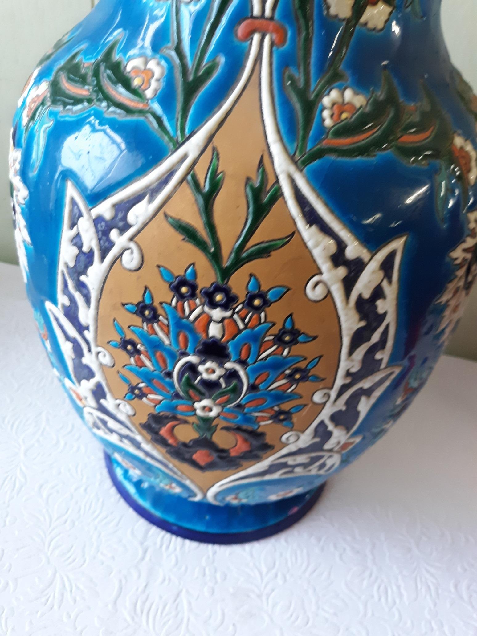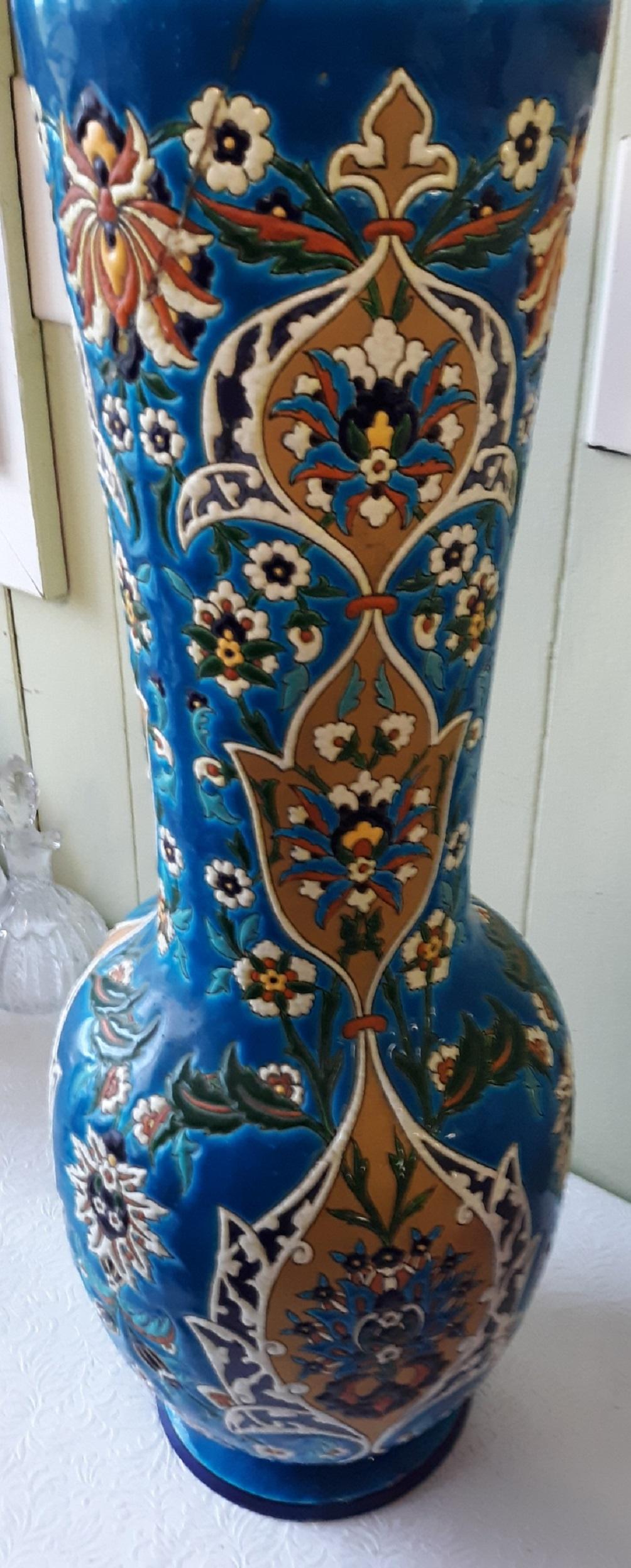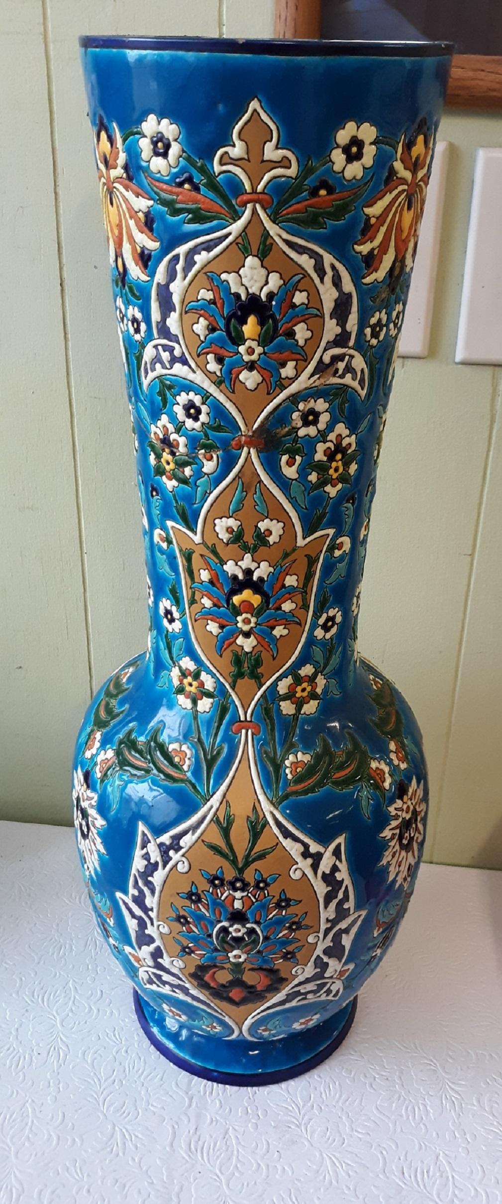 monumental antique Jules vieillard faience French enameled vase circa early 1840’s -50’s showing antique staple repair probably 1800’s 22 5/8″ tall signed on bottom certainly designed by amedee de caranza overall age crazing also correct & expected for age from estate see pics