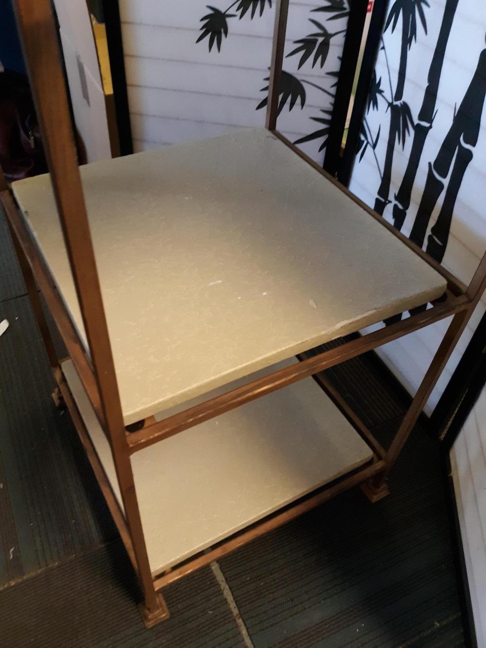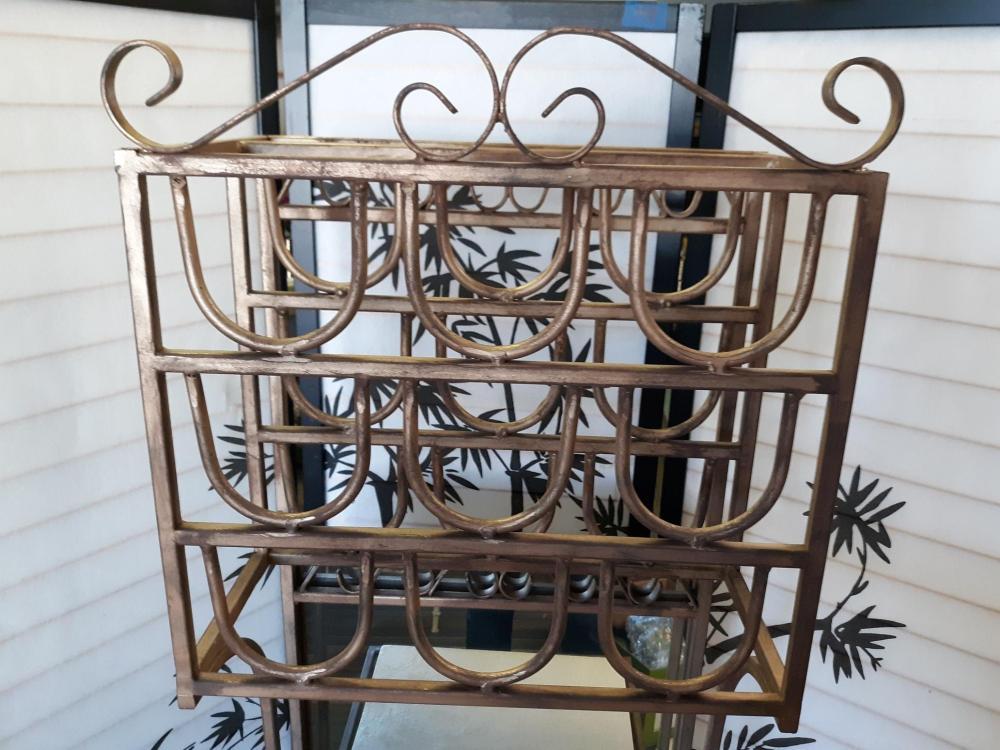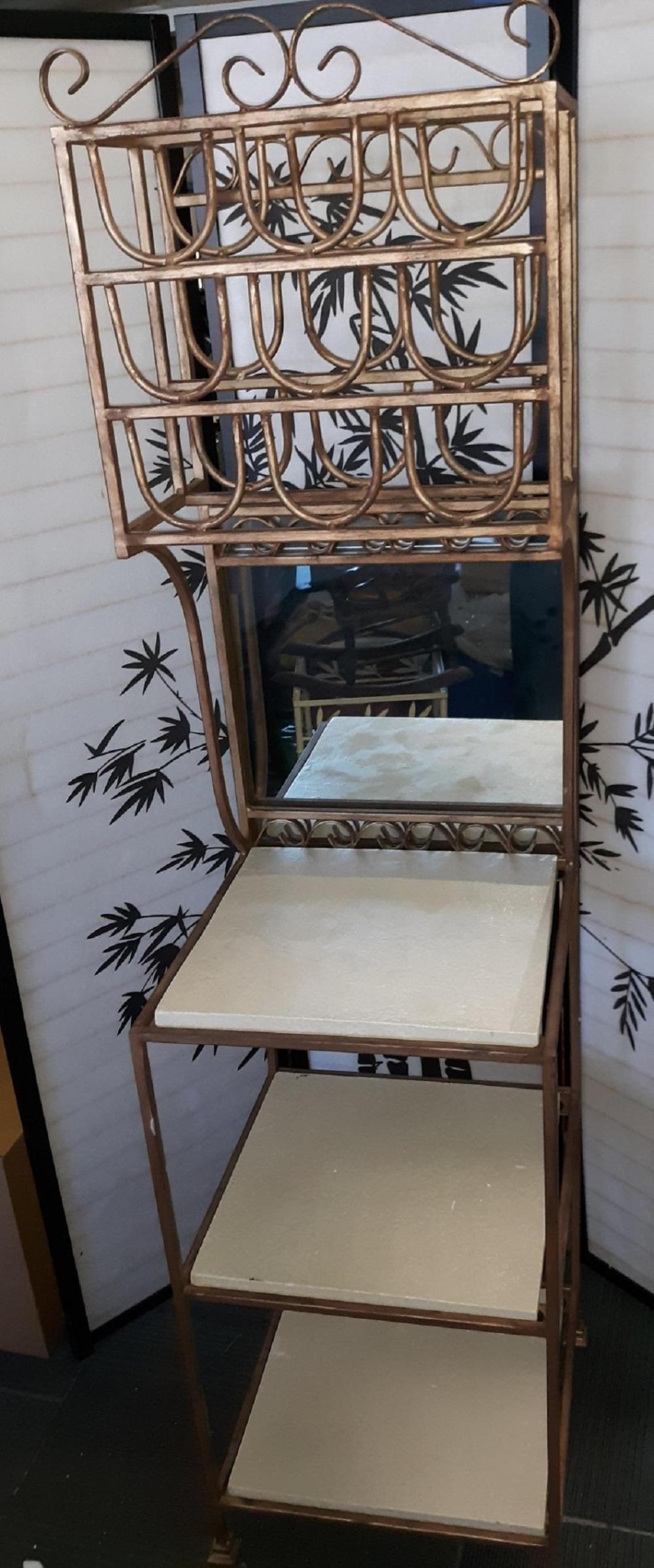 Iron Bakers Rack W/Stone Shelves and Wine Rack. vintage wrought iron rack with antique gold patina wine rack on top with shelves and mirrored back in center shelves are heavy and can be removed for moving, marble/stone type 69″ tall x 17″ x 16″ see pics! very high quality great for the condo, apartment or small space