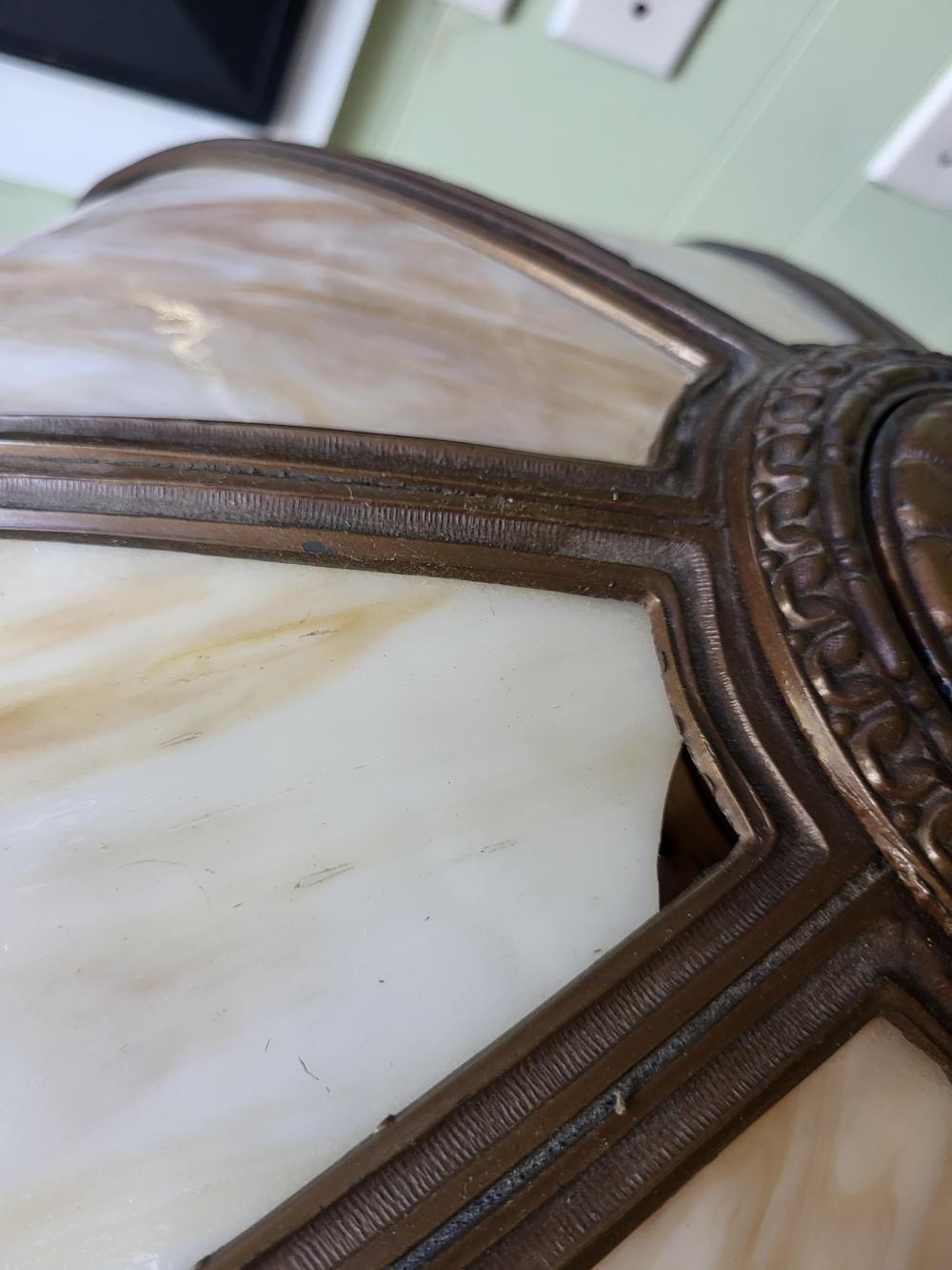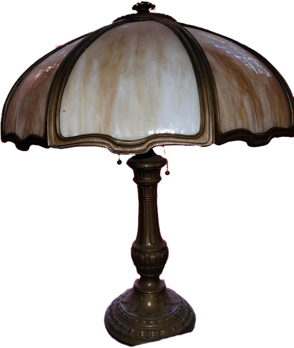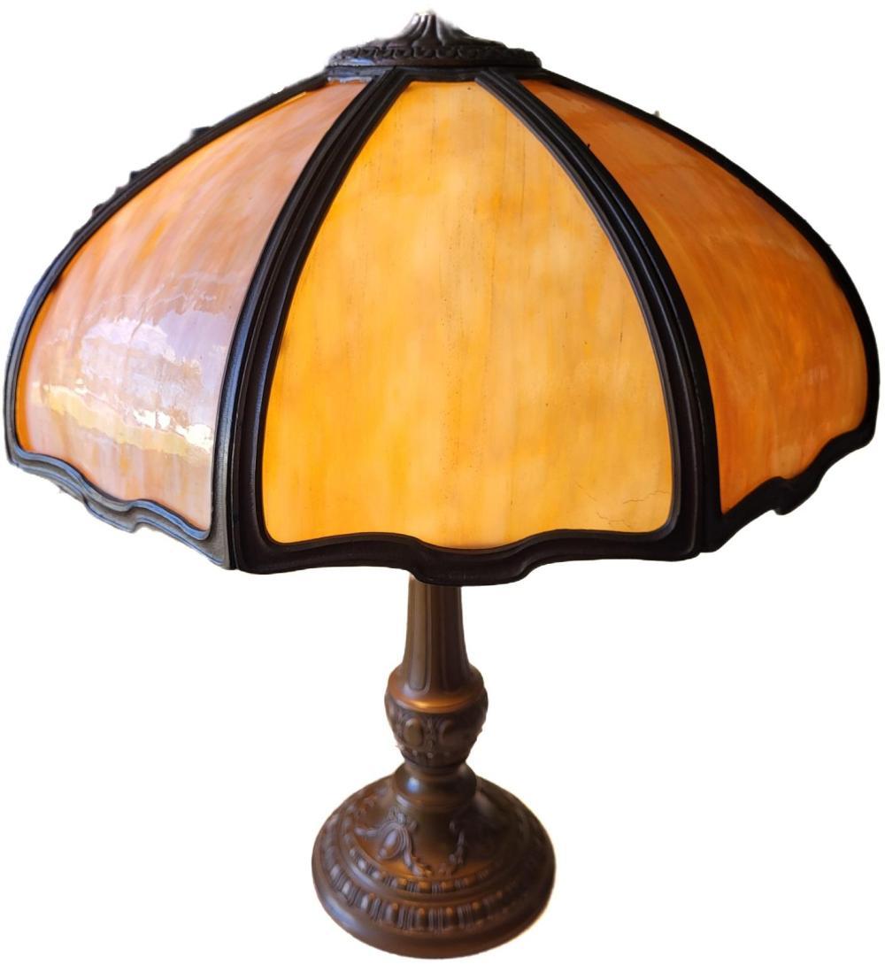 caramel slag glass in bronzed miller frame 24″ tall 19″ wide shade, beautiful antique shade as 1 teeny crack pictured not seen displayed bronze base table lamp see pics