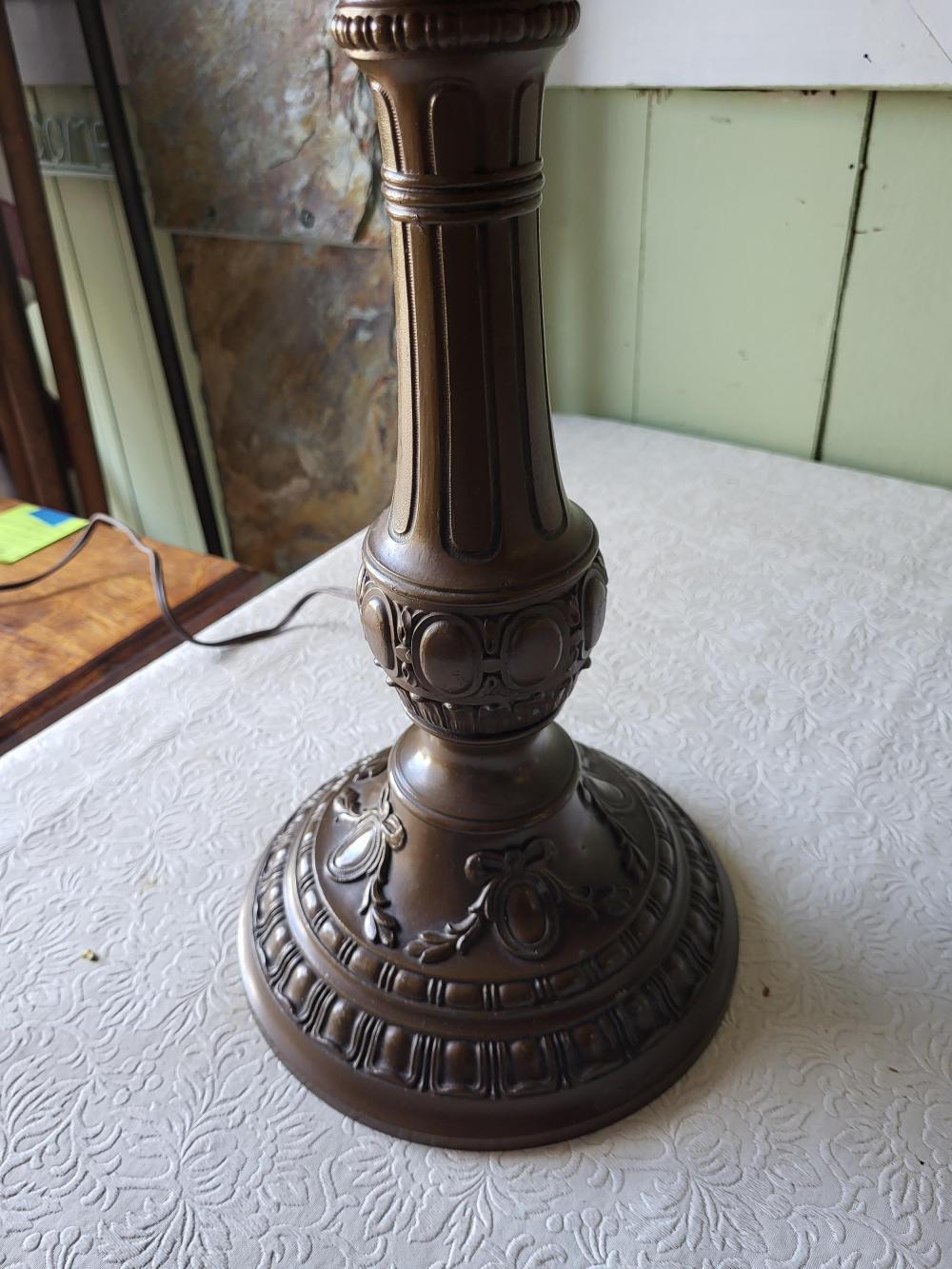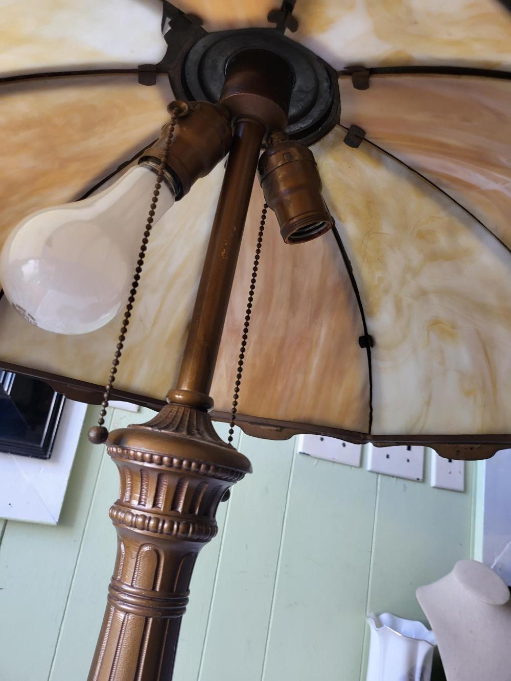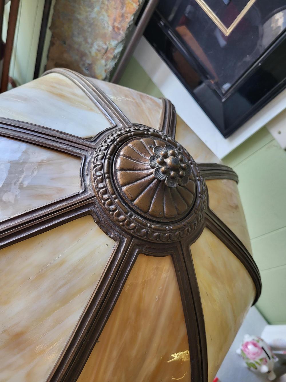 caramel slag glass in bronzed miller frame 24″ tall 19″ wide shade, beautiful antique shade as 1 teeny crack pictured not seen displayed bronze base table lamp see pics