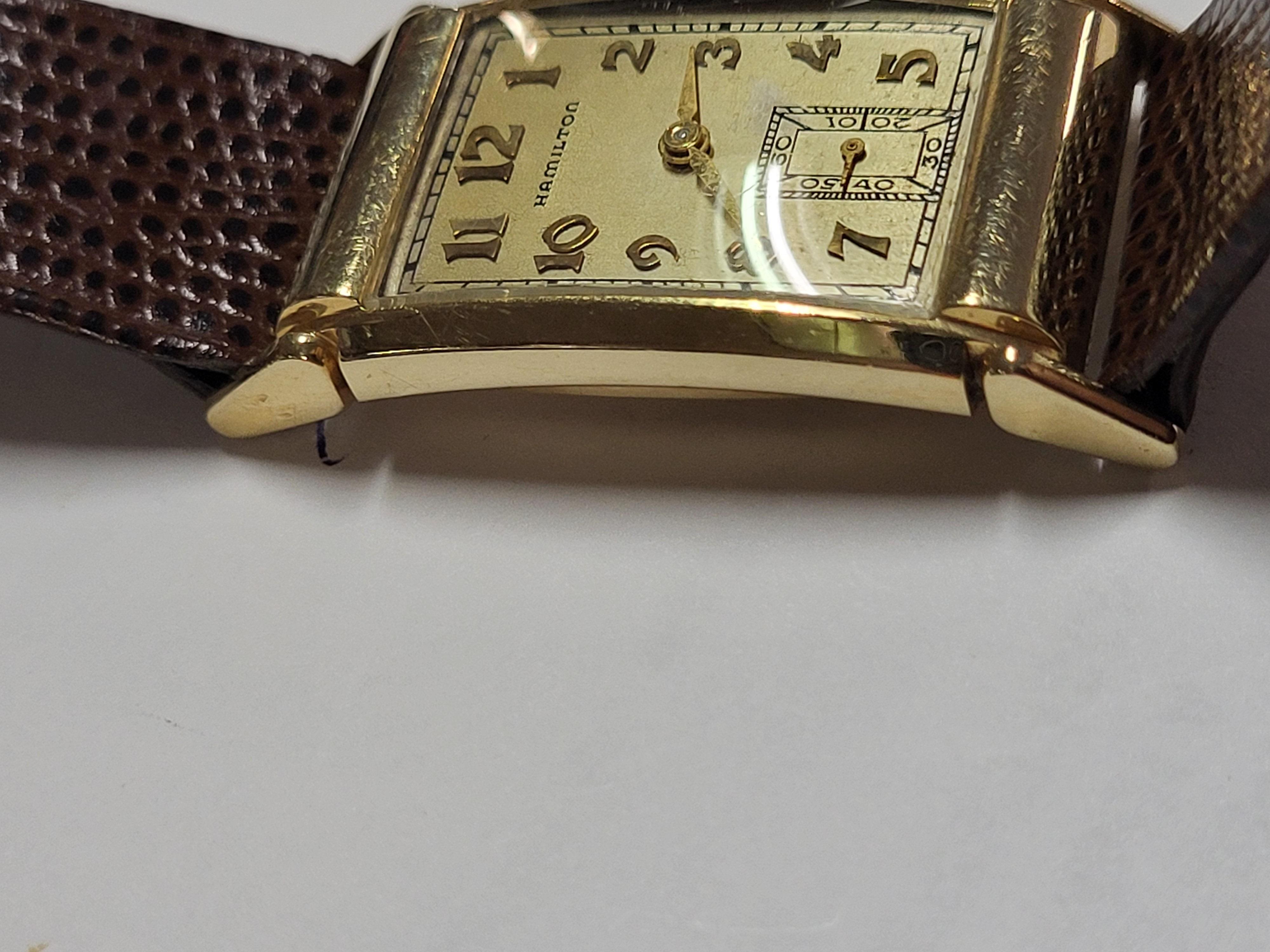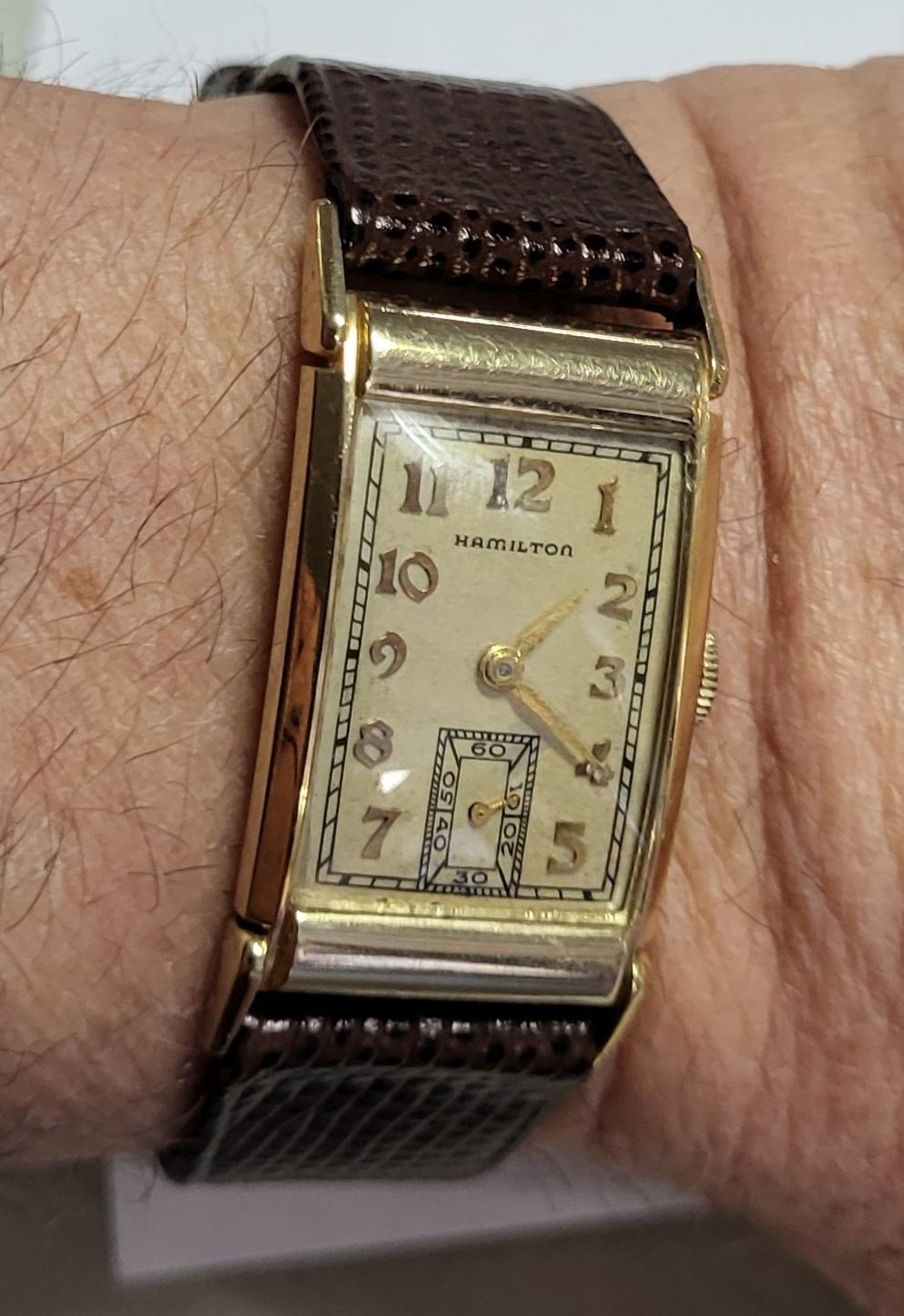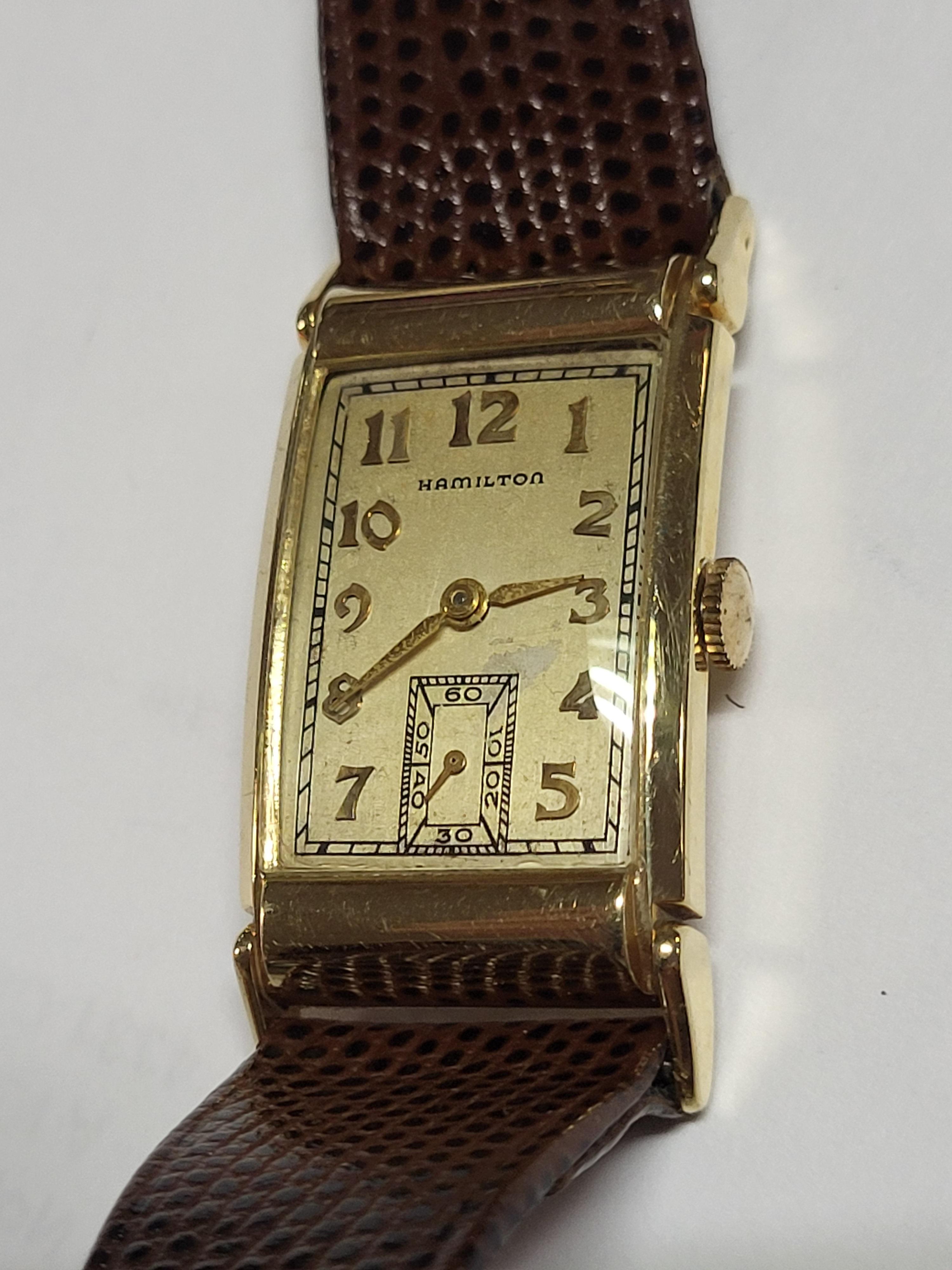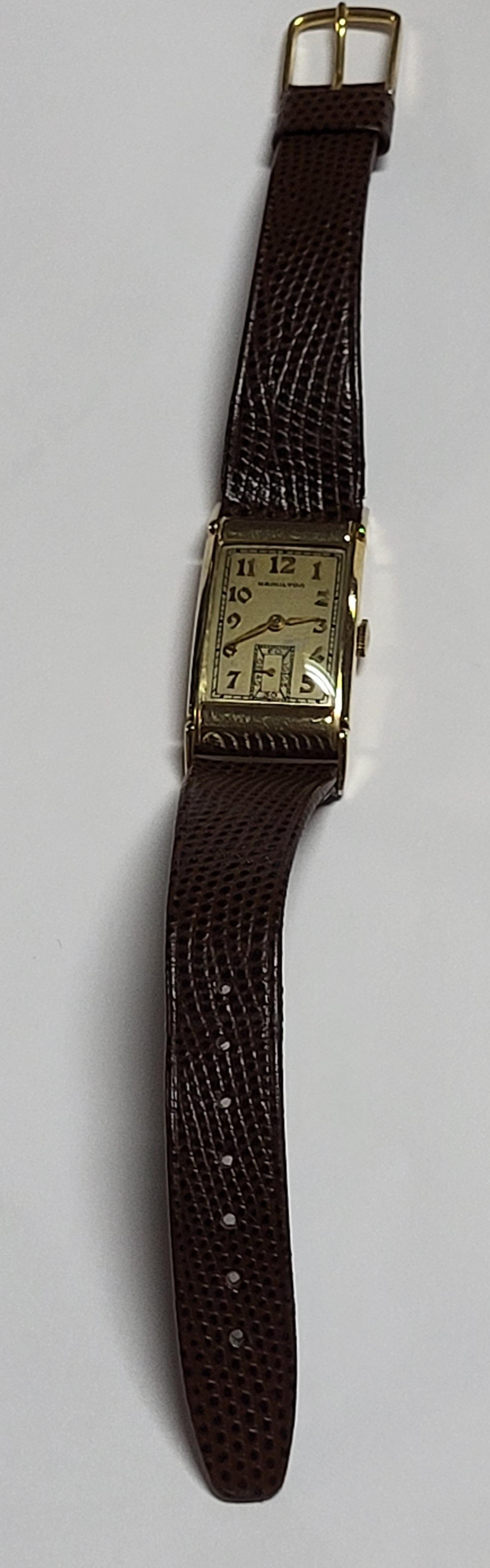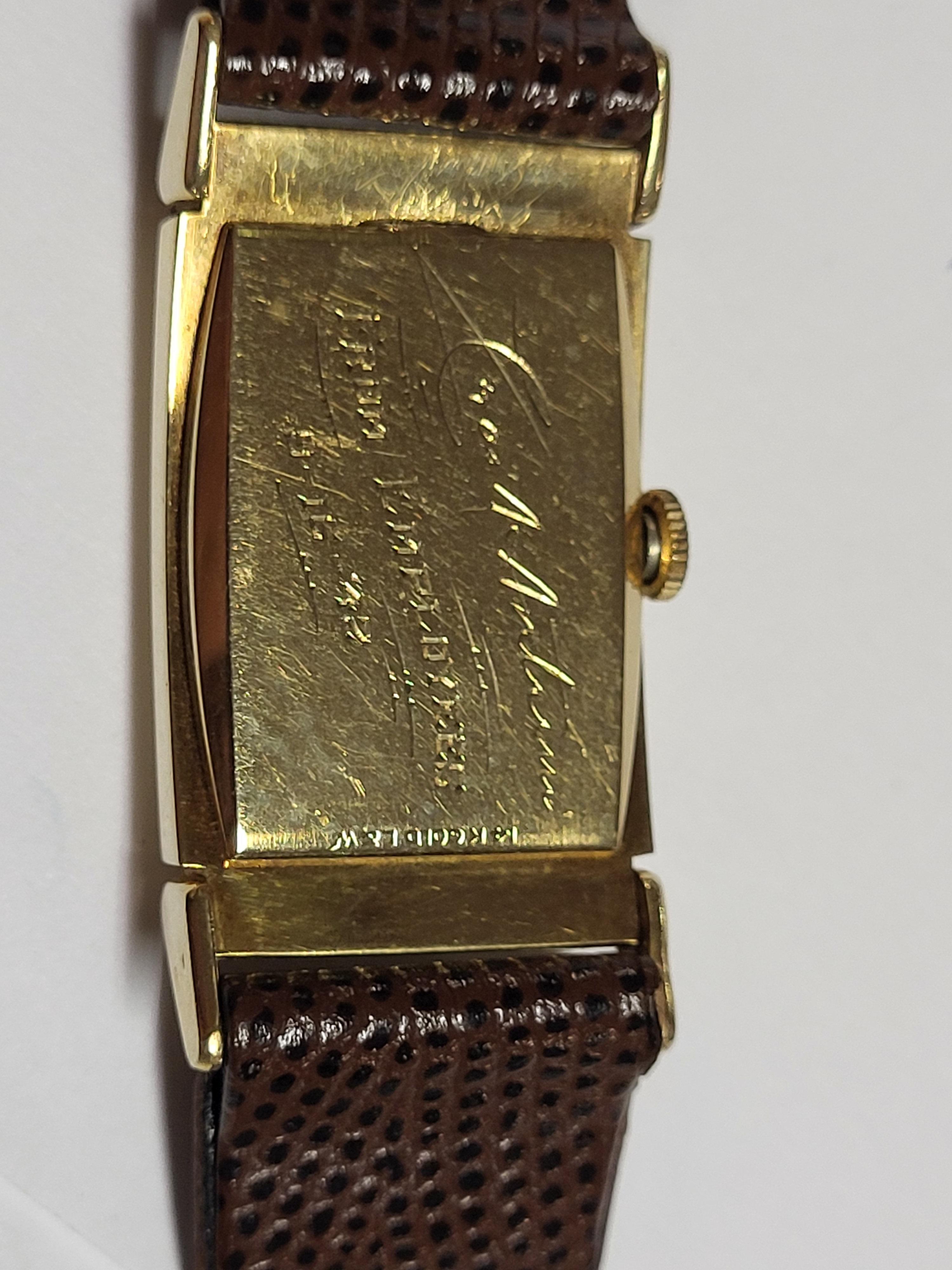 gorgeous unrestored example long tank 41mm x 20mm 14K silid yellow gold in exc. condition w/hirsch lizard band working 1 3/4 x 7/8 gorgeous estate watch ready to wear 9″ leather band see pics please note: item will be required to be paid with wire bank transfer or cash only! no credit cards accepted
