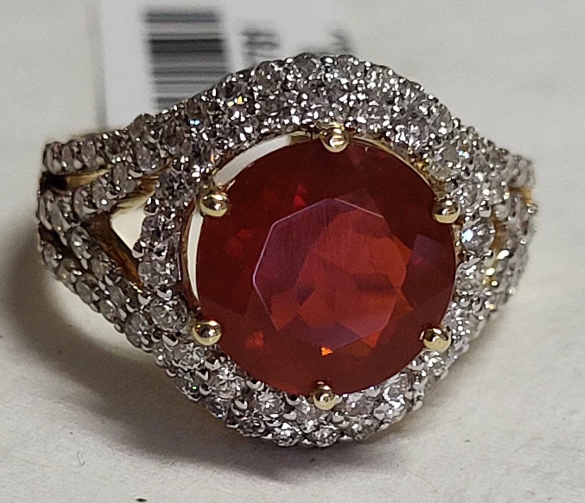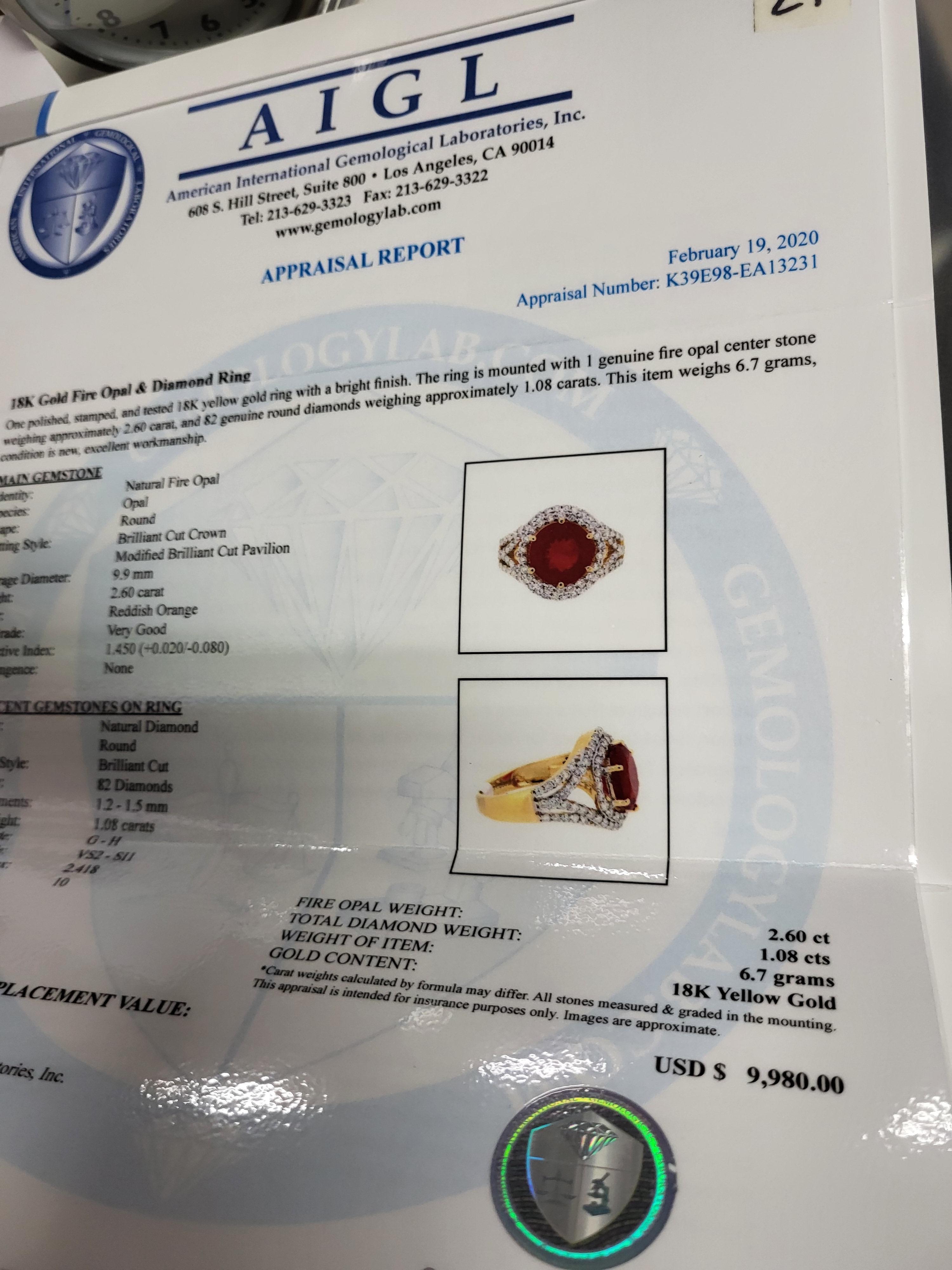 18K gold Diamond, Fire Opal Ring W/Appraisal $9980.00 18K yellow gold setting with natural fire opal 2.6 carats surrounded by 82 diamonds sz 7 1/4 appraisal $9980.00 see pics Please Read item to be paid by wire or bank transfer or cash only! no cc accepted! winning bidder to call us for wire transfer info. item reserved K39E98 you can not pay online, and you can not pay thru invaluable, you have to call us directly and get the wire transfer from us. Condition: Please Read item to be paid by wire or bank transfer or cash only! thru us, no cc accepted! winning bidder to call us for wire transfer info. item reserved K39E98