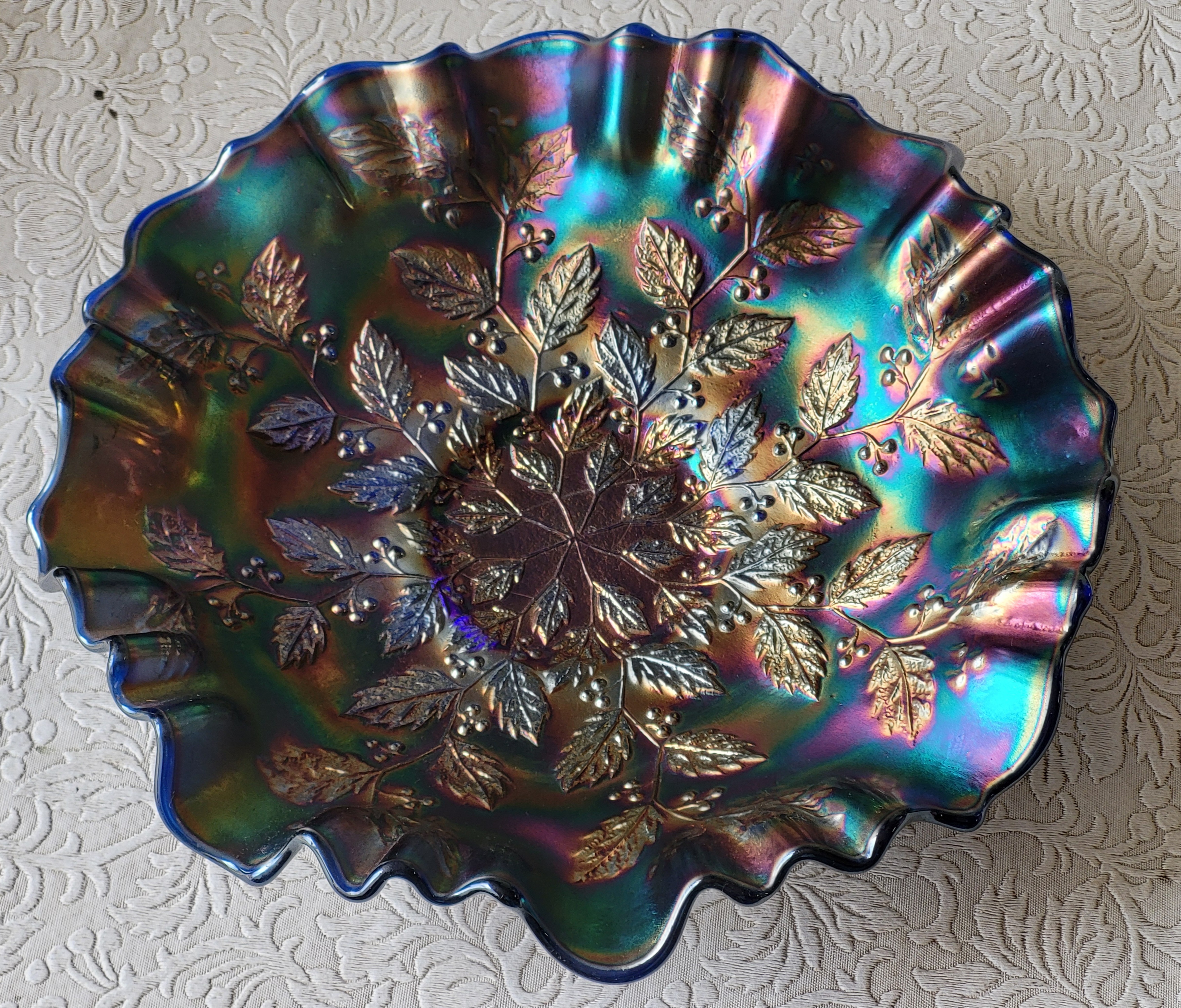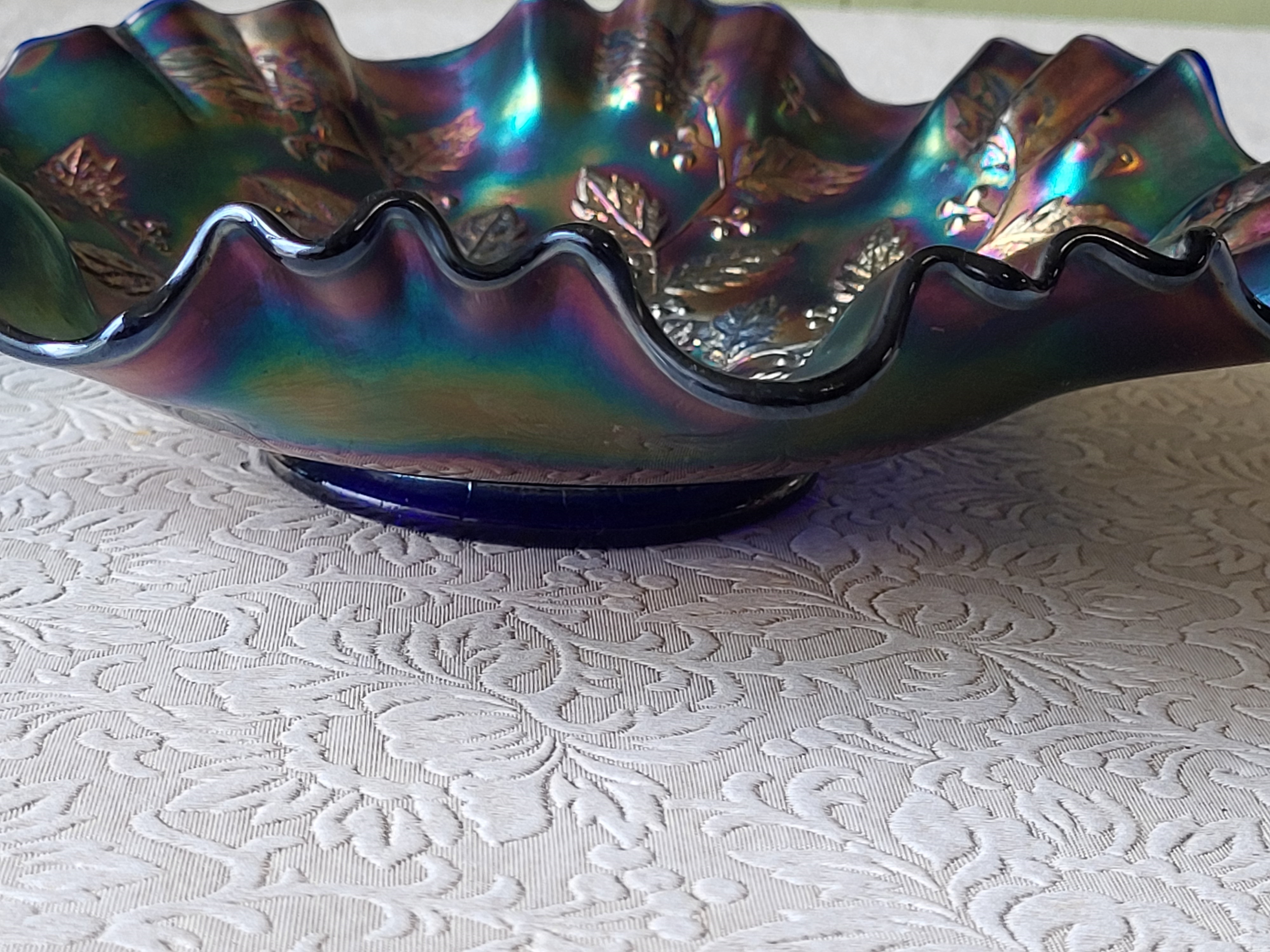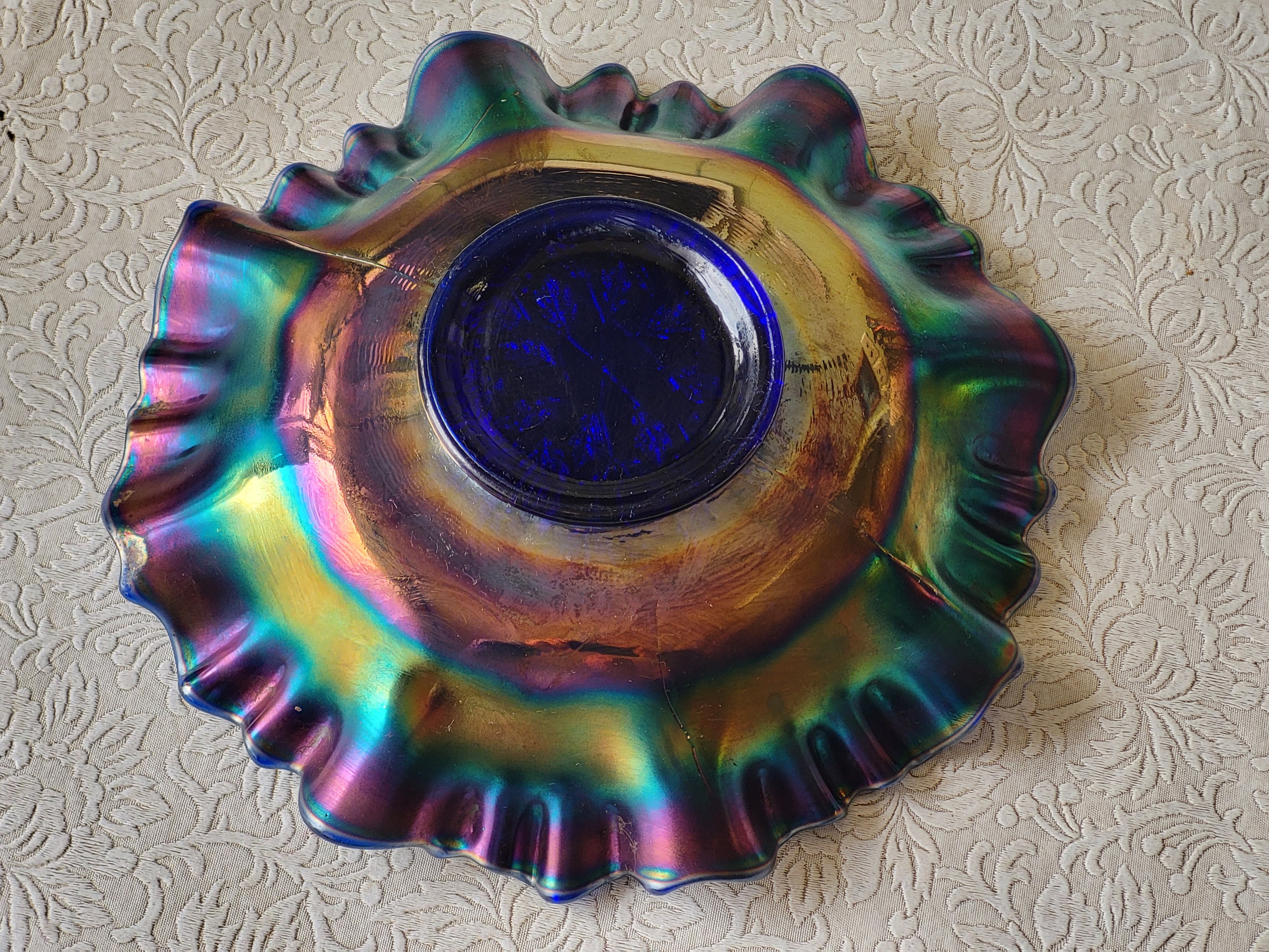 color in carnival glass is everything and this has it electric greens, blues, purple etc on cobalt base glass no chips see pics