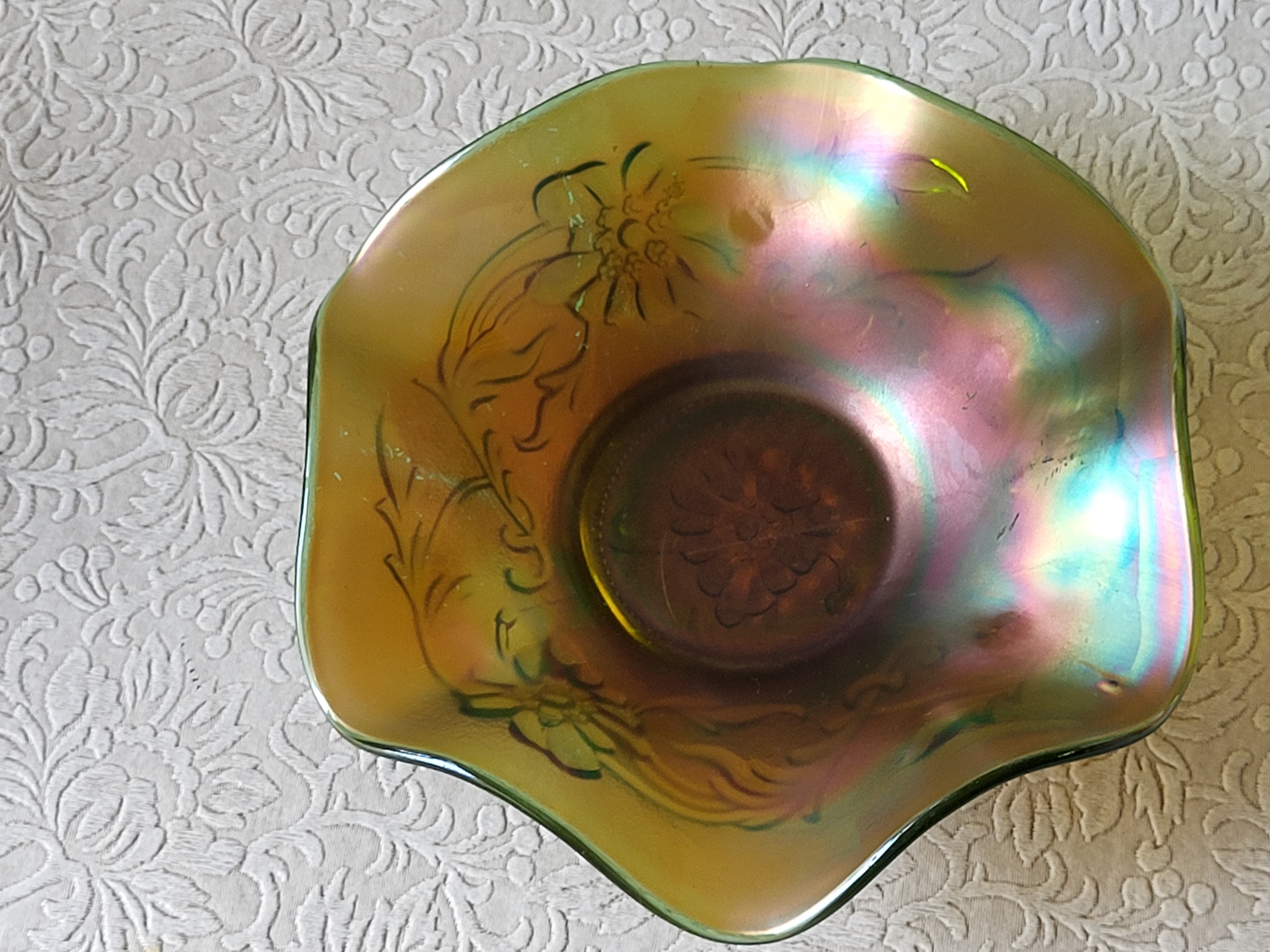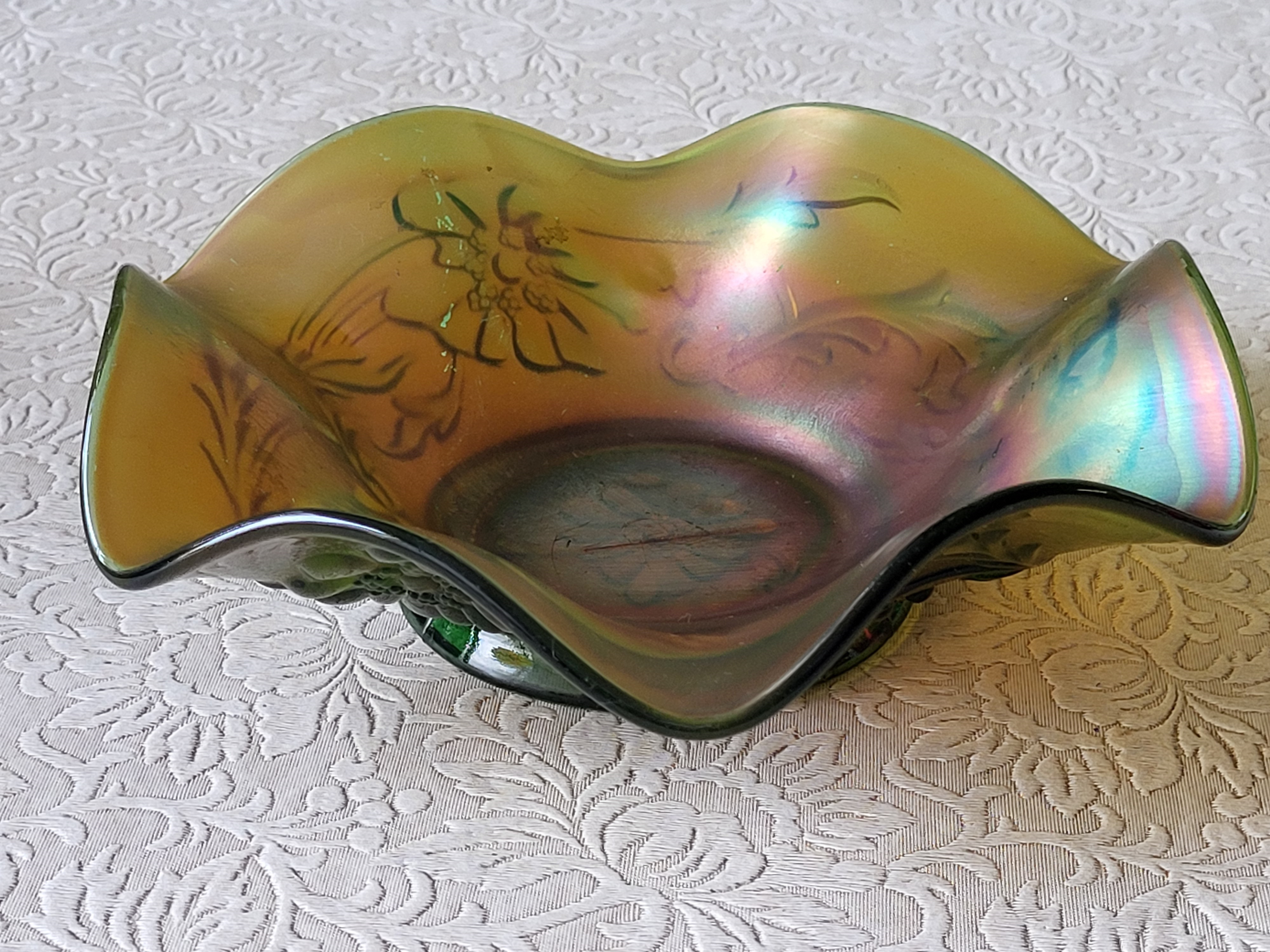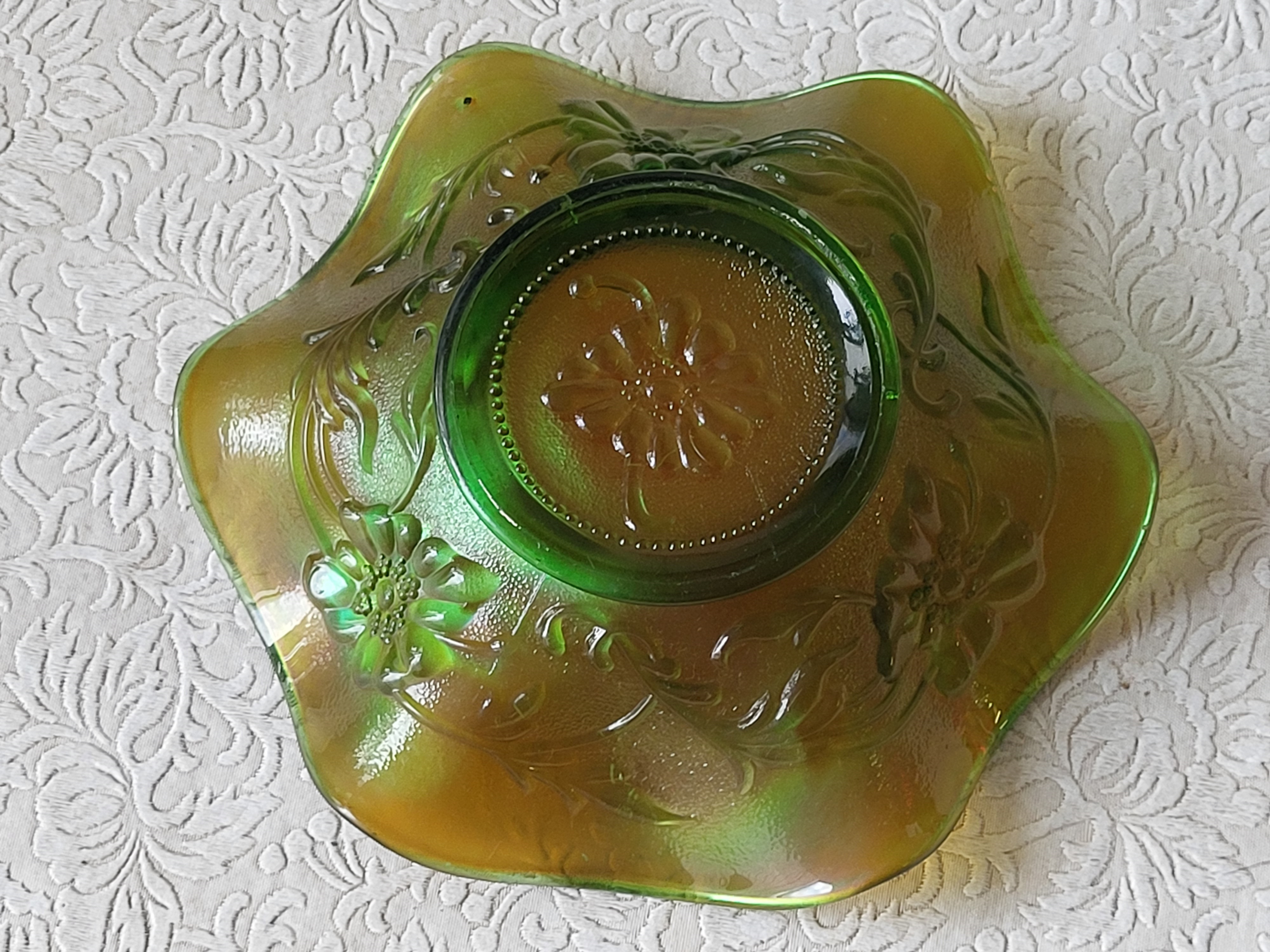 vtg apple green carnival glass ruffled dish green poppy