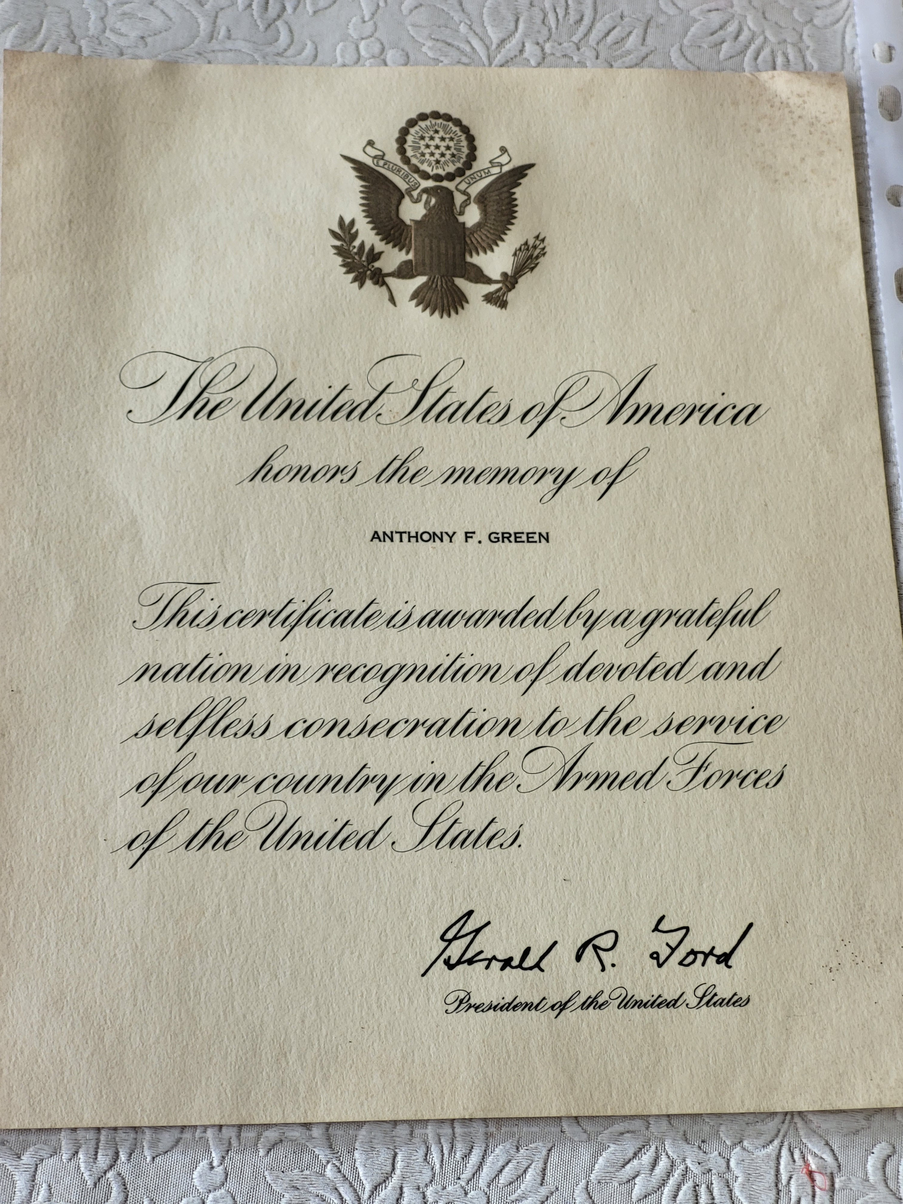armed forces award genuine signature and embossed paper see pics 8″ x 10″
