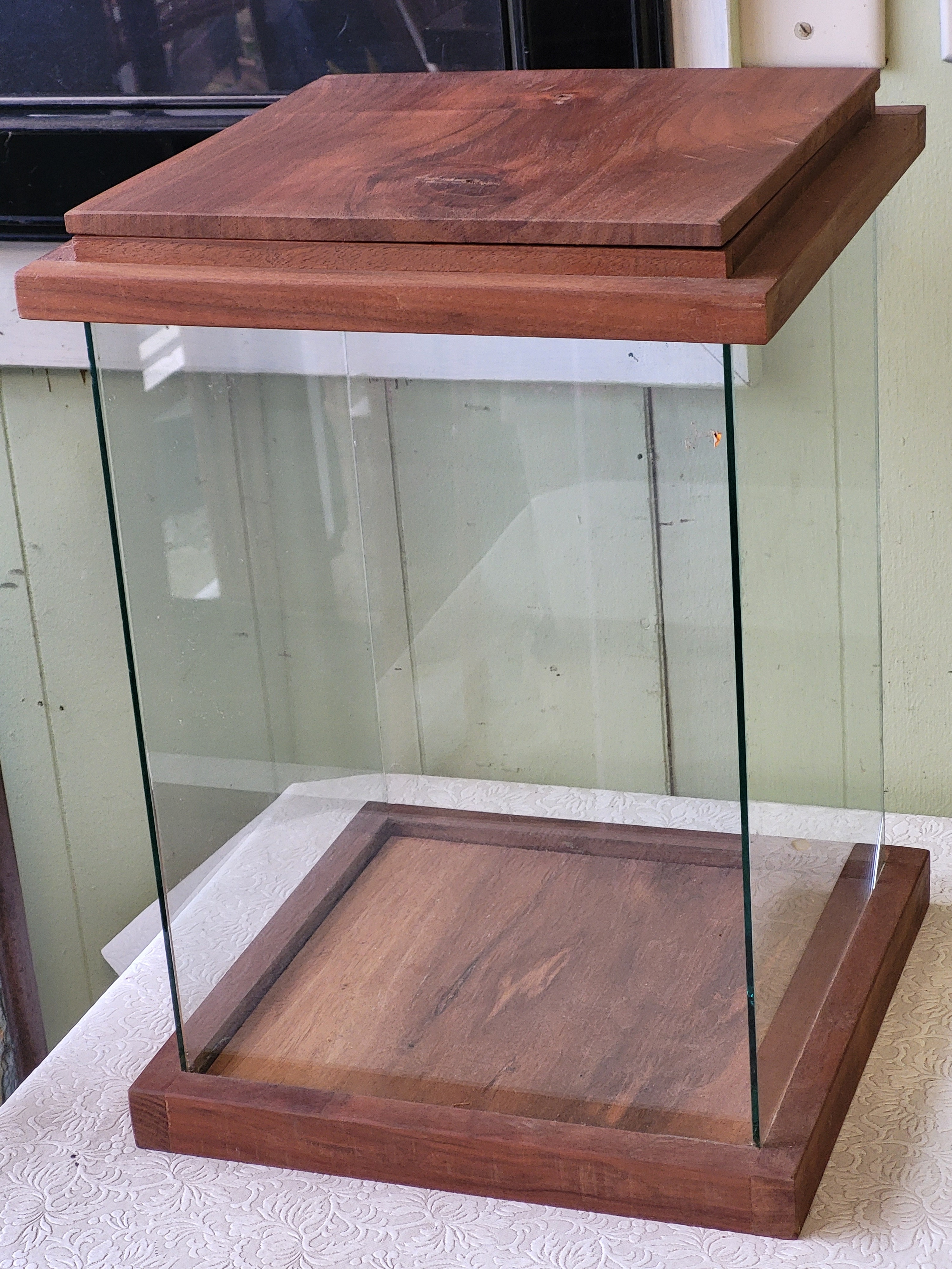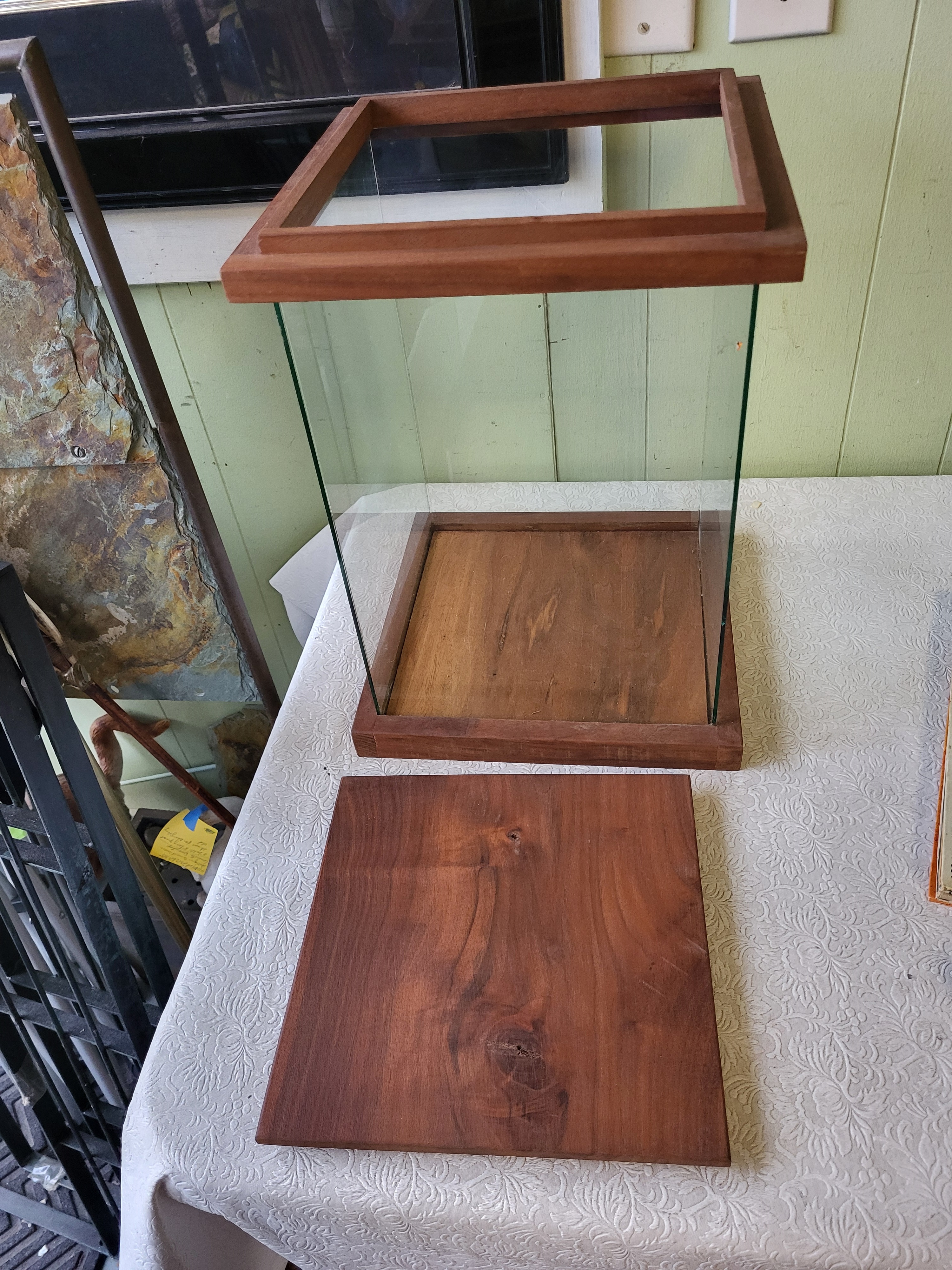 many great possible uses on this one , glass lid comes off to aces 17″ tall x 12″ x 12″ see pics for conditon