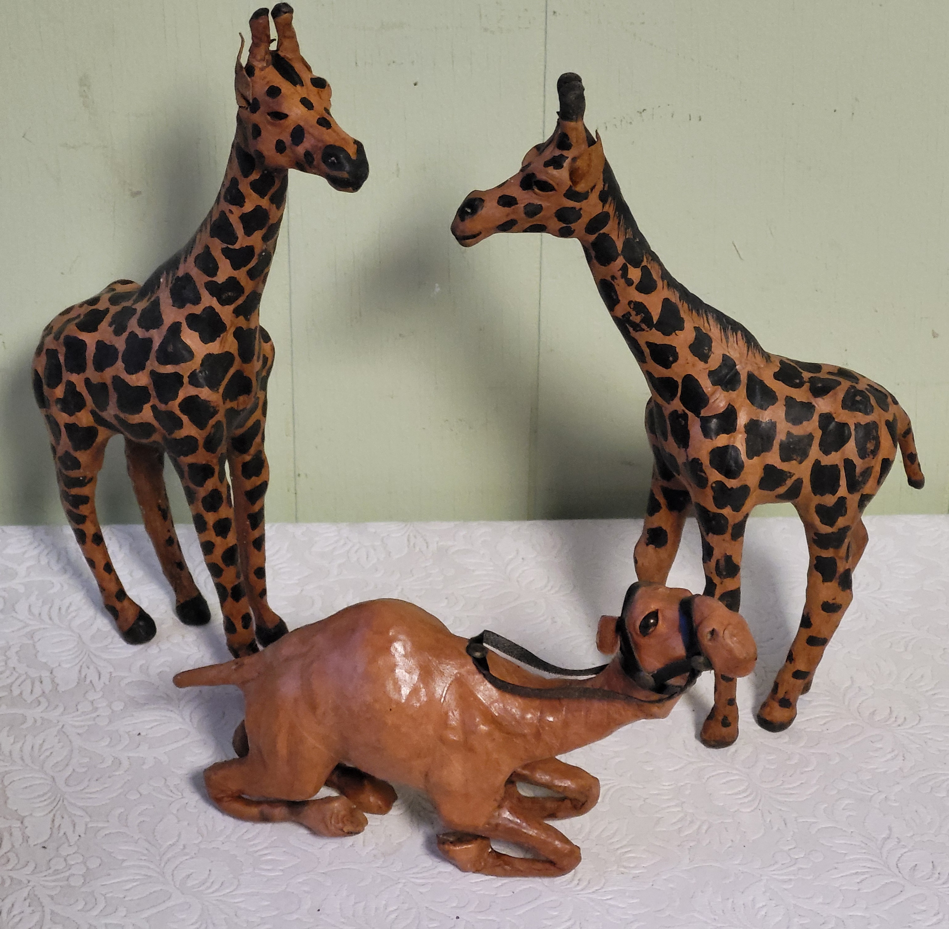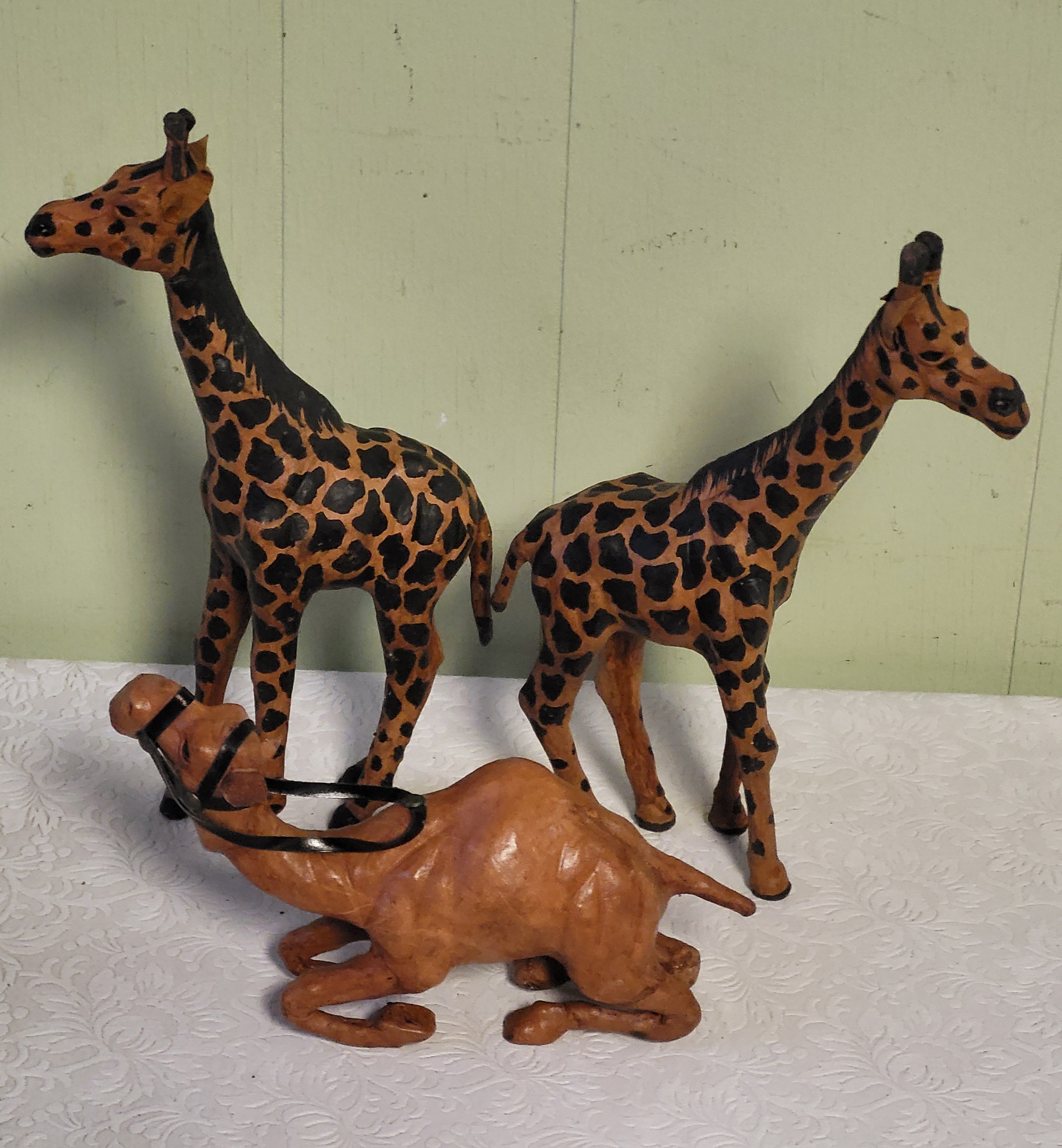 from estate collection very nice 11″ tall giraffes and 5″ leather camel all 3 forone bid see pics