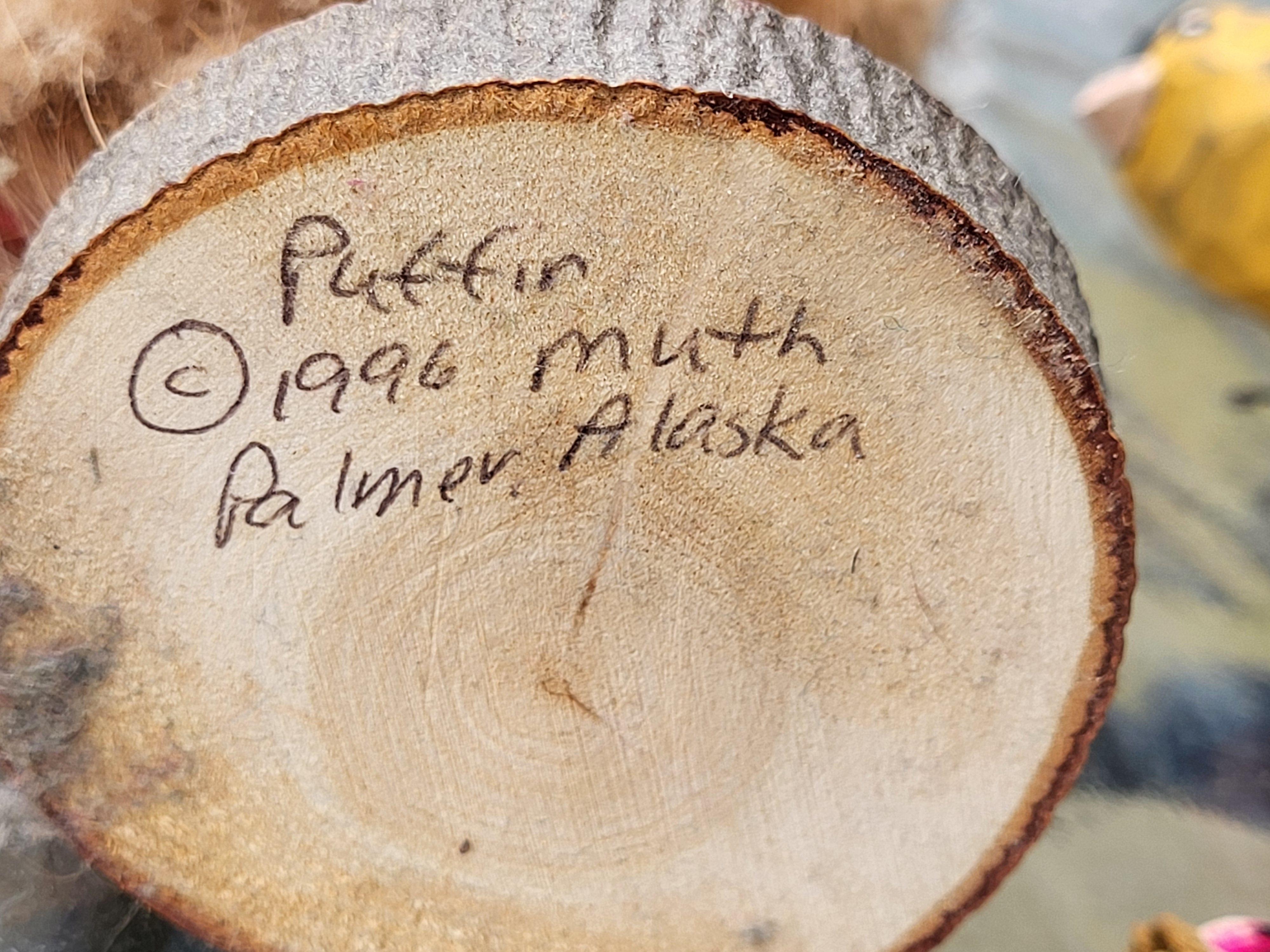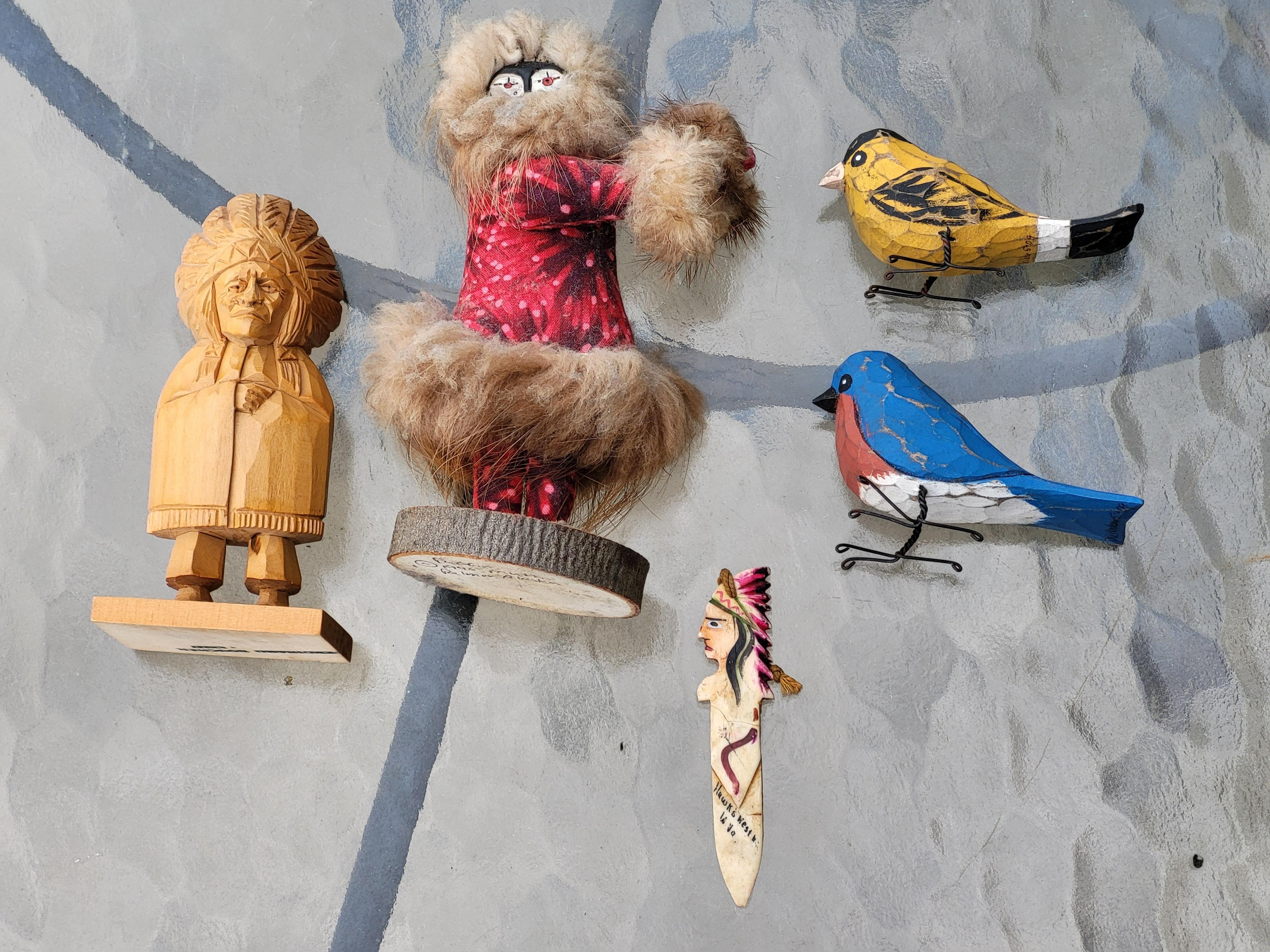 from estate carved lot of 2 carved birds, carved indian ferdinand boucher, puffing by muth 1996 palmer alaska and bone carved letter opened all 5pcs forone bid see pic
