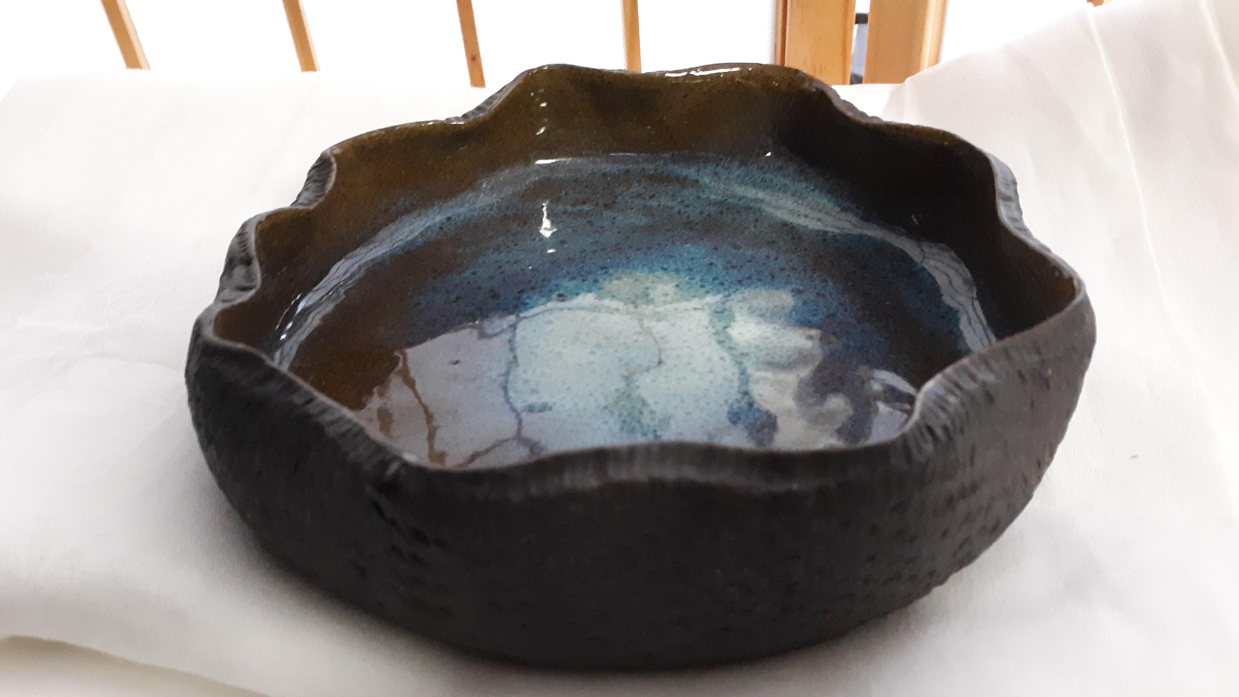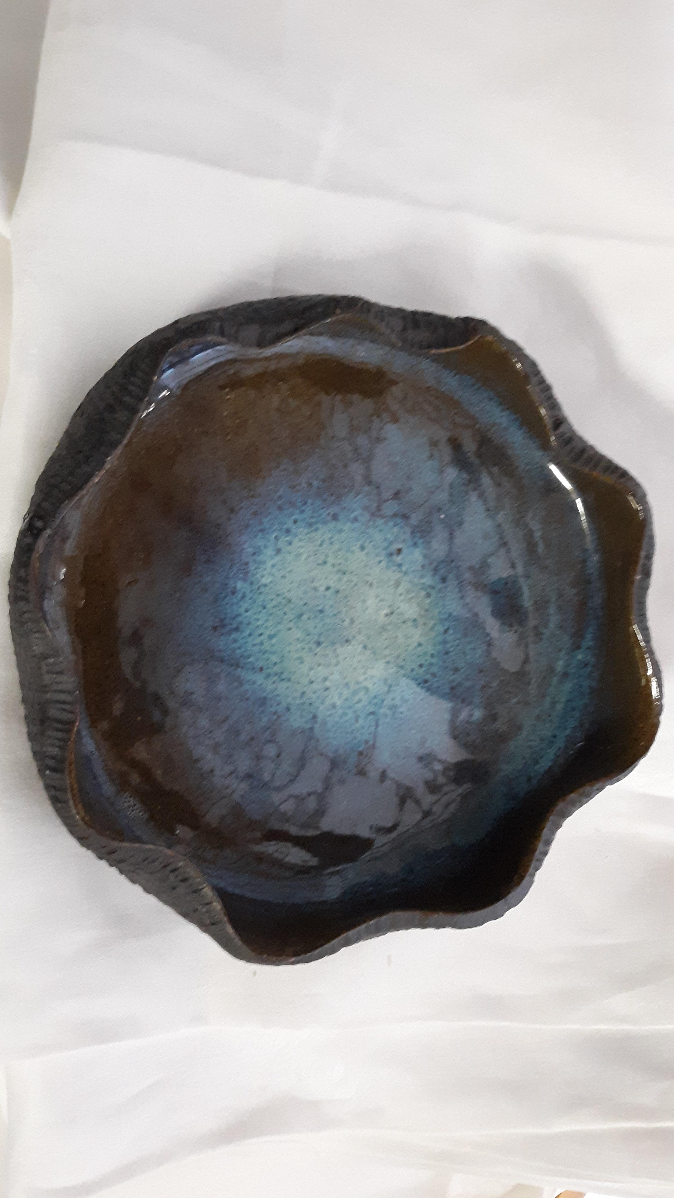 mid century style hand made pottery crimped edge drip glaze low bowl beautiful love the colors on this one 8″ wide appx 2 1/2″ tall no makers mark see pics