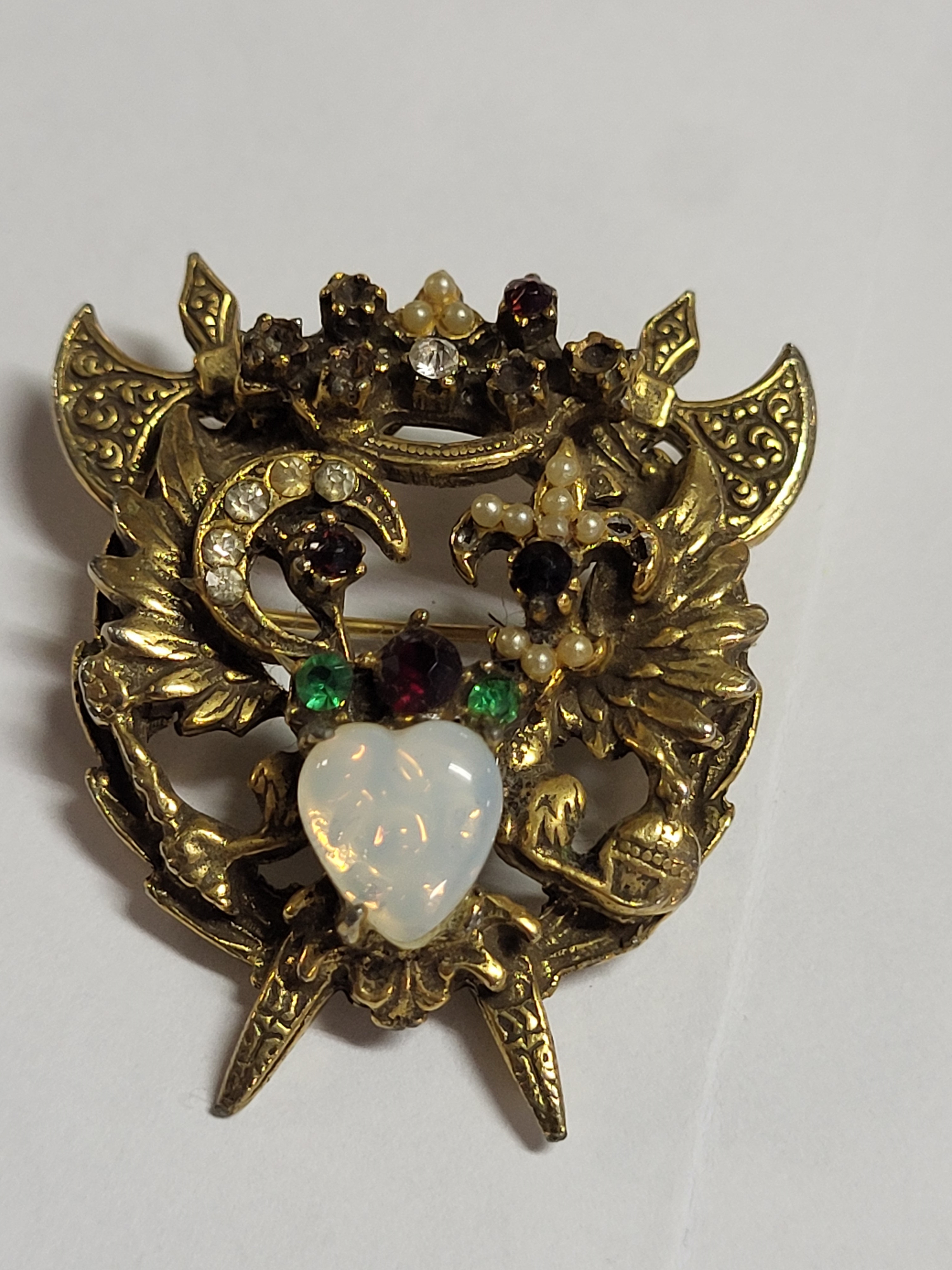 vtg heraldic rhinestone fleur de lis crescent brooch pin