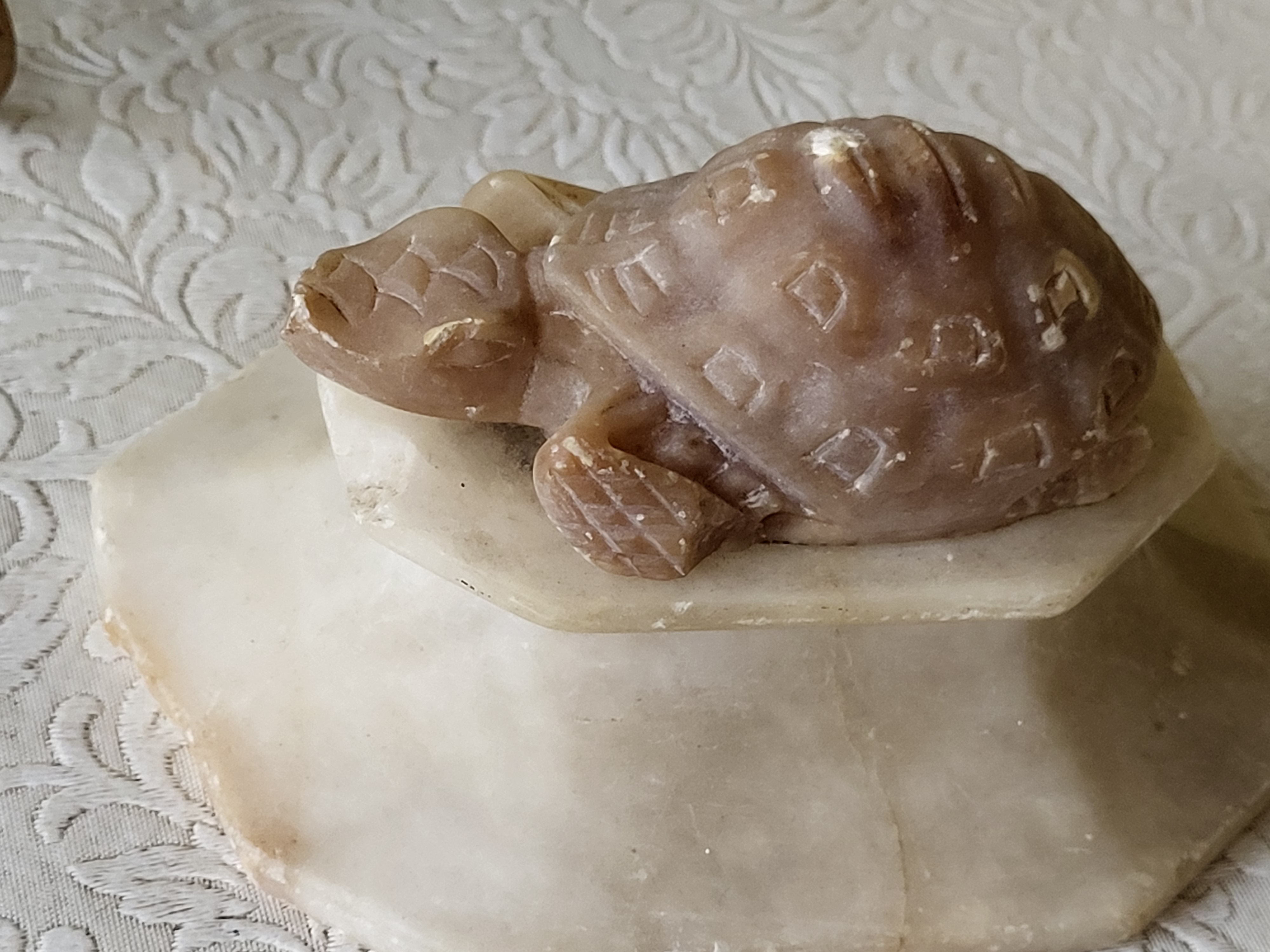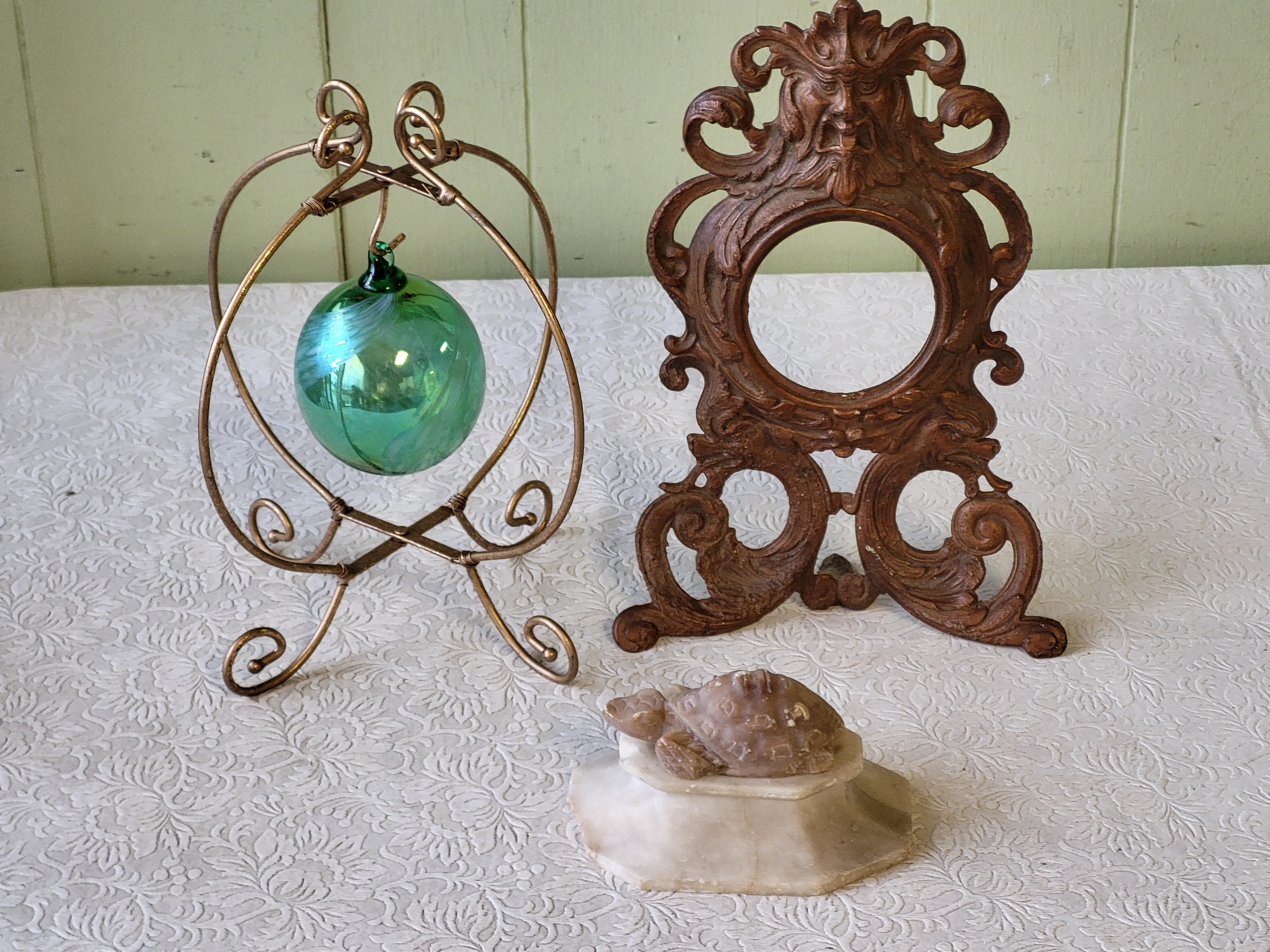 estate lot antique marble turtle, antique metal clock frame and Watch stand