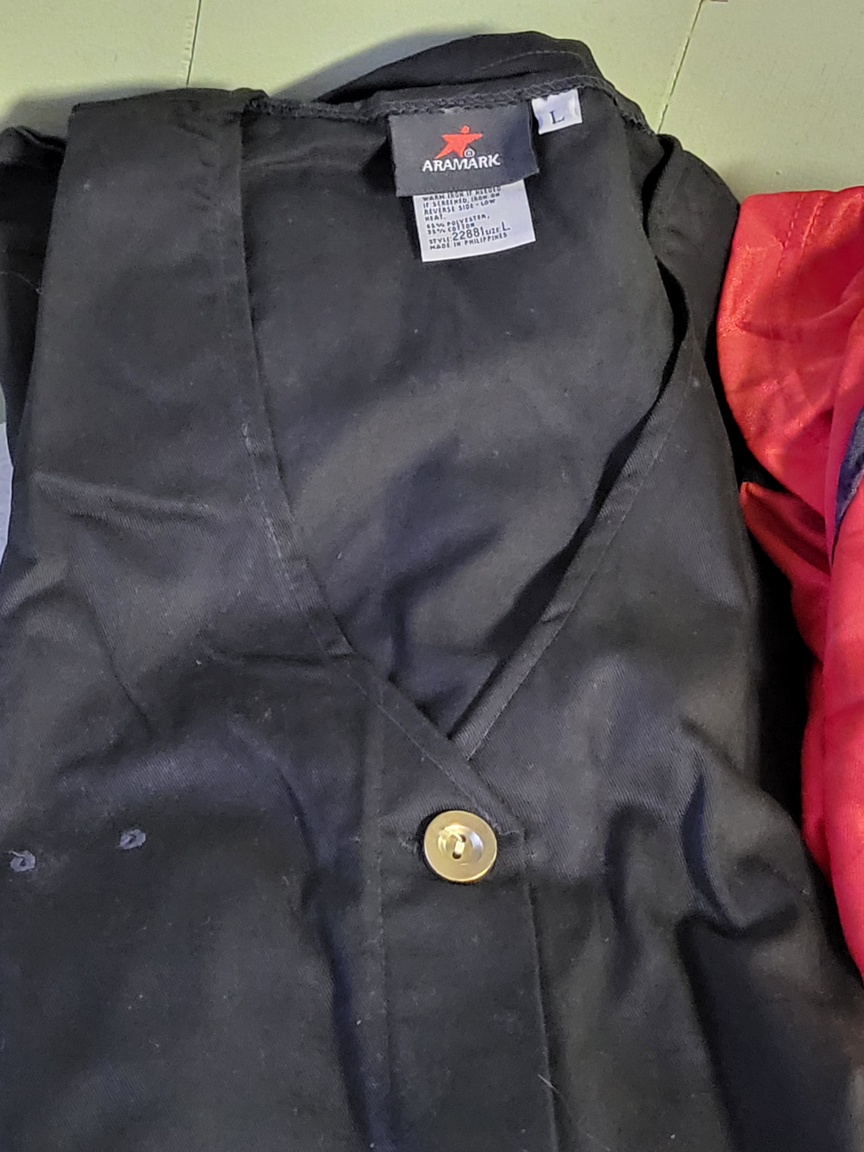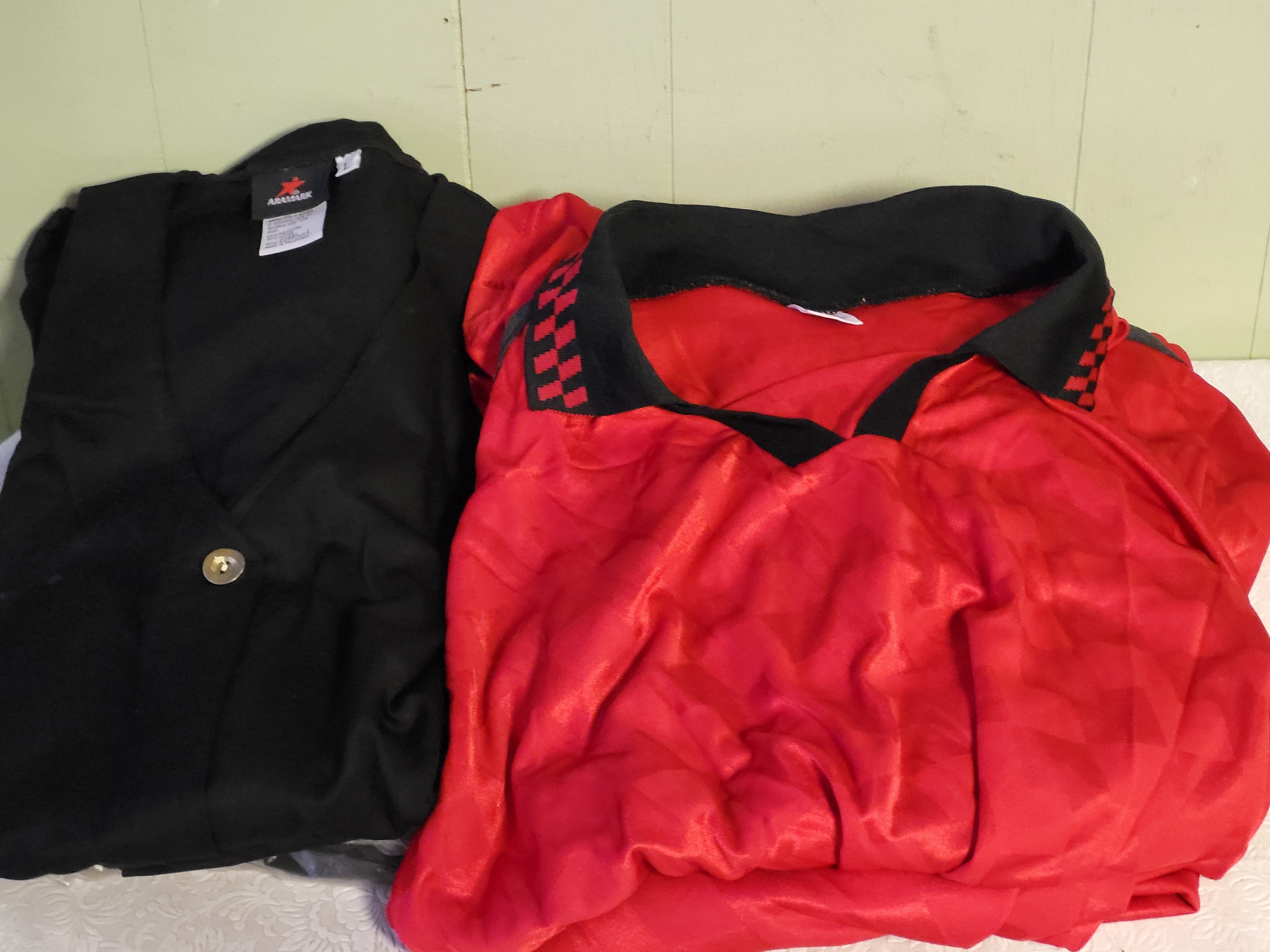 9 pcs total 3 hospitality vests new, and 6 new short sleeve red & black Russell shirts all 9 pcs for one bid see pics