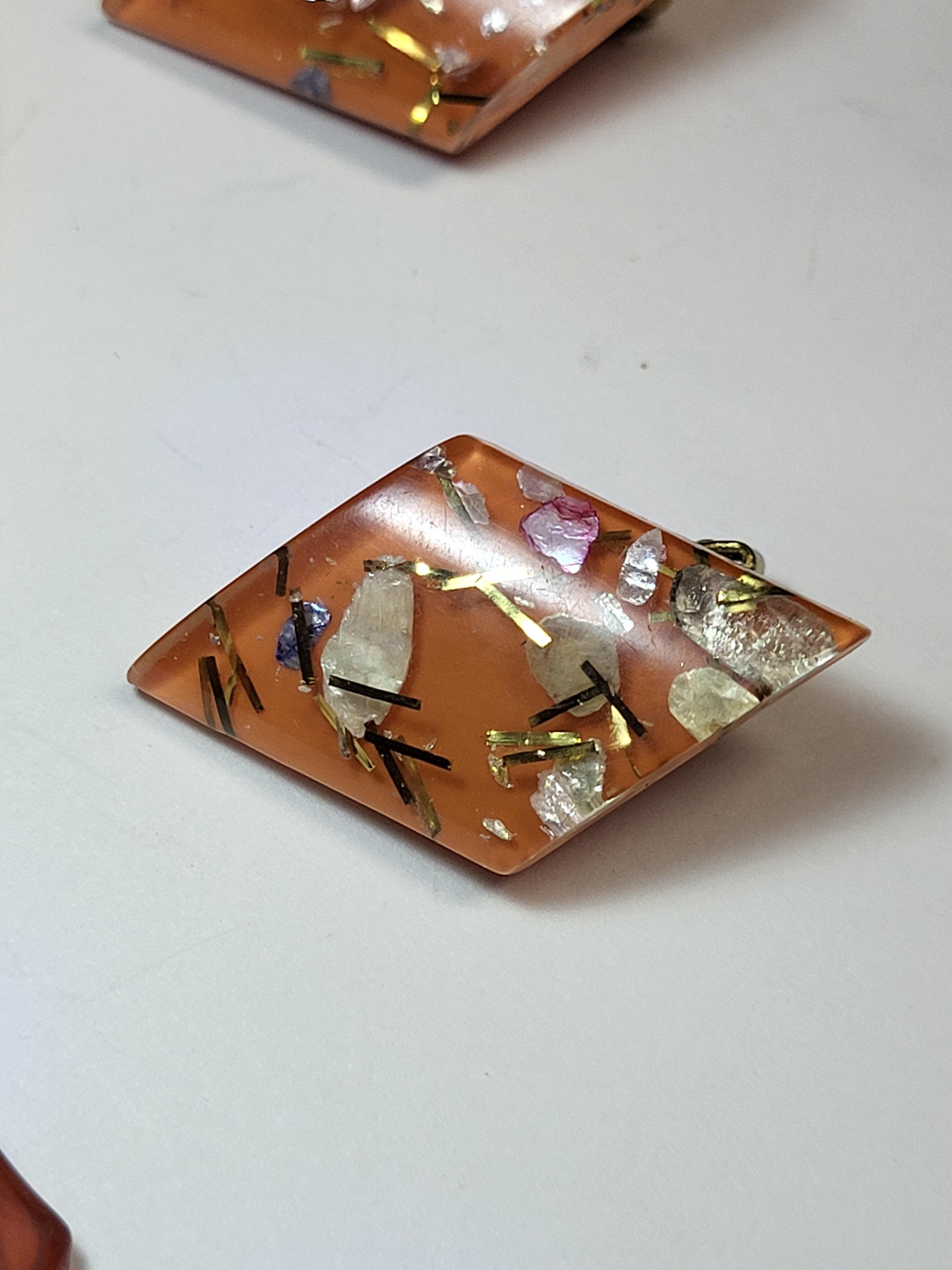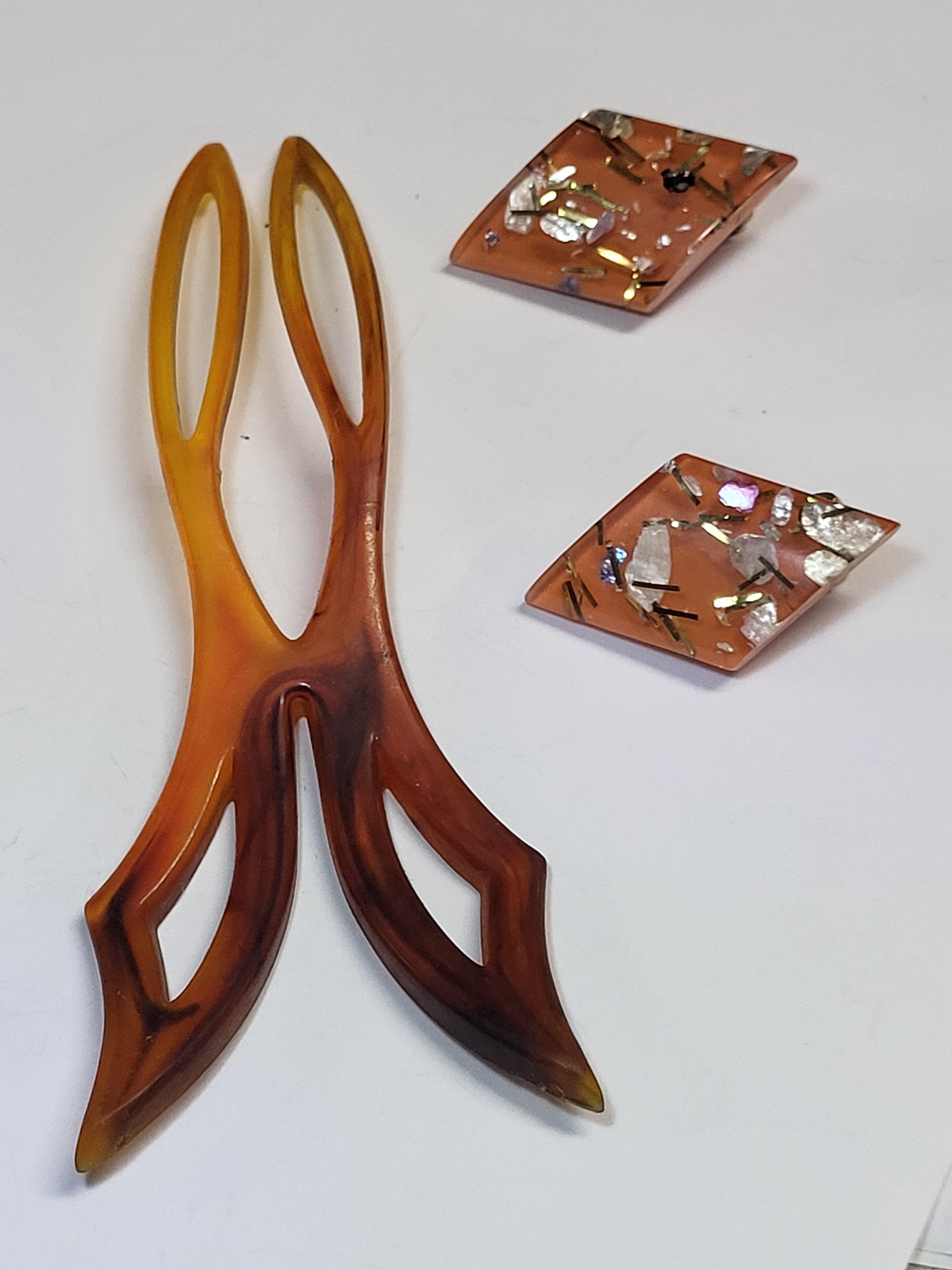 1900’s French faux tortoise hair comb and magnificent pamoli attributed confetti lucite clip earrings all in great all 3 for one bid see pics