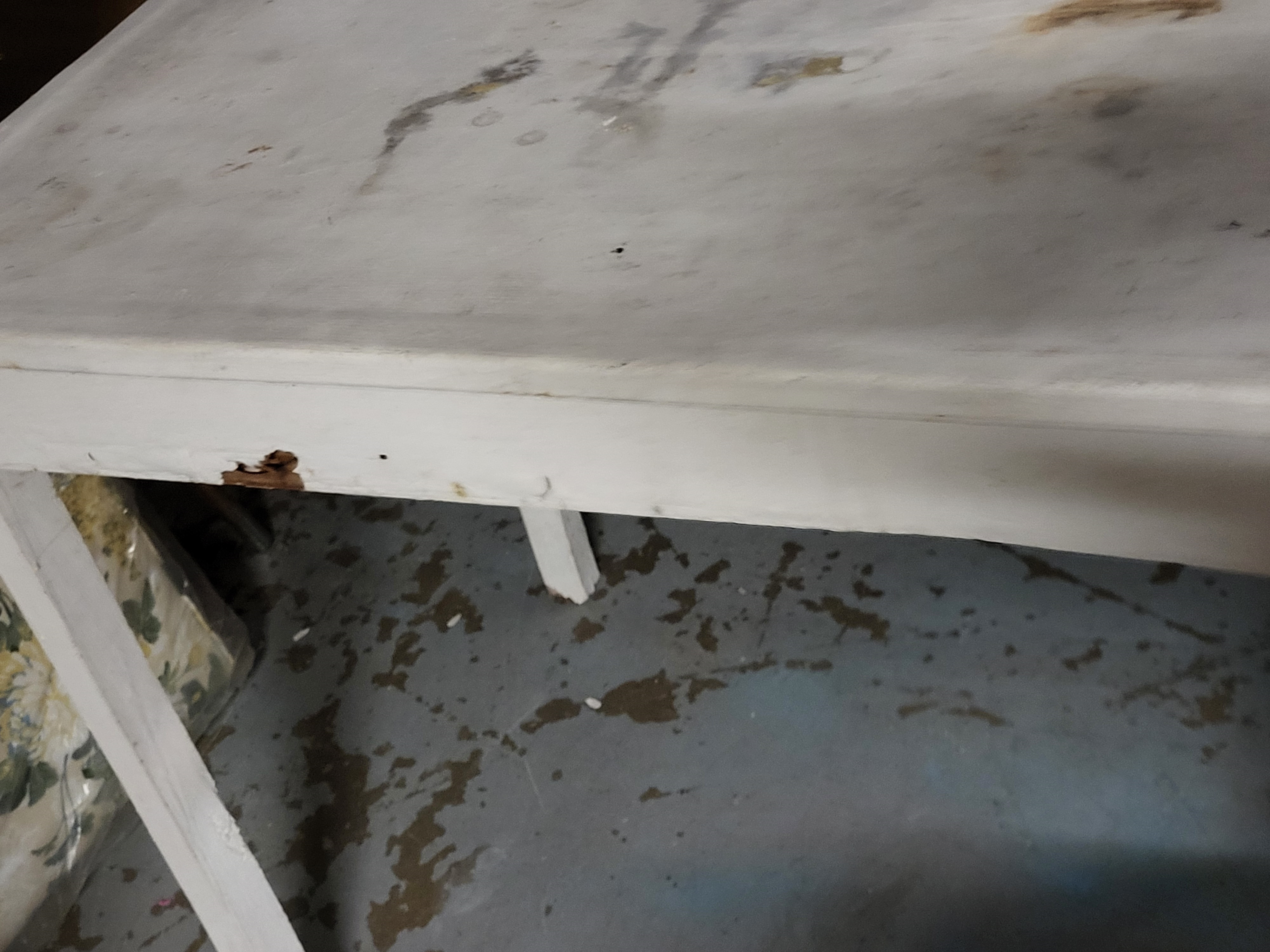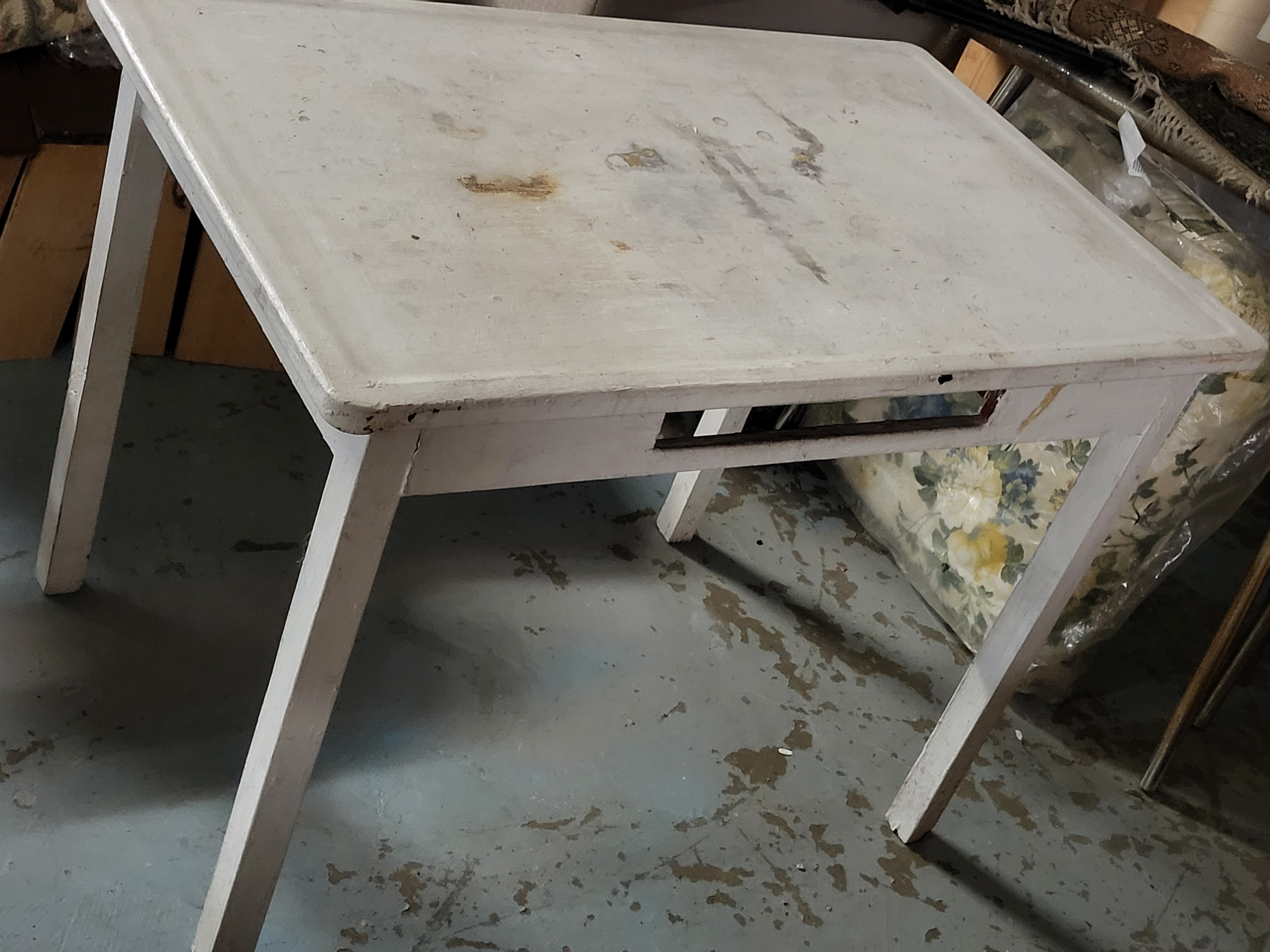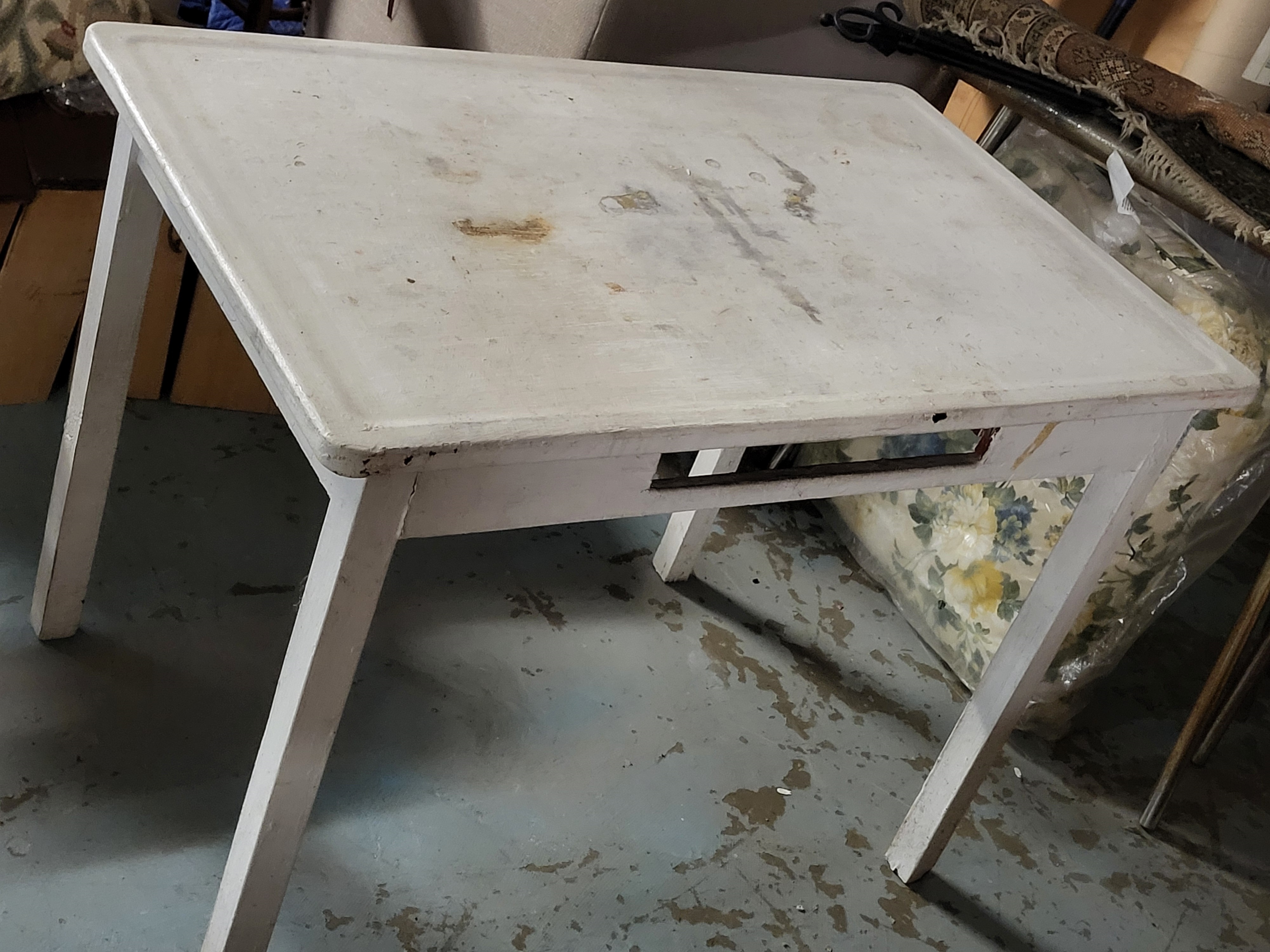 from estate has been painted all white has original enameled metal top under the white paint, 28 1/2″ tall x 40″ wide x 25″ deep no drawer see pics