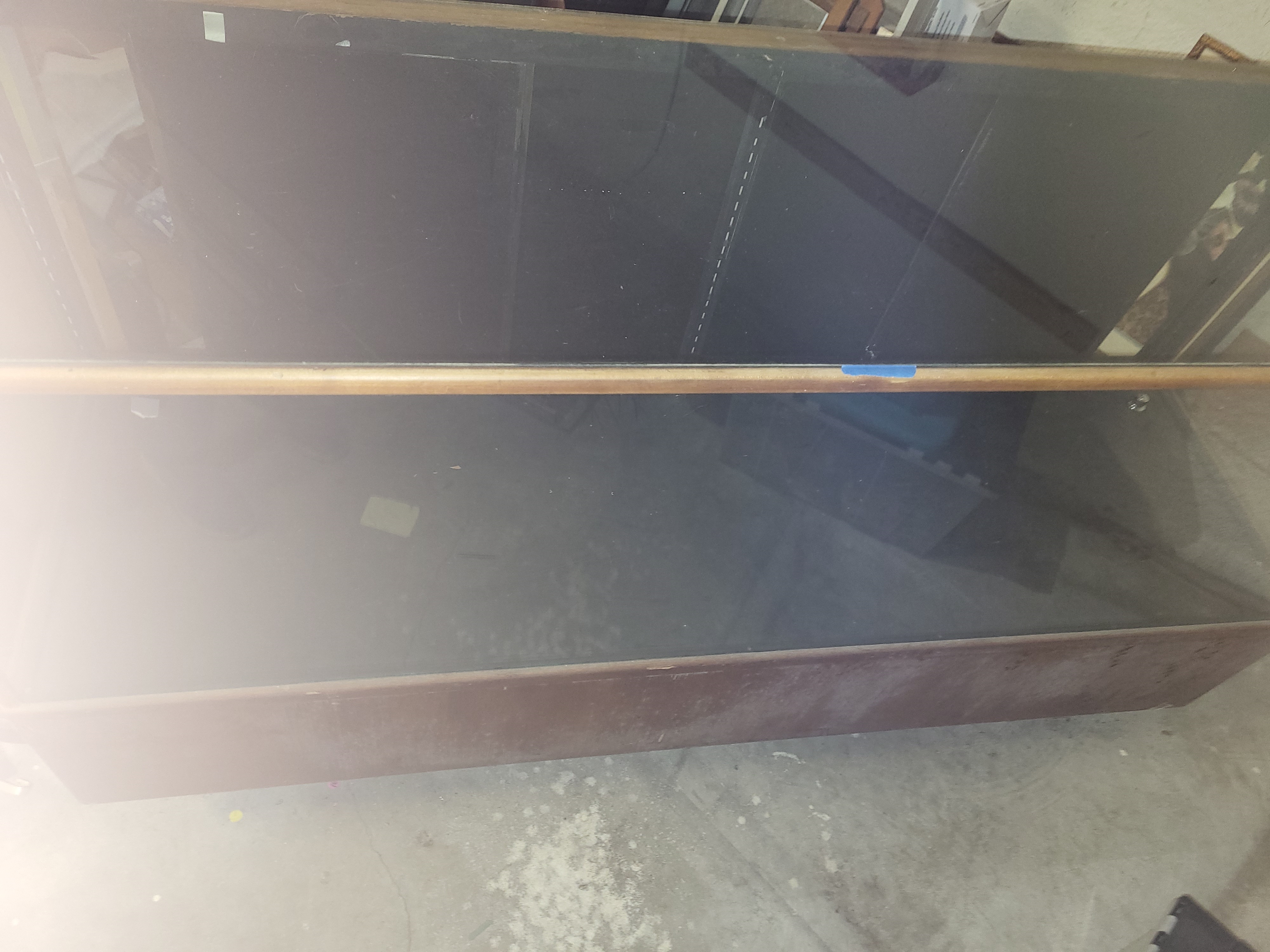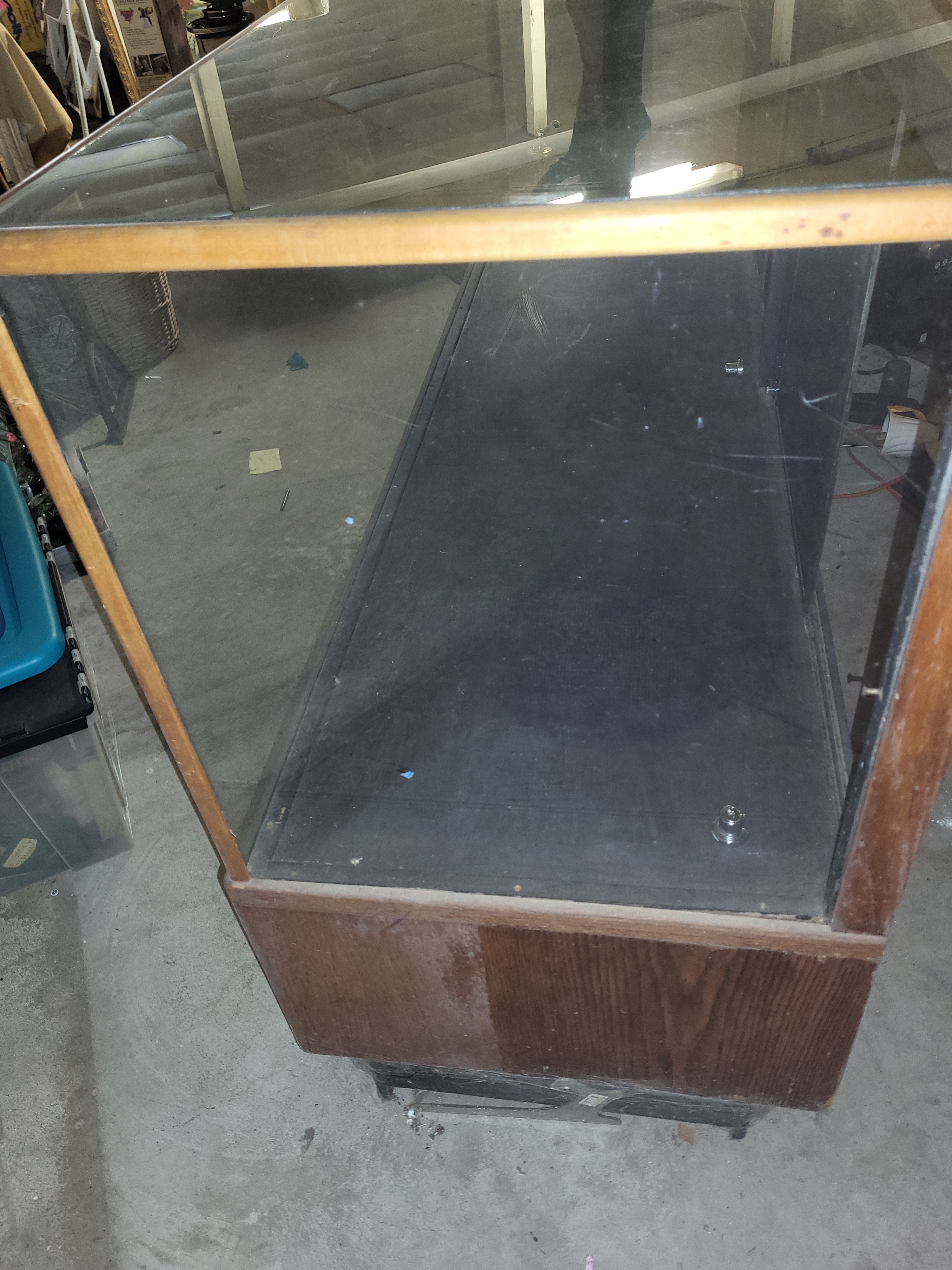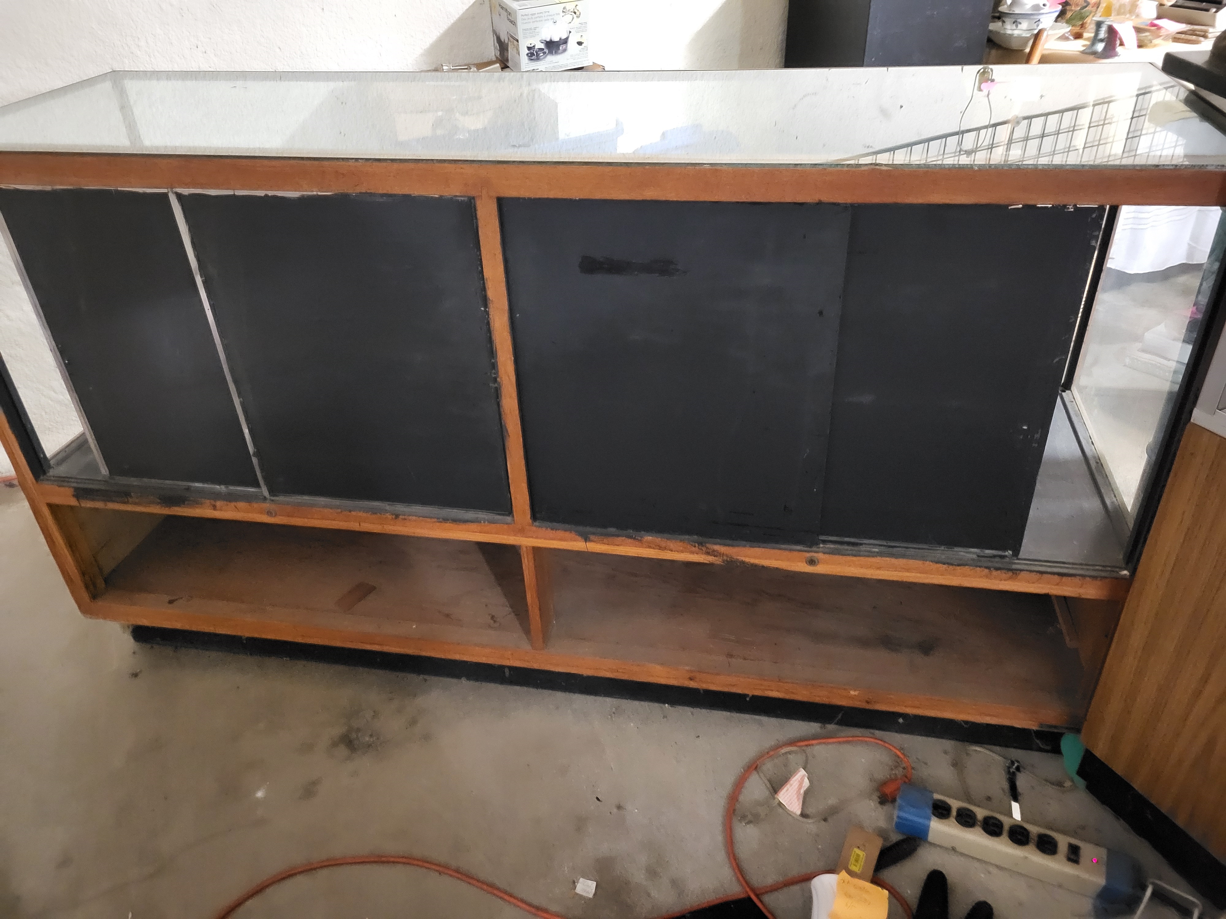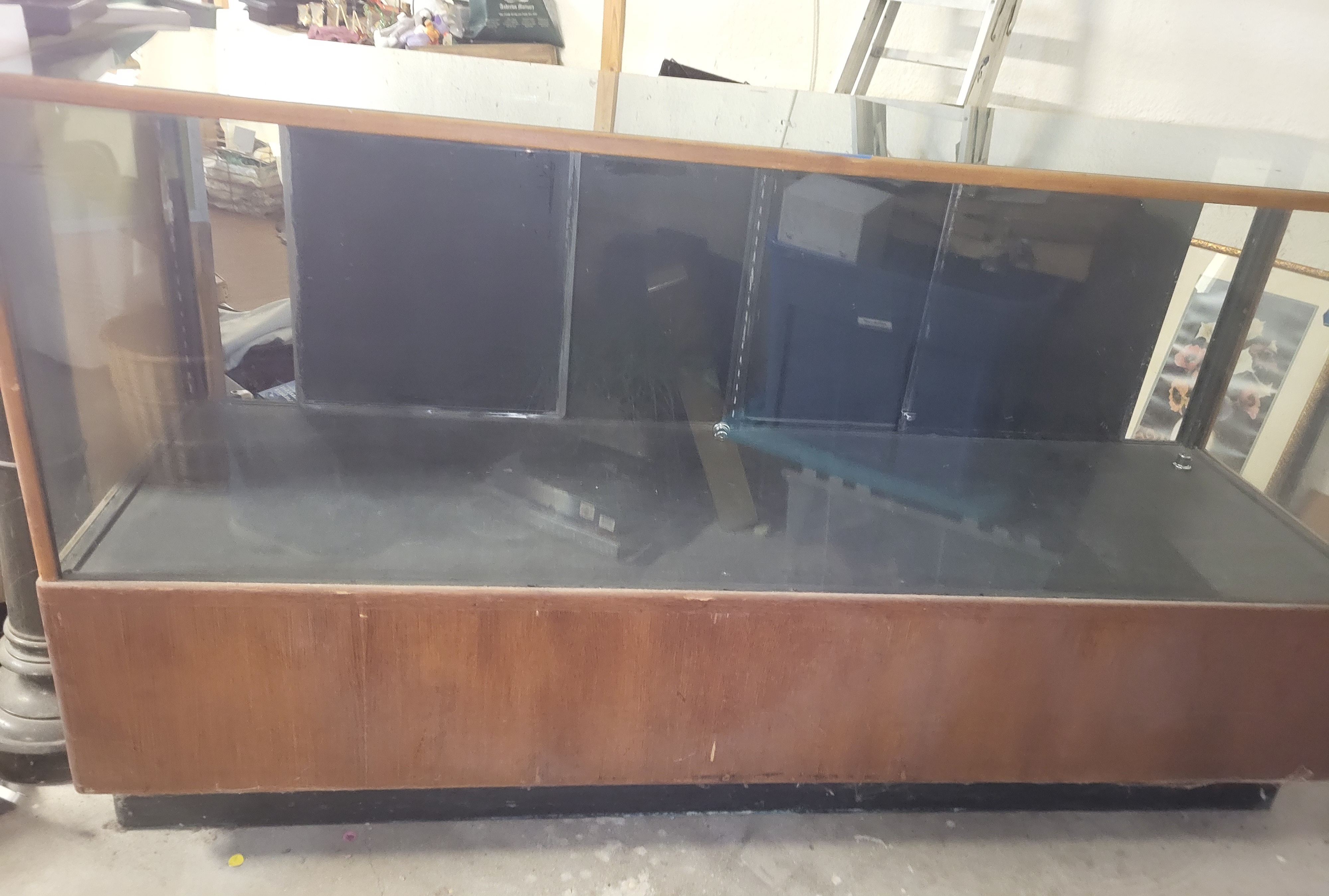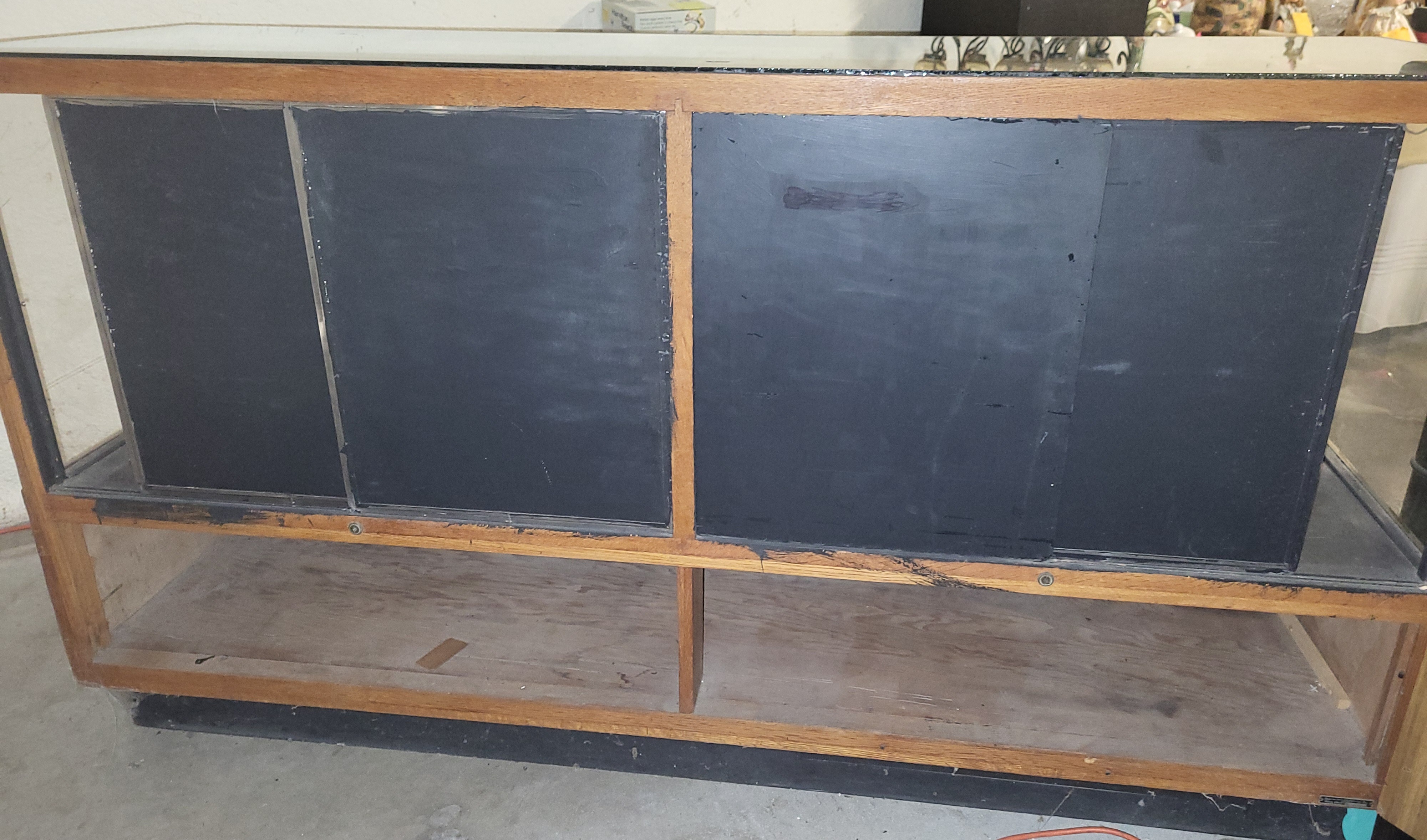 40″ tall x 72″ wide x 22″ deep side glass is plexiglass nice Antique Oak! see pics for conditon has has four sliding doors on each side also a shelf bottom see pic