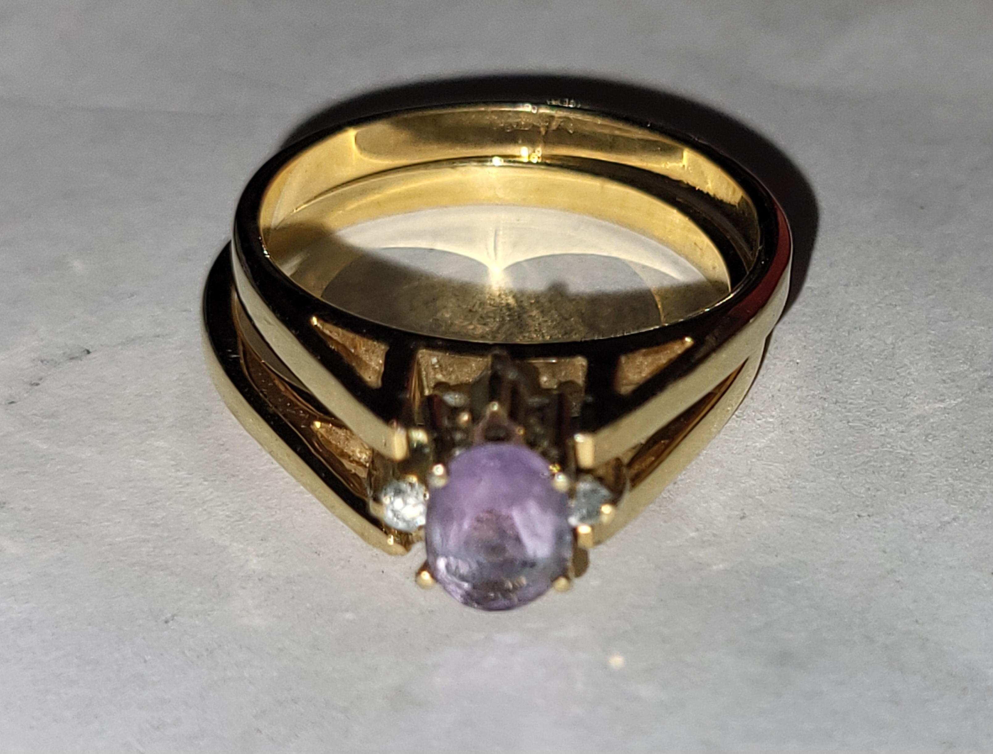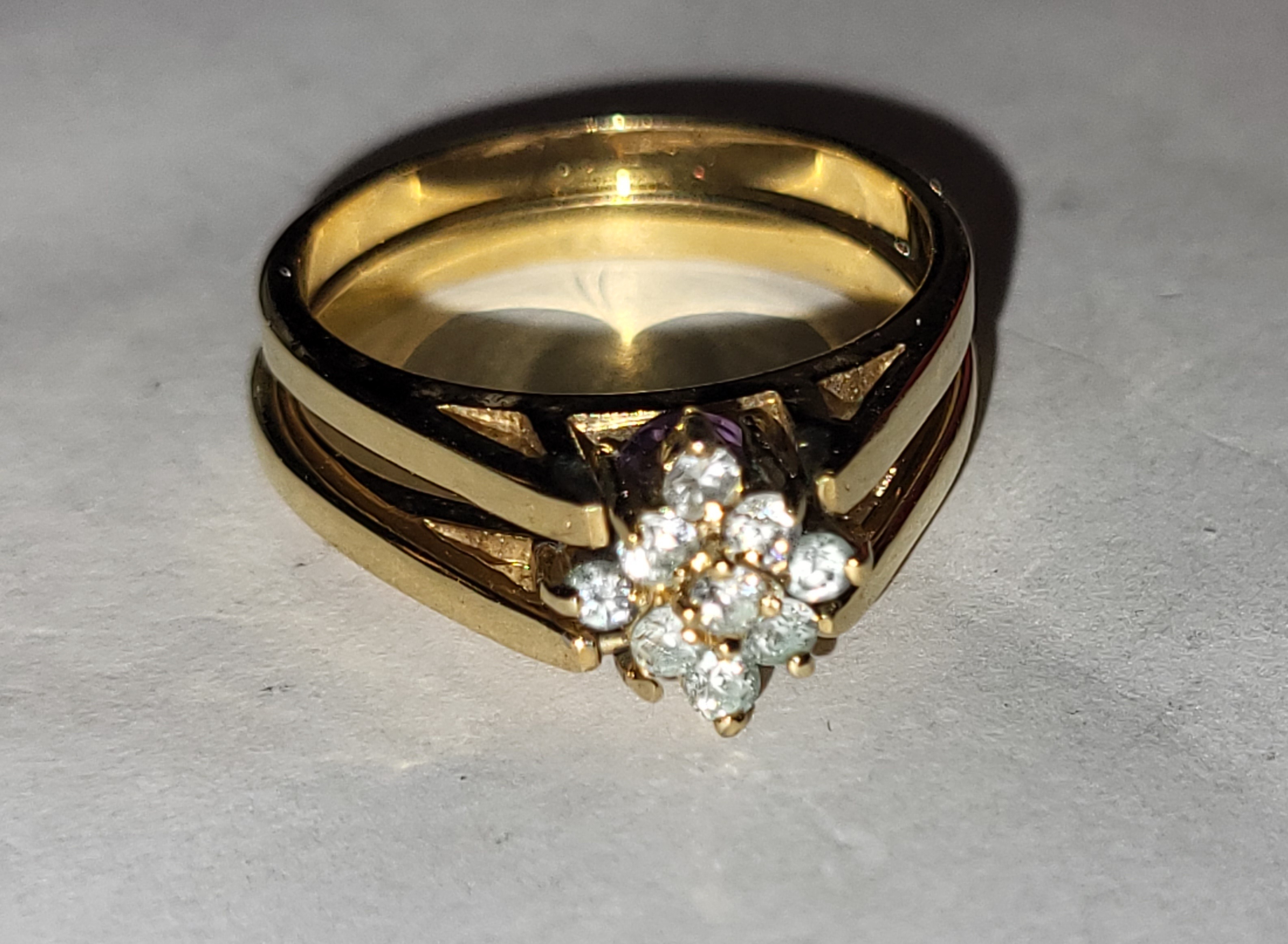 size 9 1/2 very pretty rotates one way has all cz’s other way is amethyst and cz’s very clean see pics