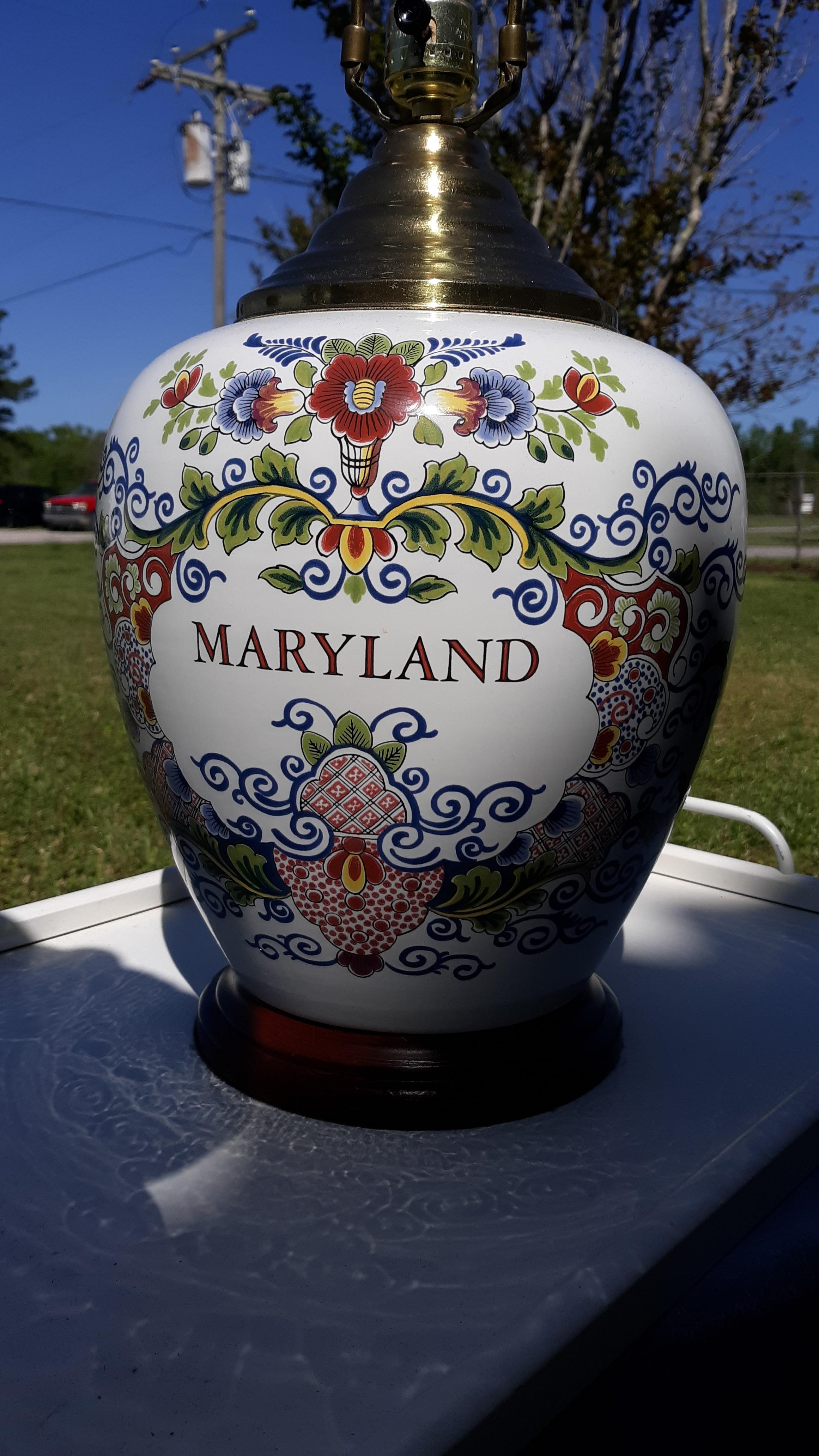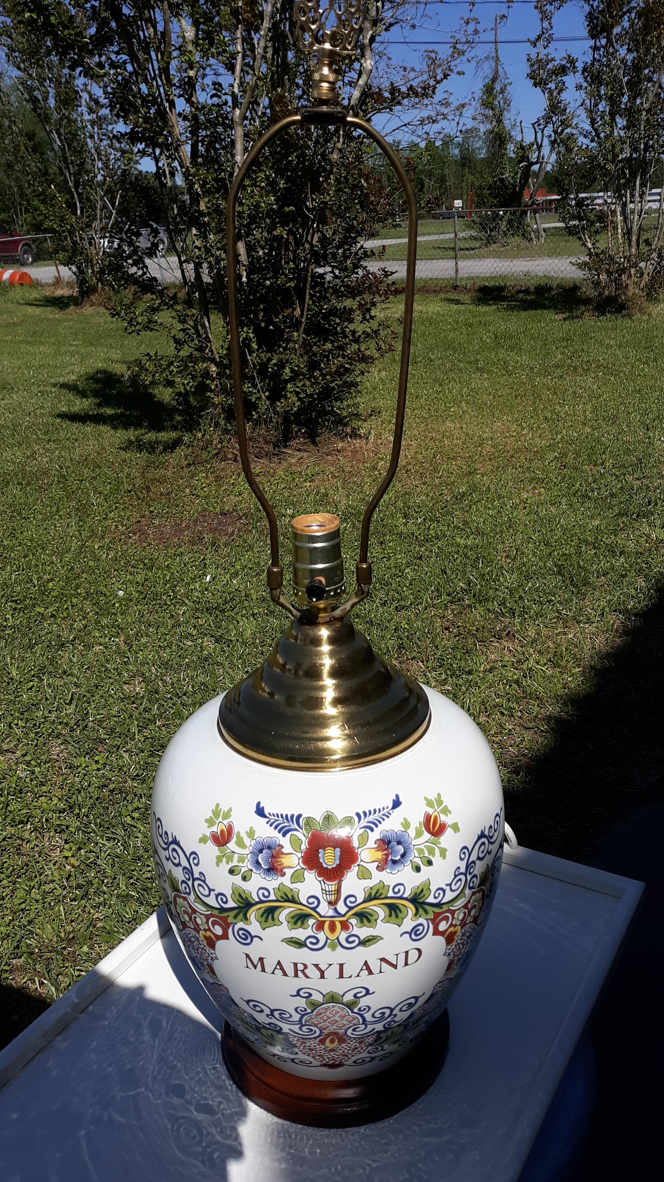 The lamp has a base in the style of a Delft tobacco jar with bright cobalt blue floral and foliate design F.A.S.C., Inc. Princess Anne MD stands 30″ from bottom to top of finial no damage on wooden base. see pics