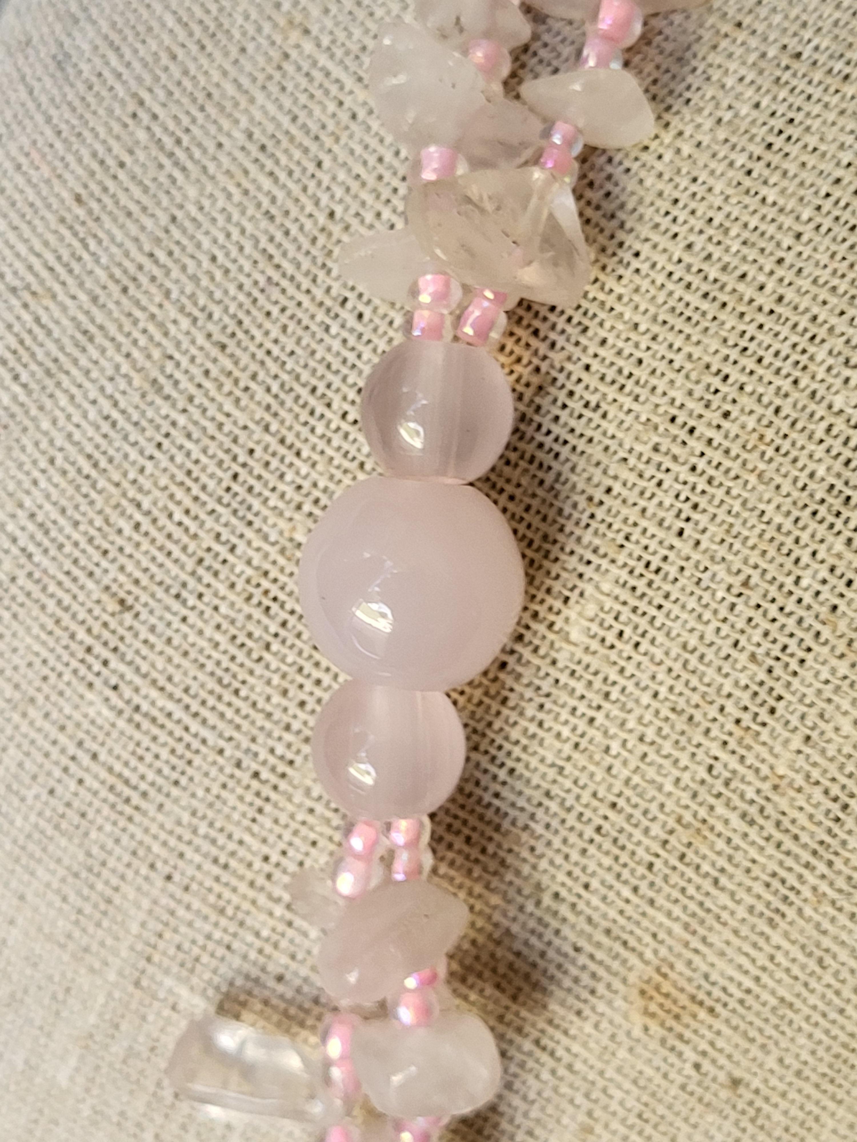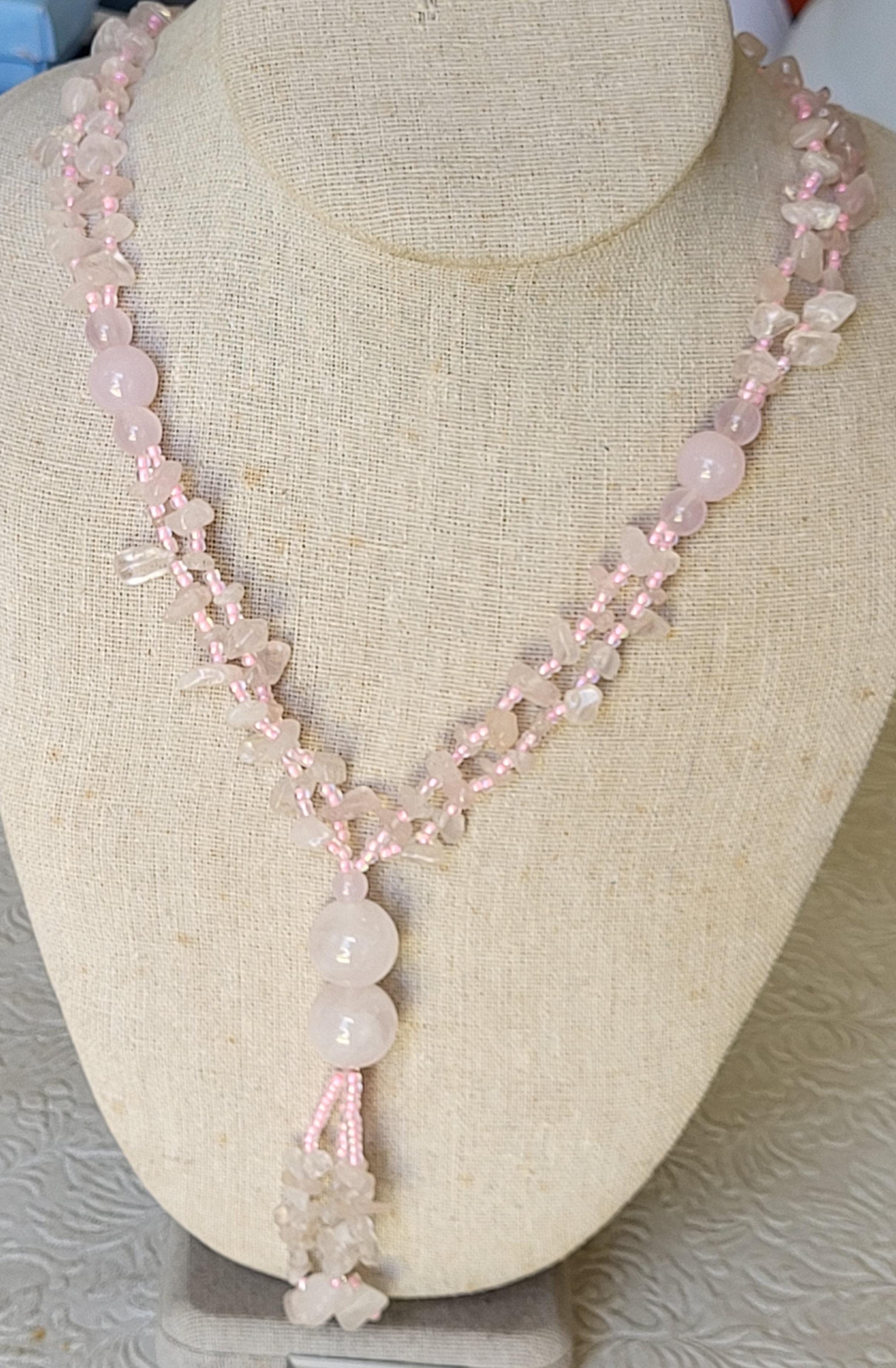 30″ with a 3″ drop white and rose quartz in excellent condition see pics