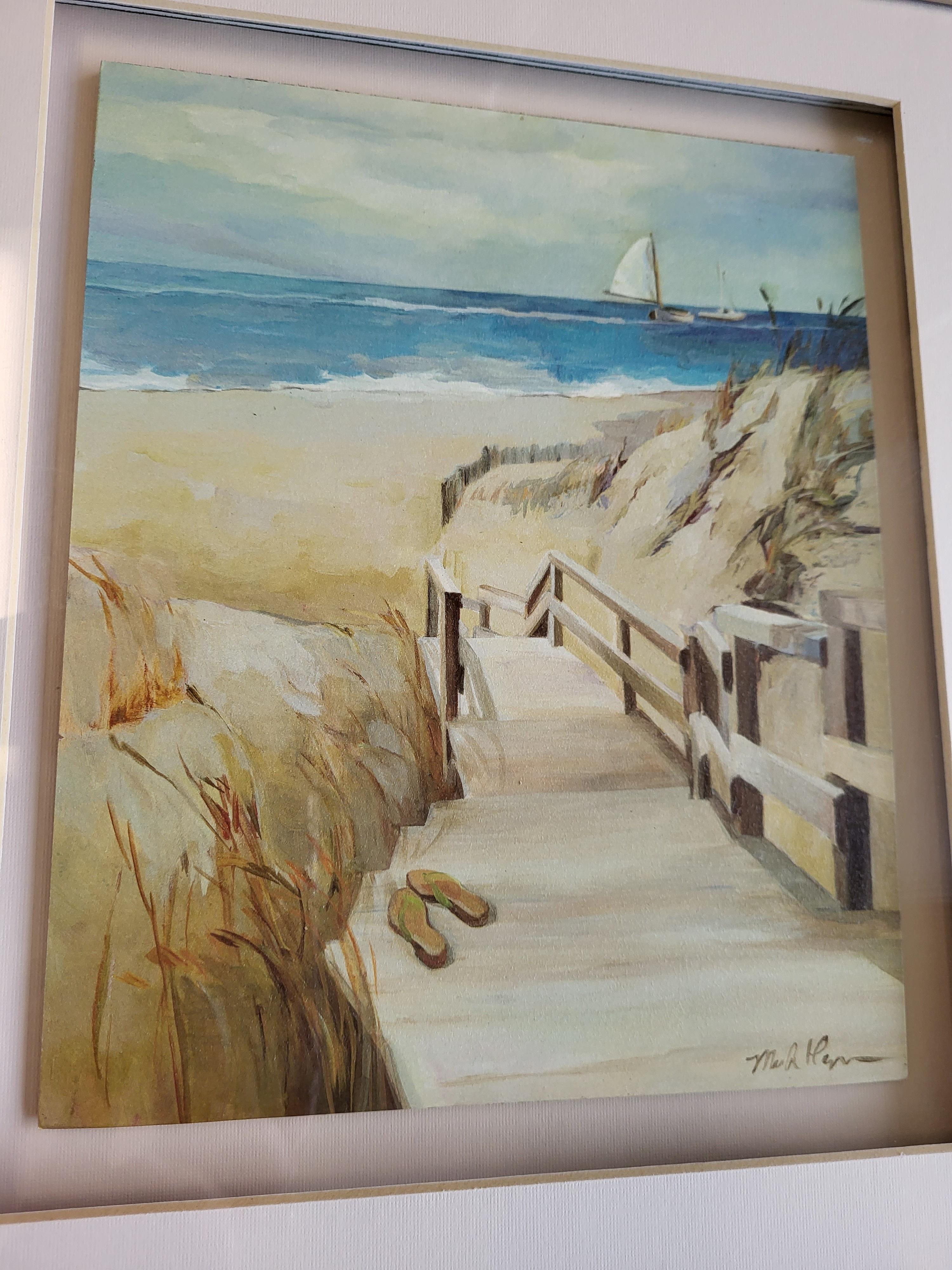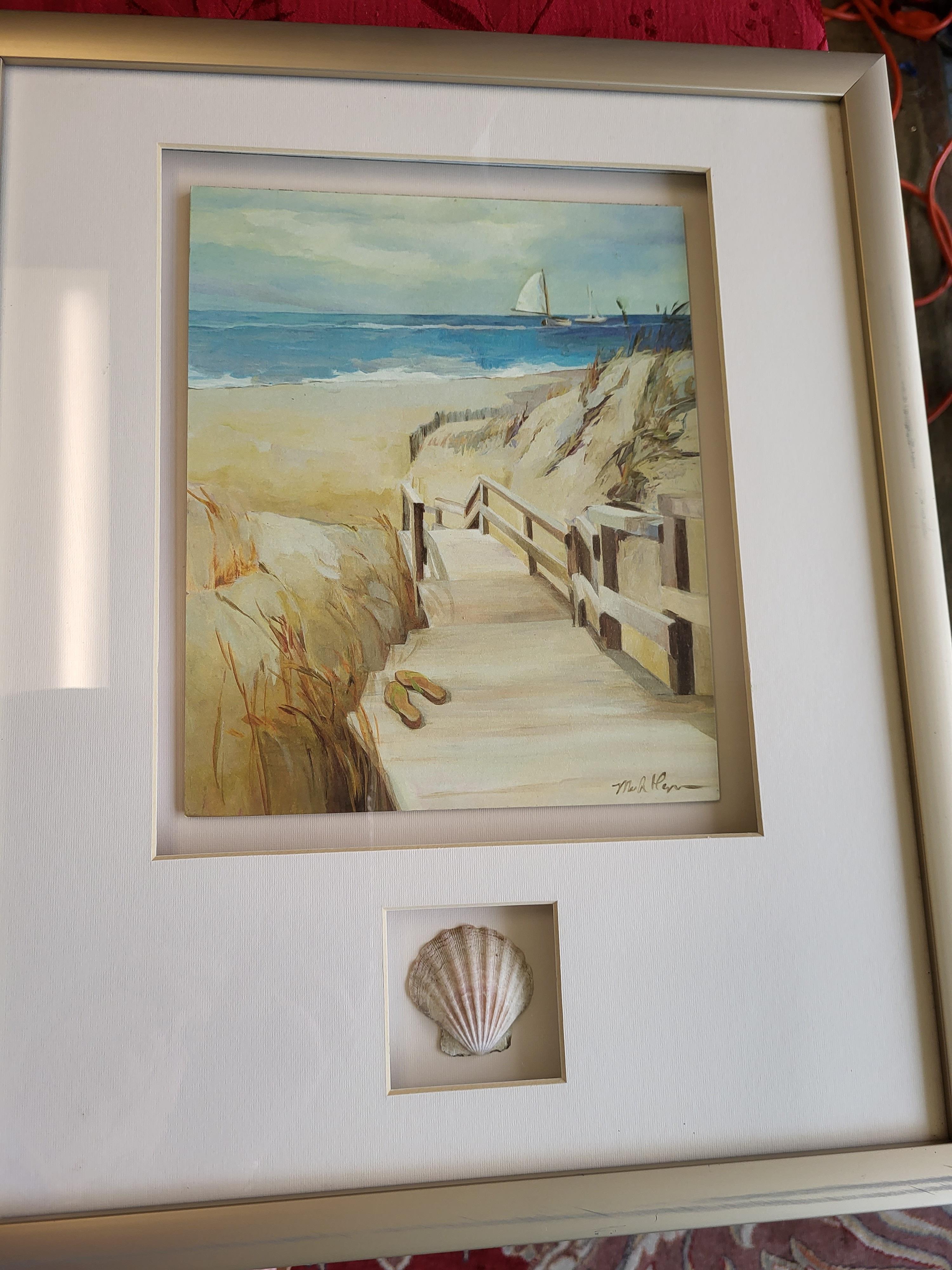 framed nautical sea shore art with a shell, 18″ x 15″ see pics beautiful colors
