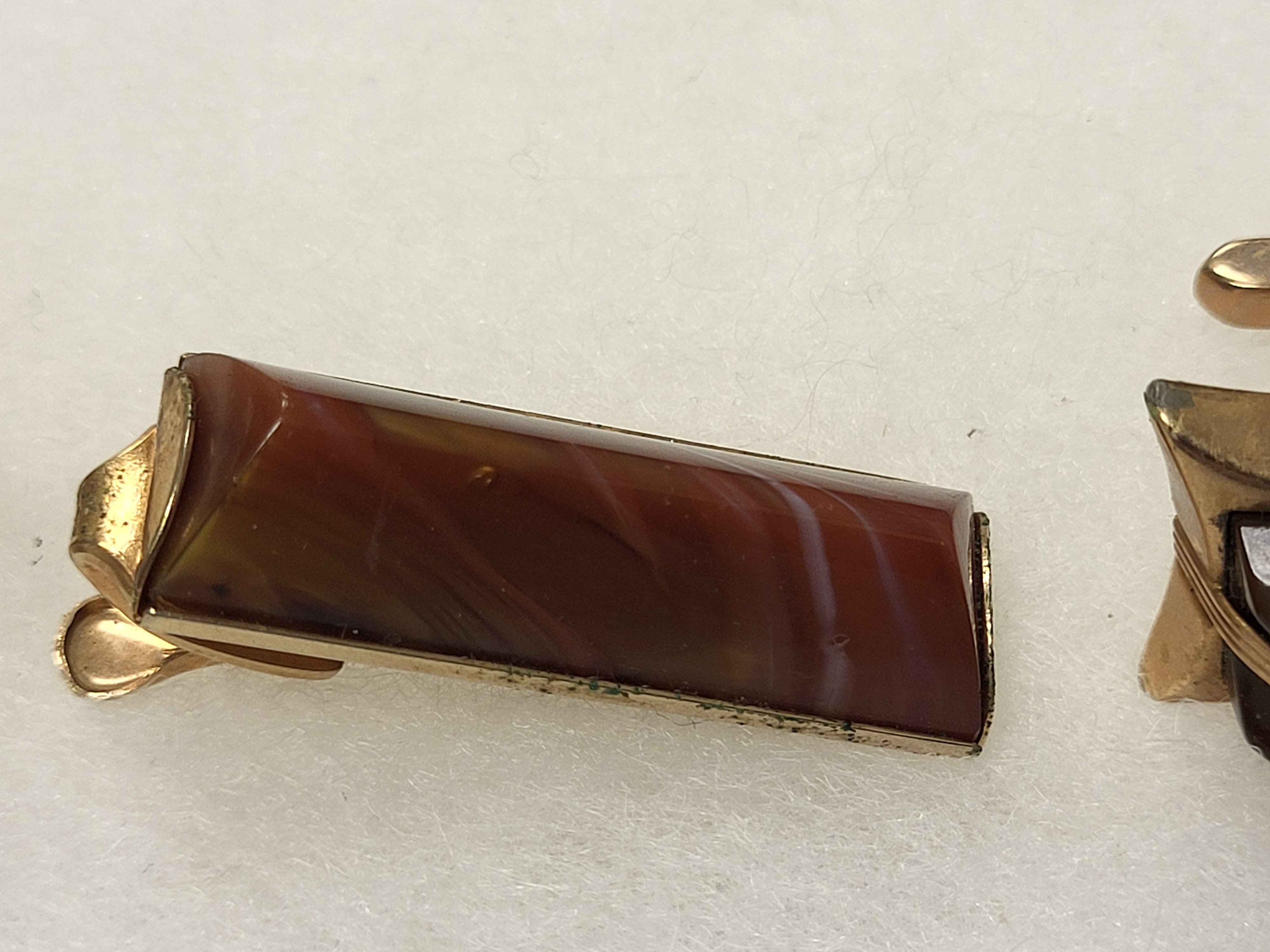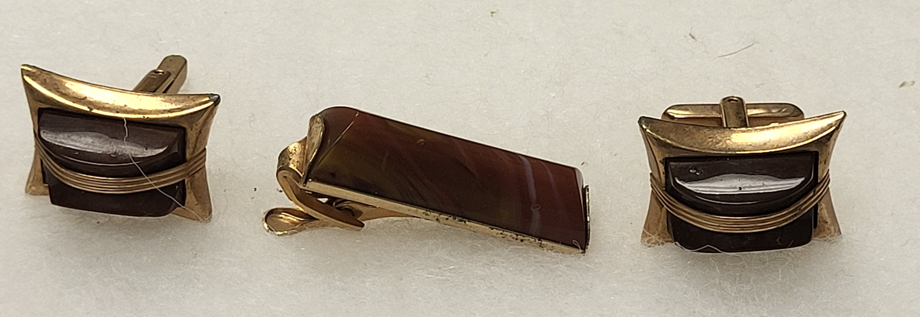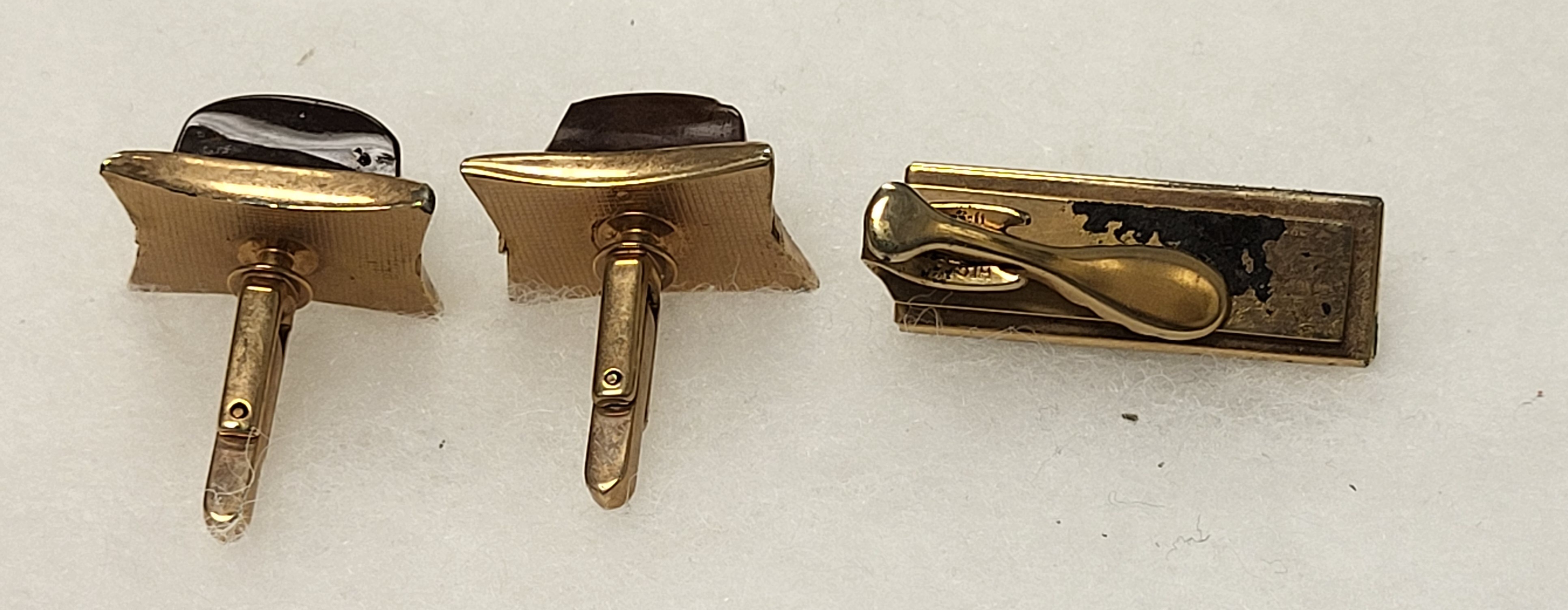 from estate hickok gold plated cufflinks w large buck red stone and swirl tie clip all sold for one bid see pics