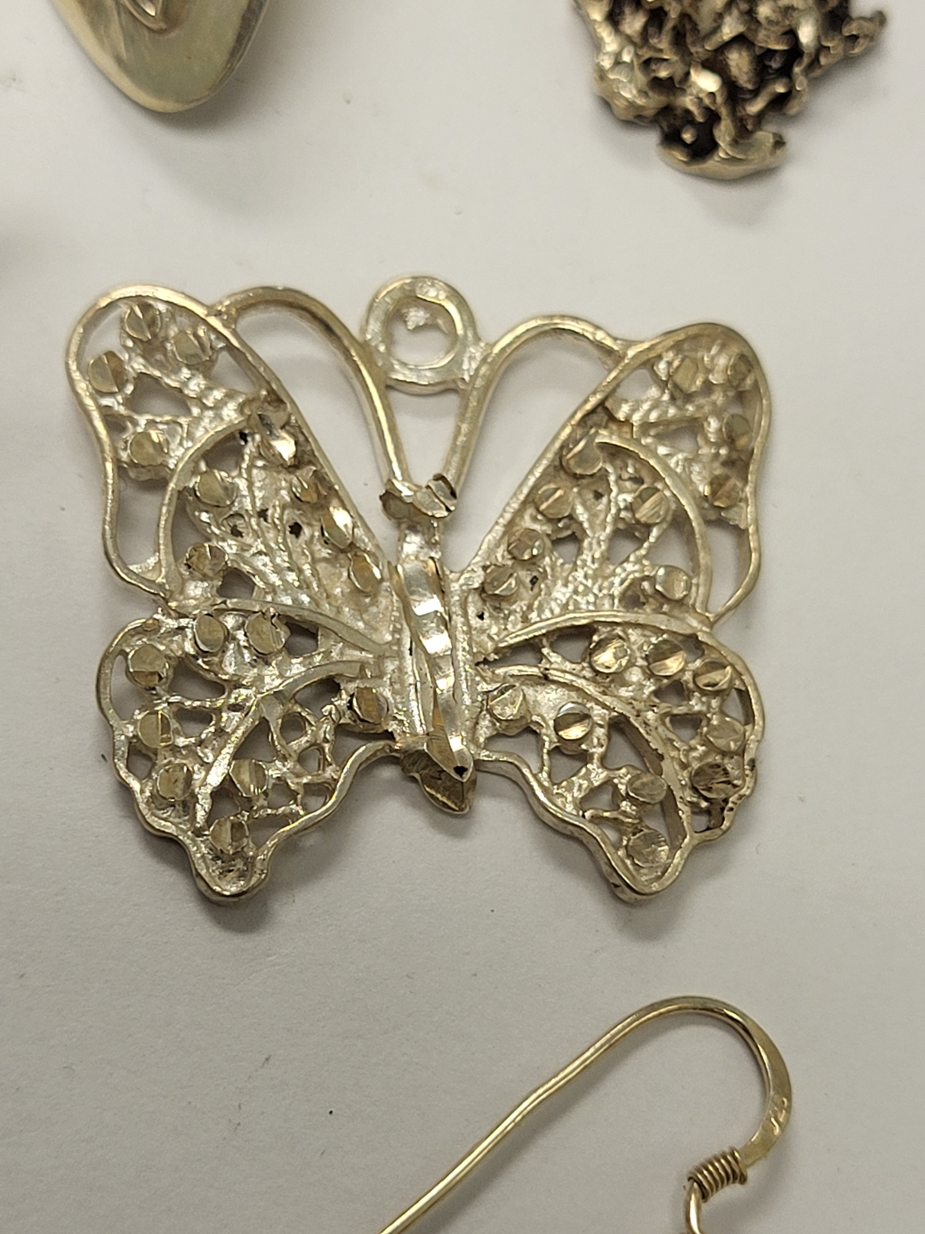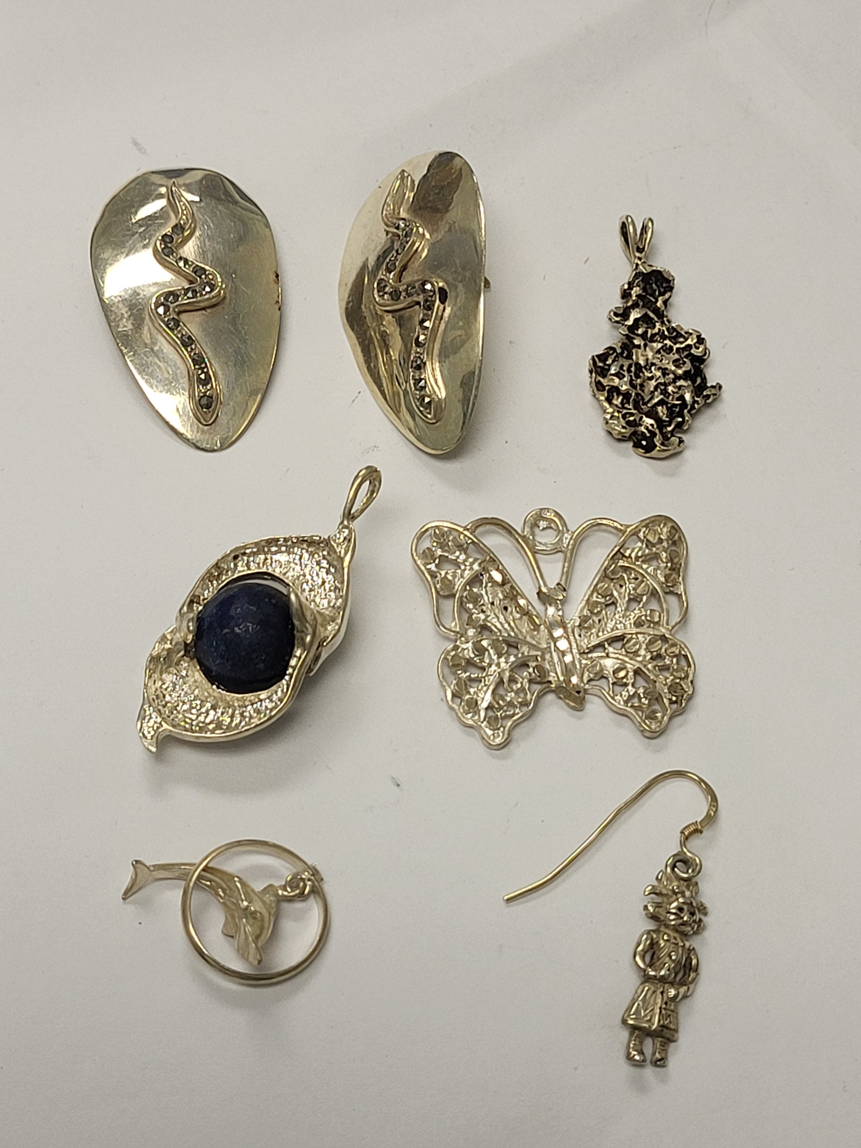 dolphin pendant w.lapis, very nice! butterfly pendant also nice, bunny rabbit, pendant good, mayan single earring good, dolphin good 27 gams and pair of earrings 1 post broken see pics