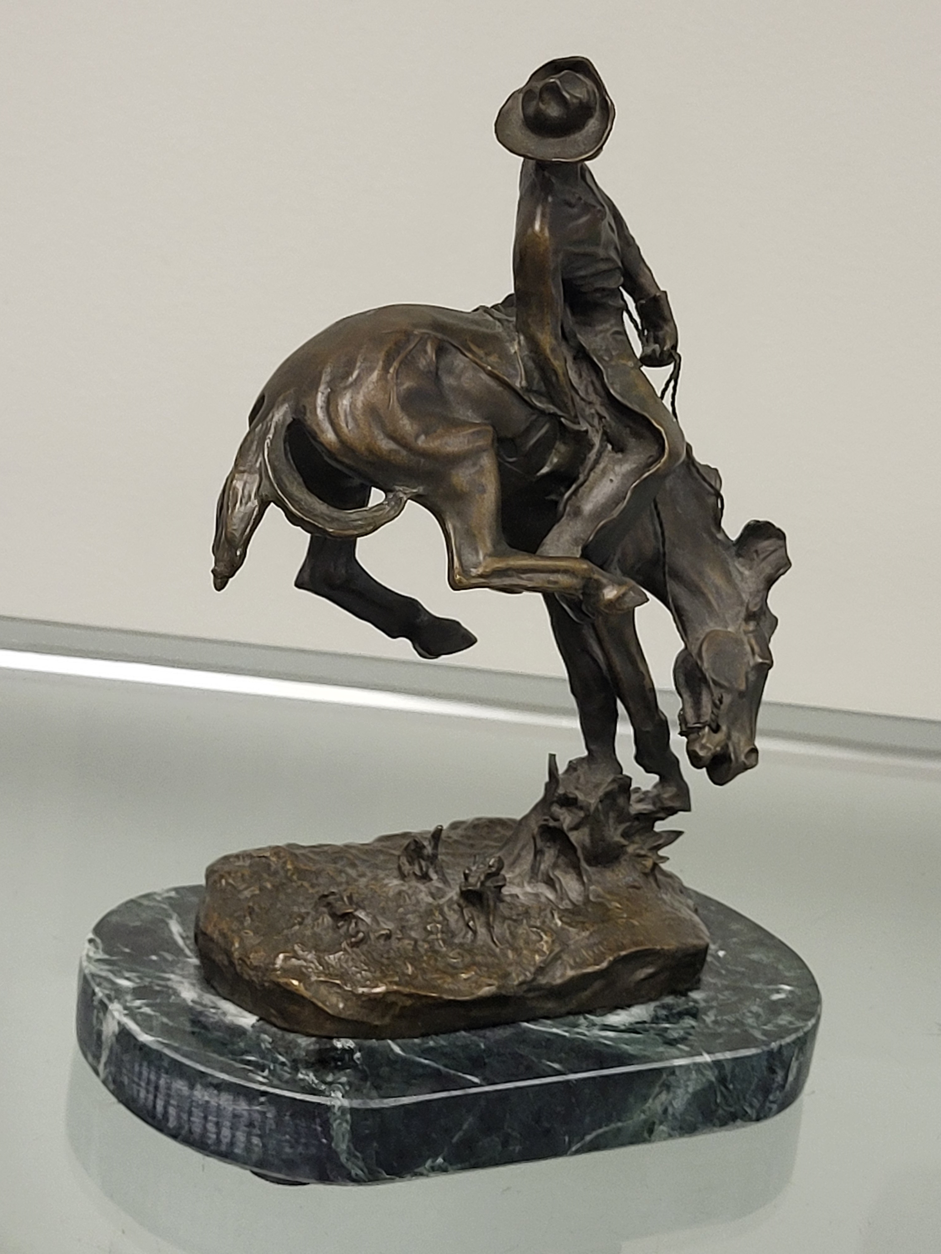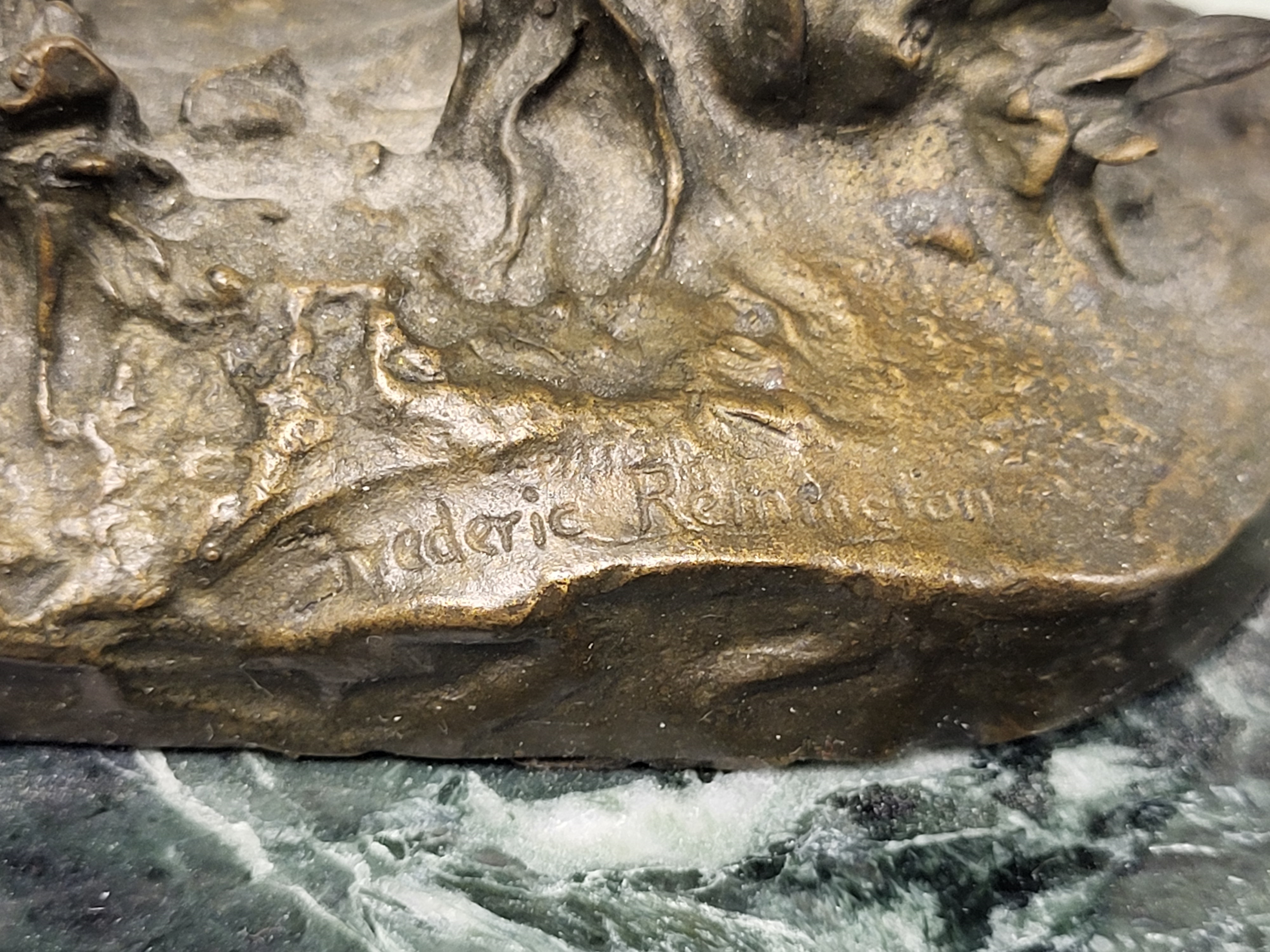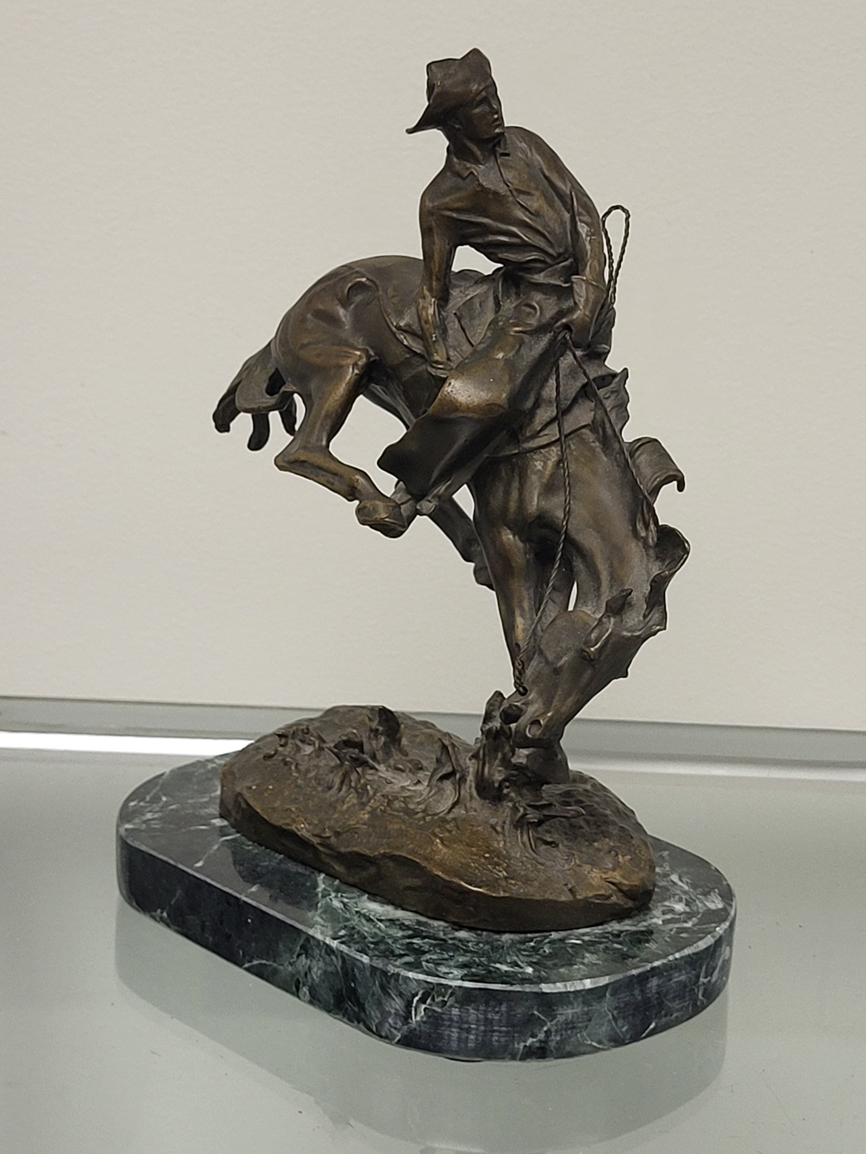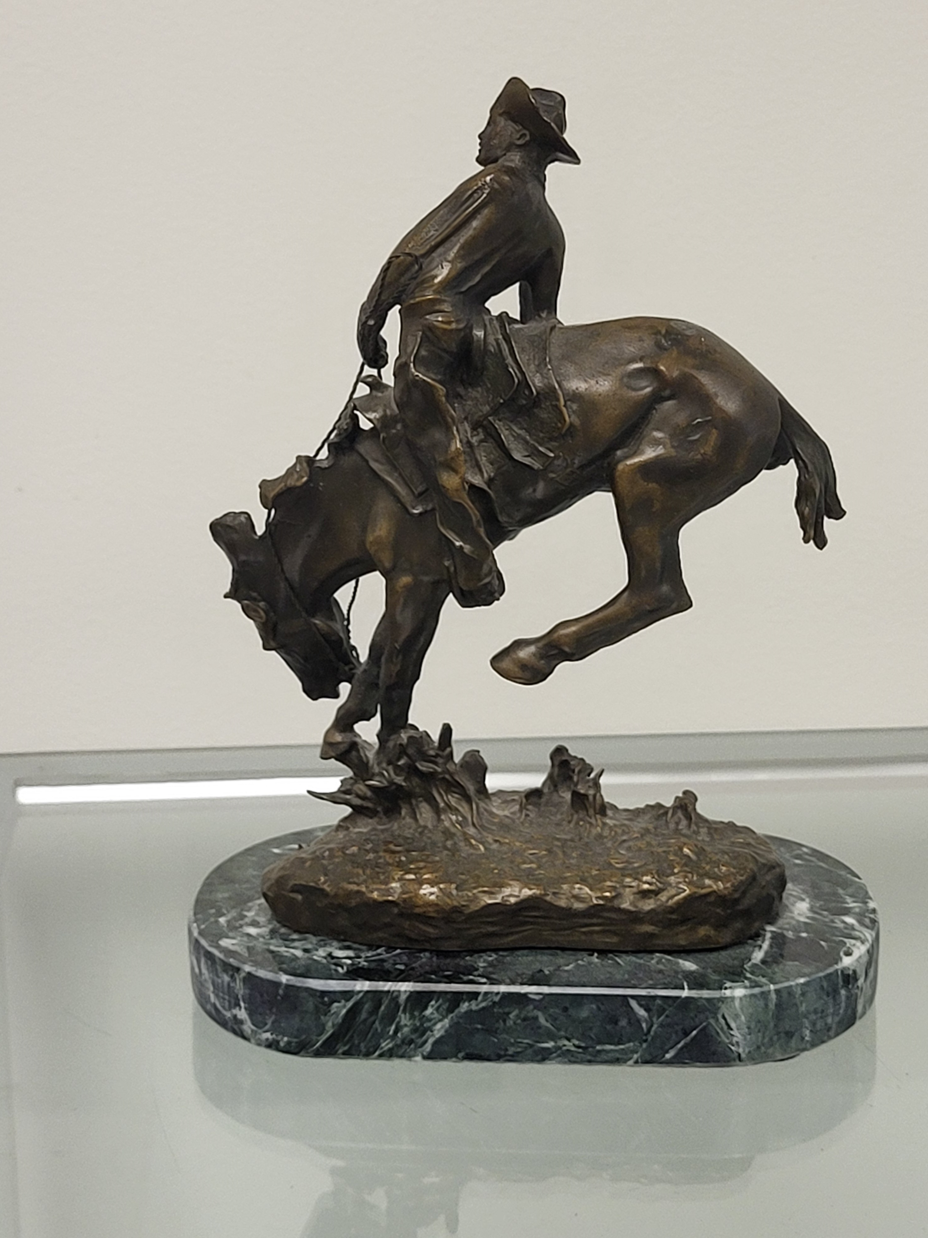 This signed statue and marble base from a estate collection. The statue is signed Frederic Remington and depicts a outlaw on horseback. I’ve inspected the statue, and the patina is in nice condition with no noted repairs. The measurements are eight inches tall by six inches wide. Please see the photos.