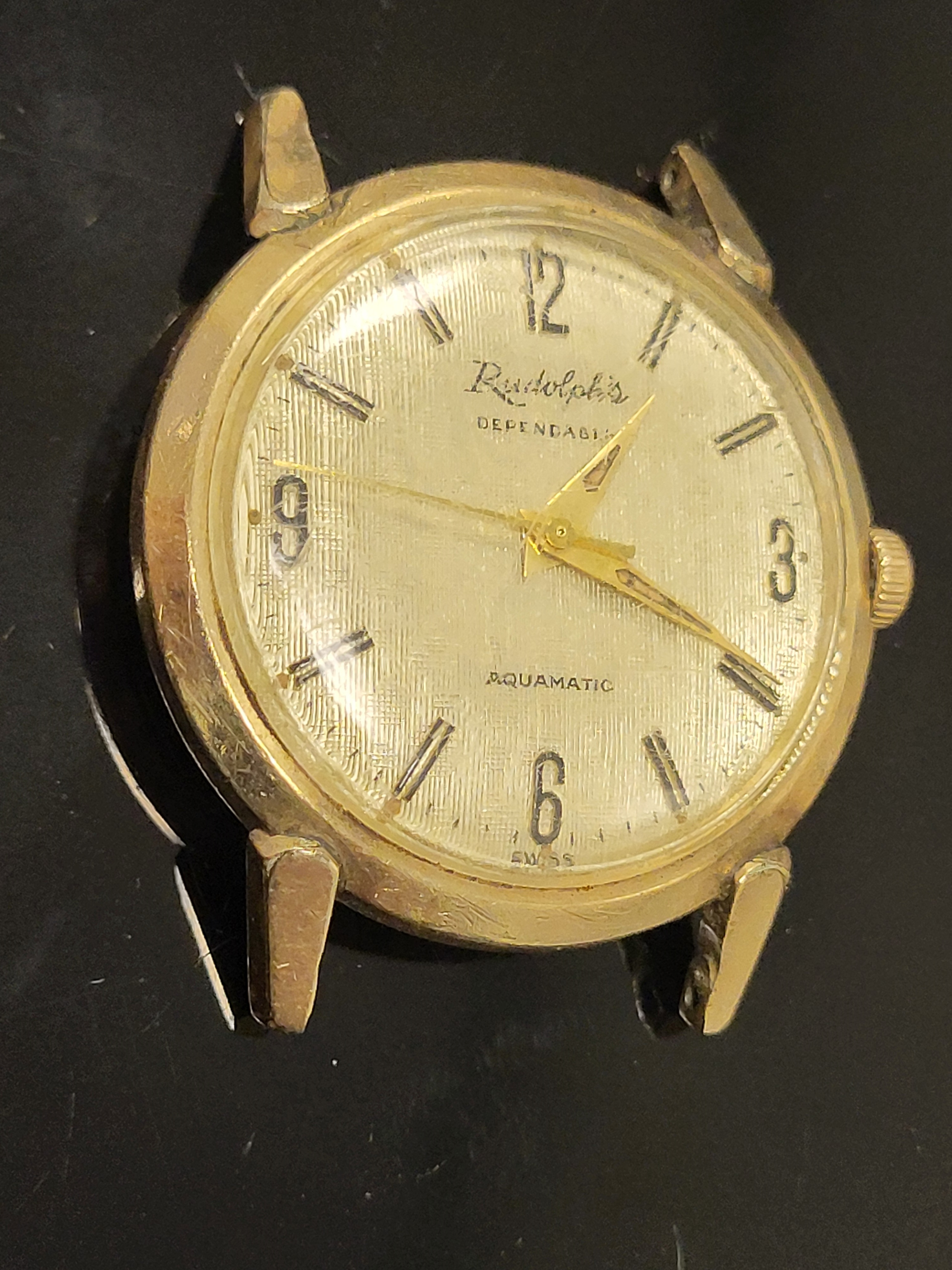rare 1960’s rudolph’s aquamatic 10K bezel watch works rare automatic watch likely 21 or more jewels? called aquamatic enfering waterproof too very cool watch check out these online see pics