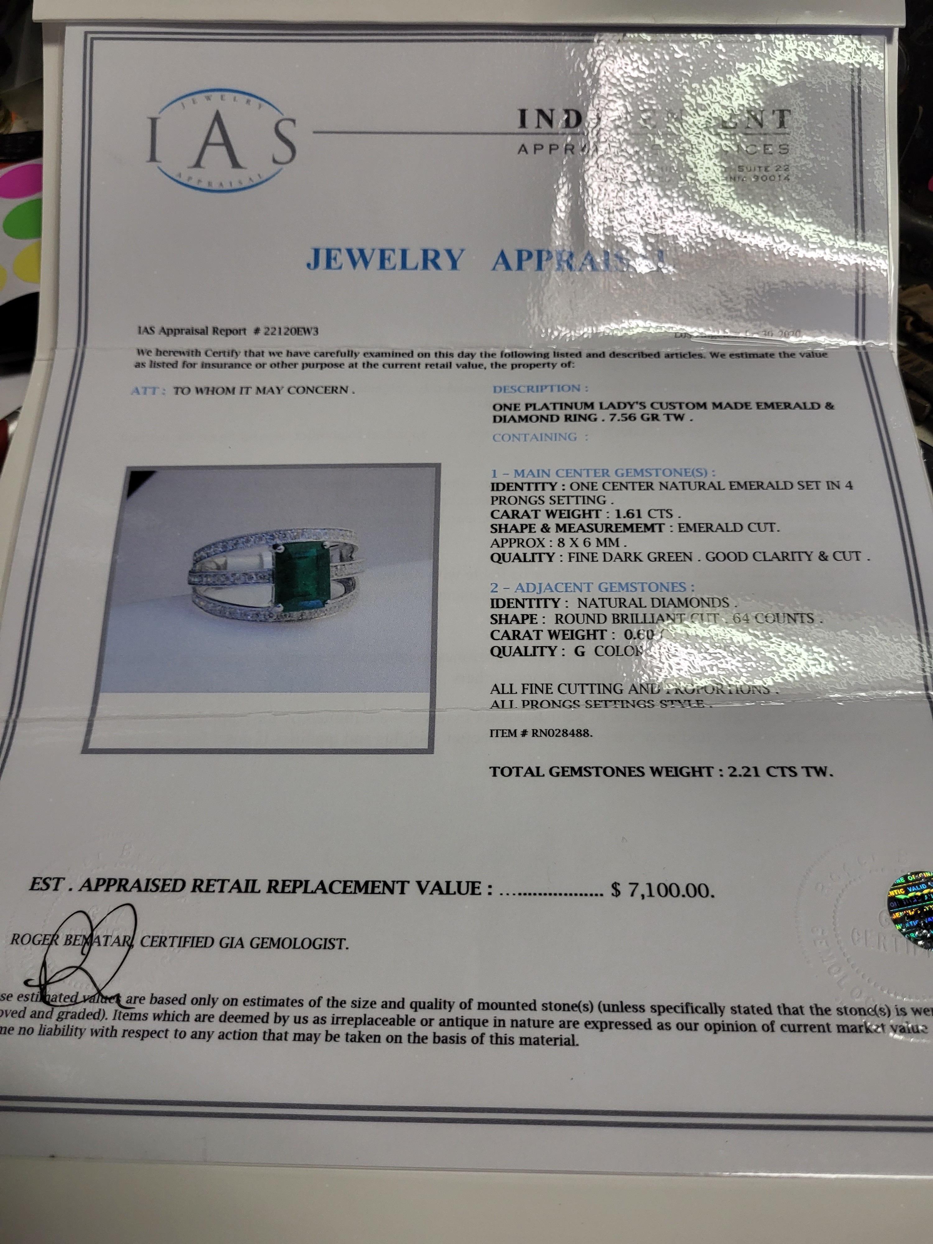 platinum ring sz 7 w/ ctr 1.61 carat emerald w/64 diamonds surrounding w/ appraisal $7100.00 Please read item to be paid by wire or bank transfer or cash only no exceptions no credit cards , winning bidder to call us to get wire transfer info. item reserved k34e76