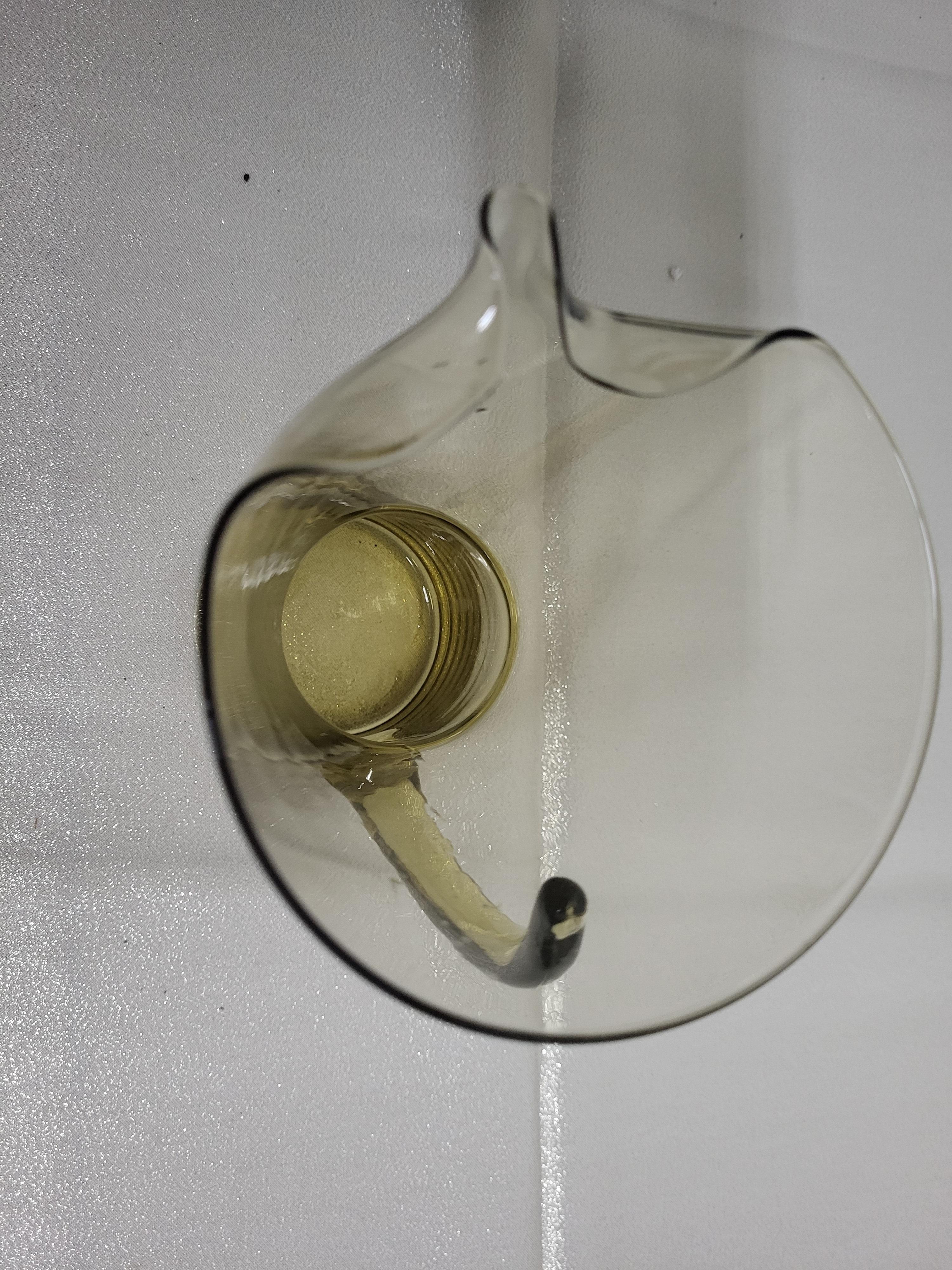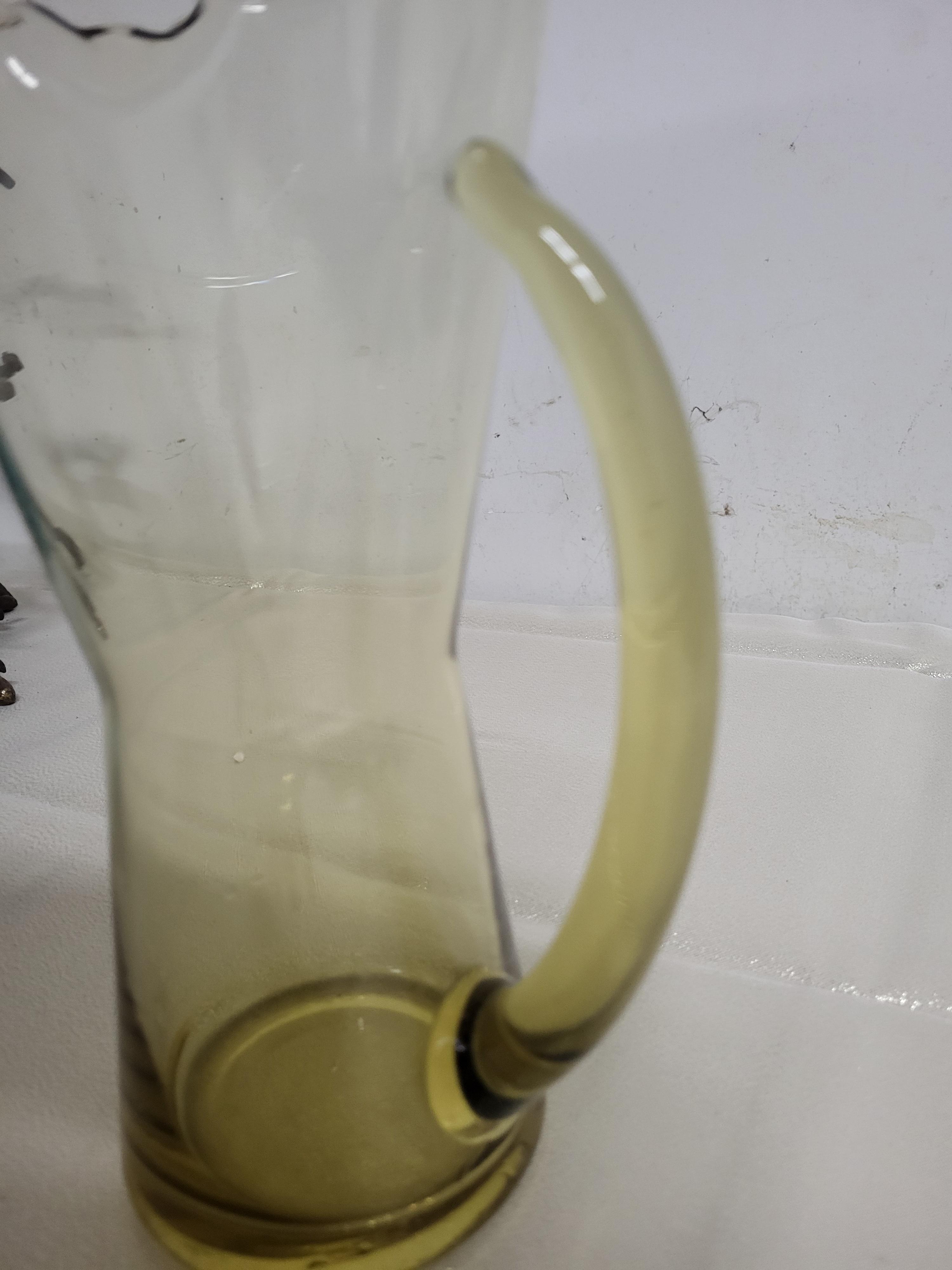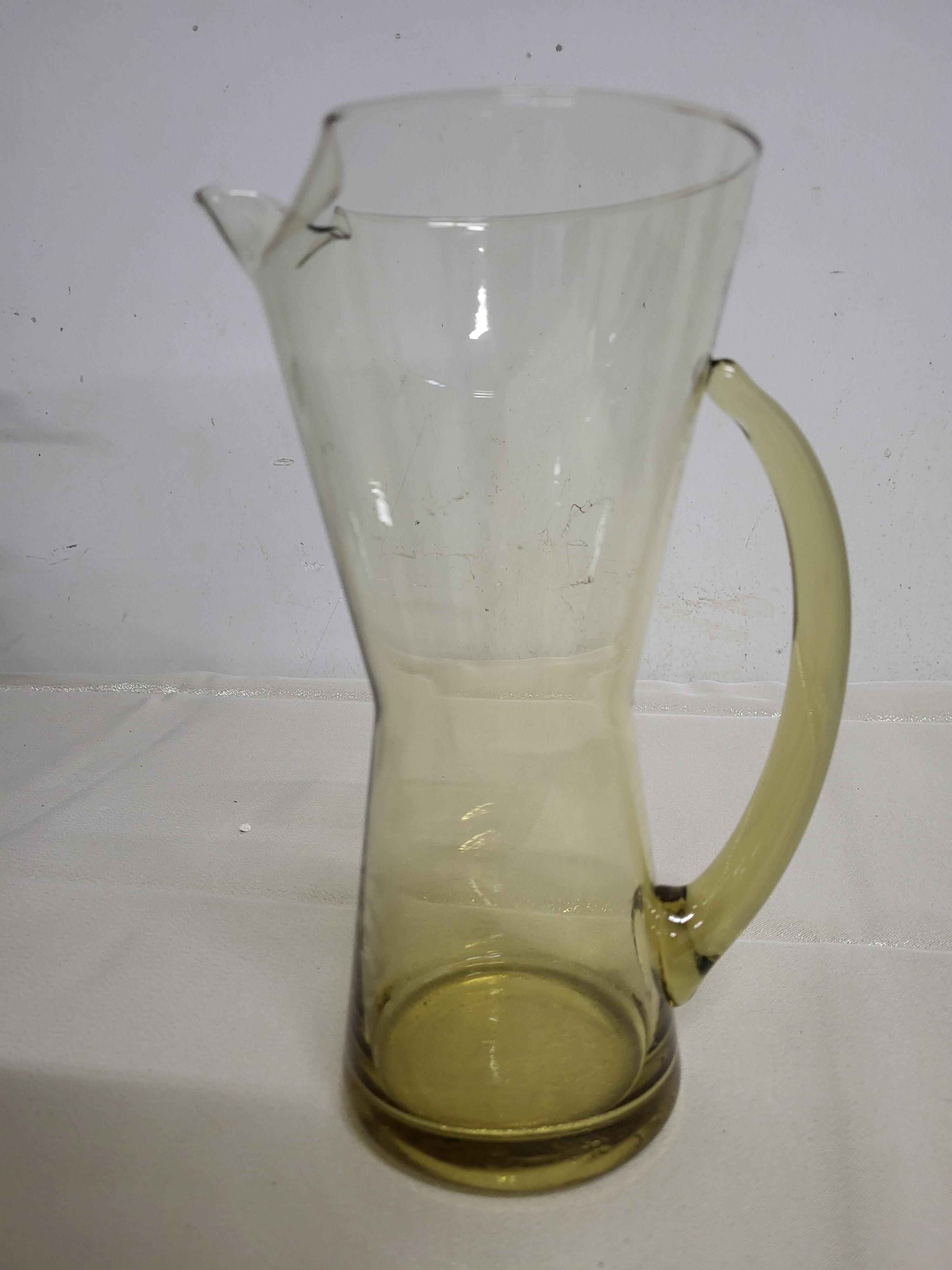 mid century martini pitcher hoffman house morgantown 9″ tall all hand blown smokey golden topaz color no damage see pics features a pinched sput and a heavy bottom limited production period in 1958