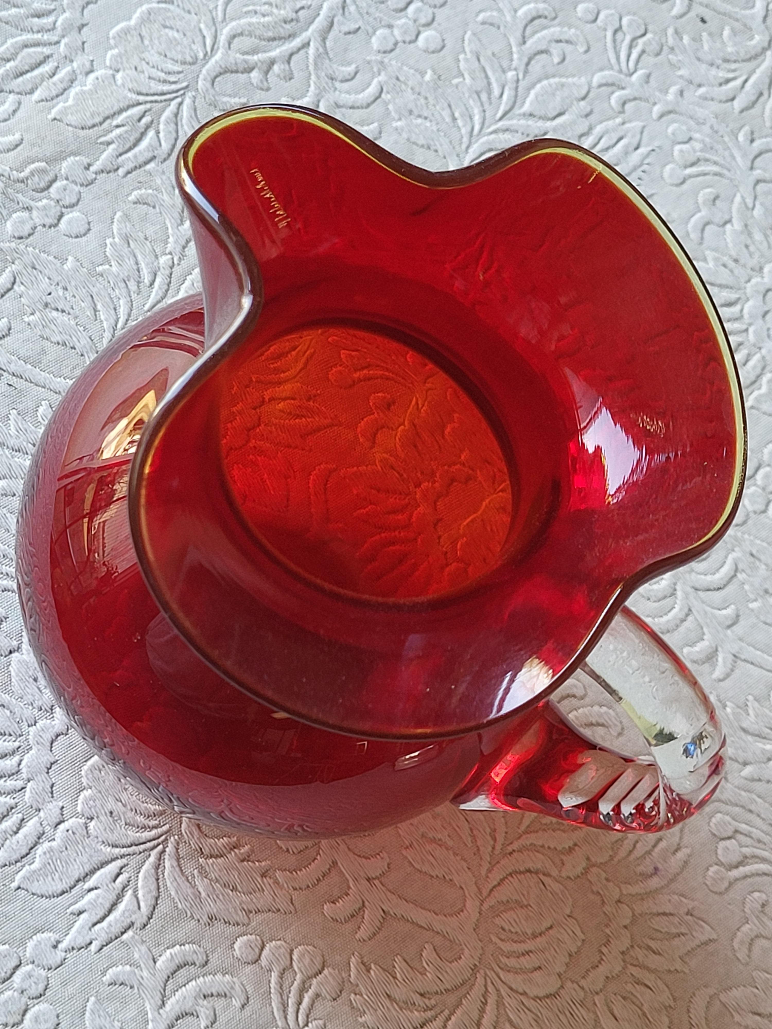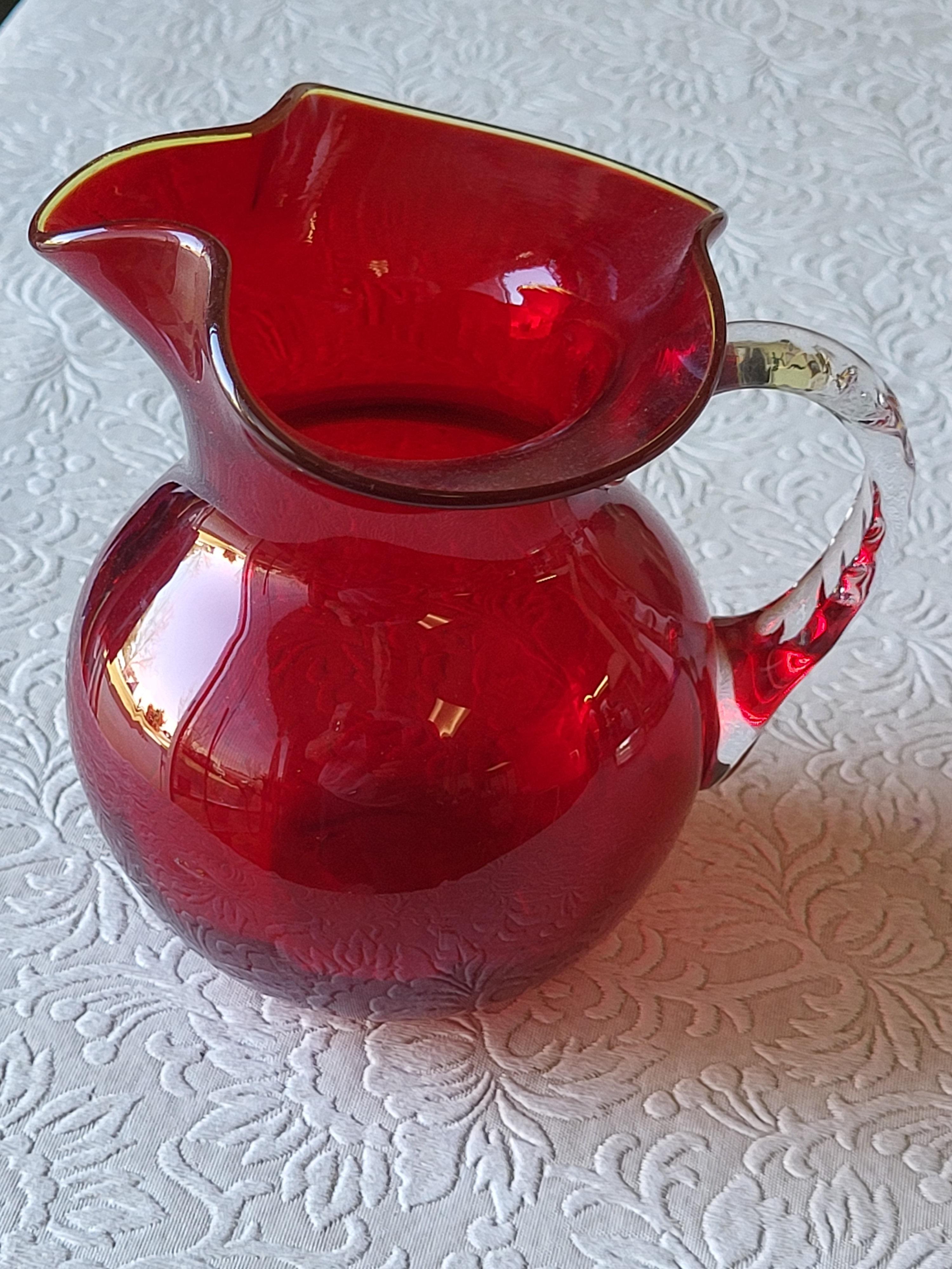 5″ tall has amber lip and ruby body with applied clear handle no damage noted see pics hand blown