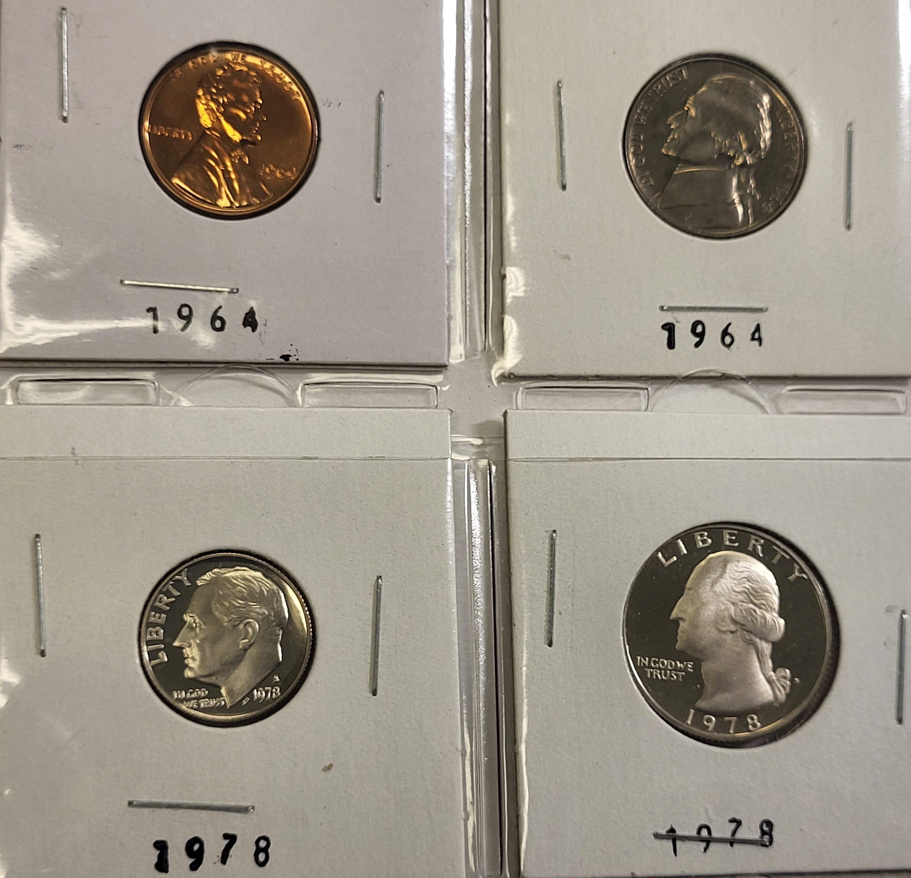1964 lincoln cent bu red proof, 1964 jefferson nickel silver proof, 1978S proof dime and 1978 S proof quarter all 4 forone bid see pics