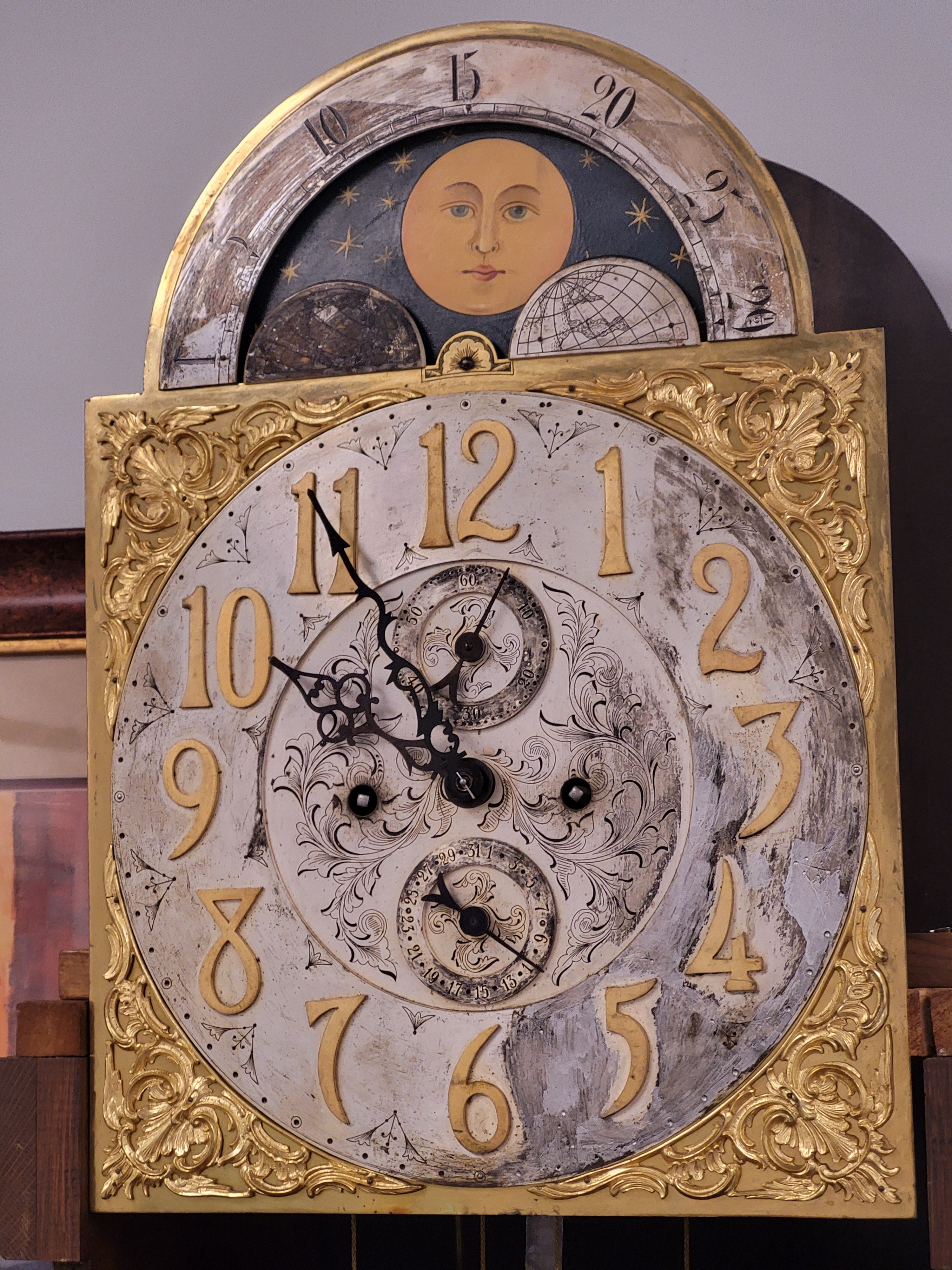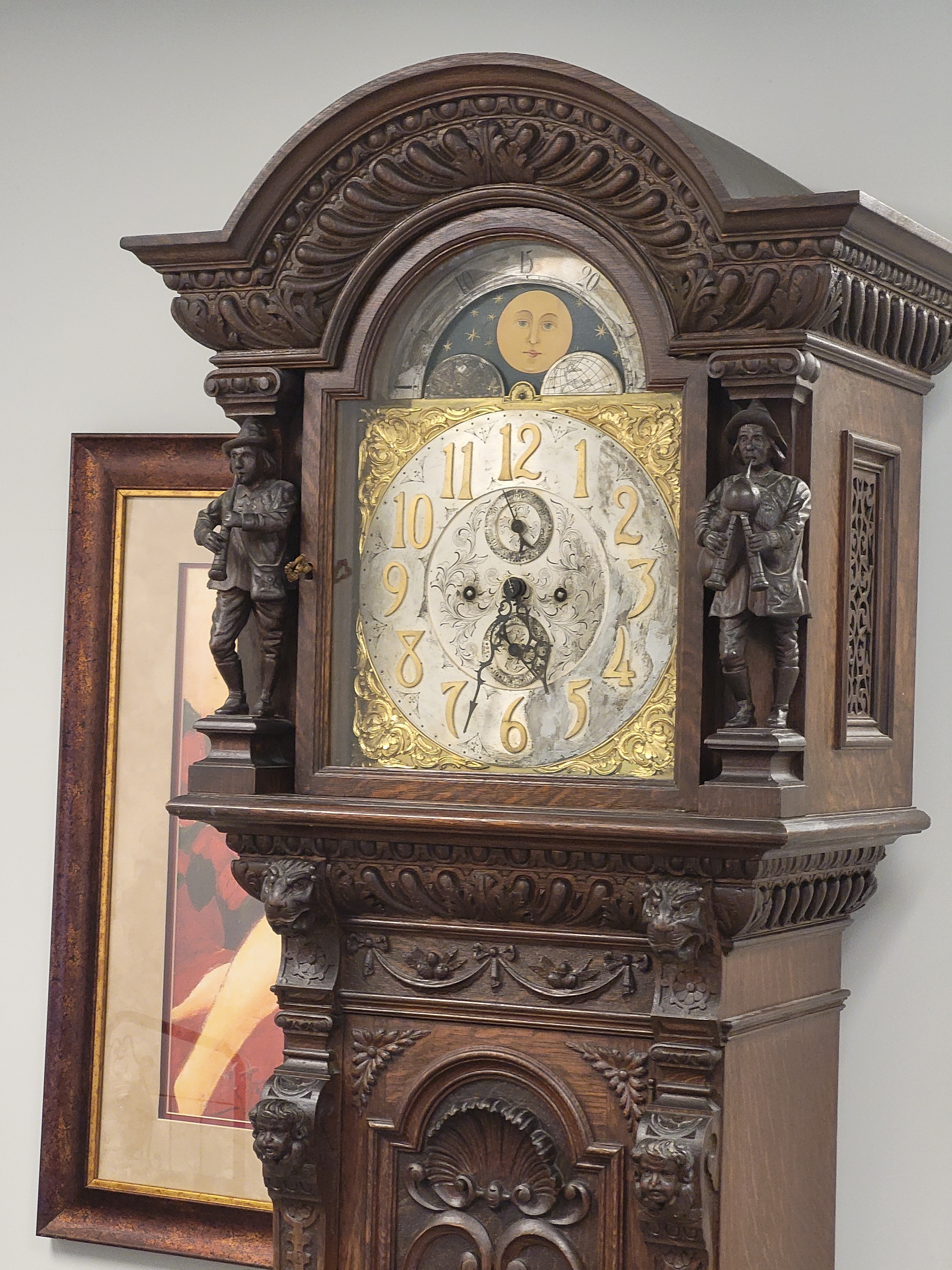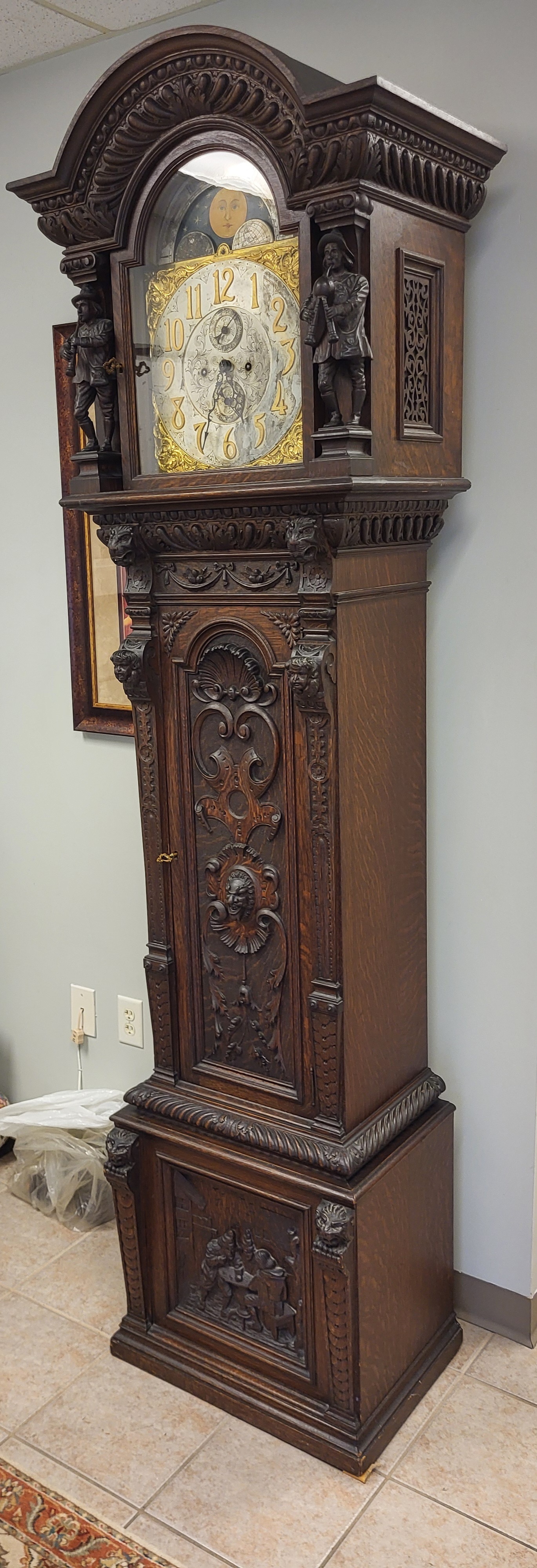 Antique Tall Case Grandfather tiger oak clock attrib tiffany & co Working!
