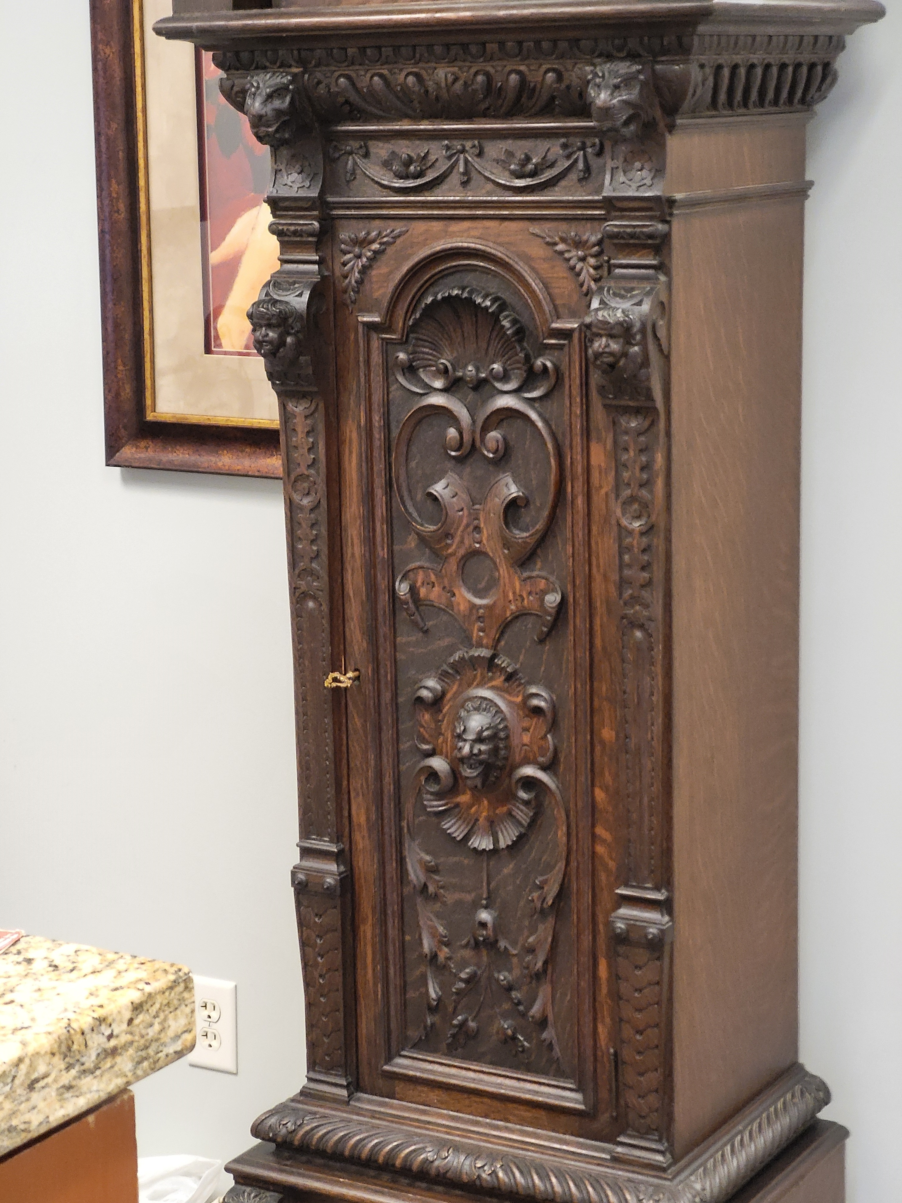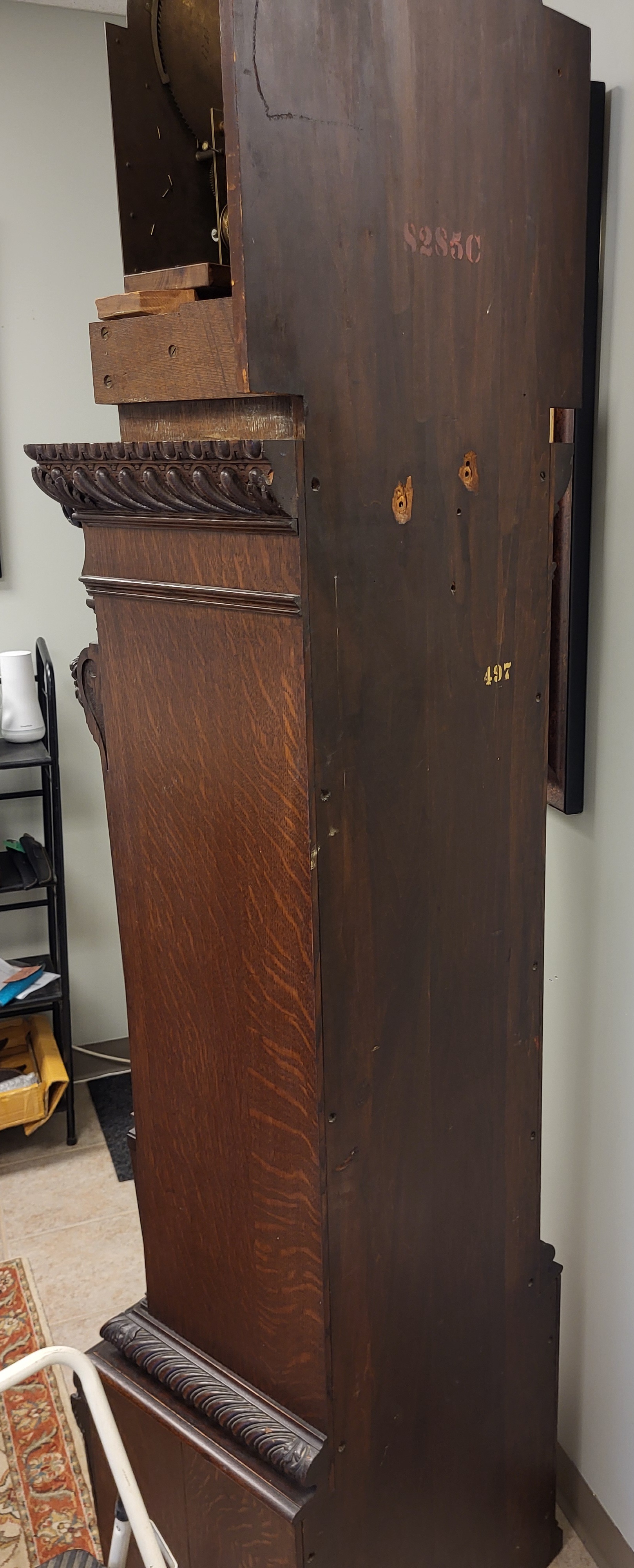 orig tiffany and co clock case w/ winter walder & hofmeier schwarzenback replaced movement 91" x 22" x 18" case size working great, time and strike elaborate carvings nearly exact ones seen on several tiffany and co examples, this clock is gorgeous and works great we also have the bun feet too! seepics