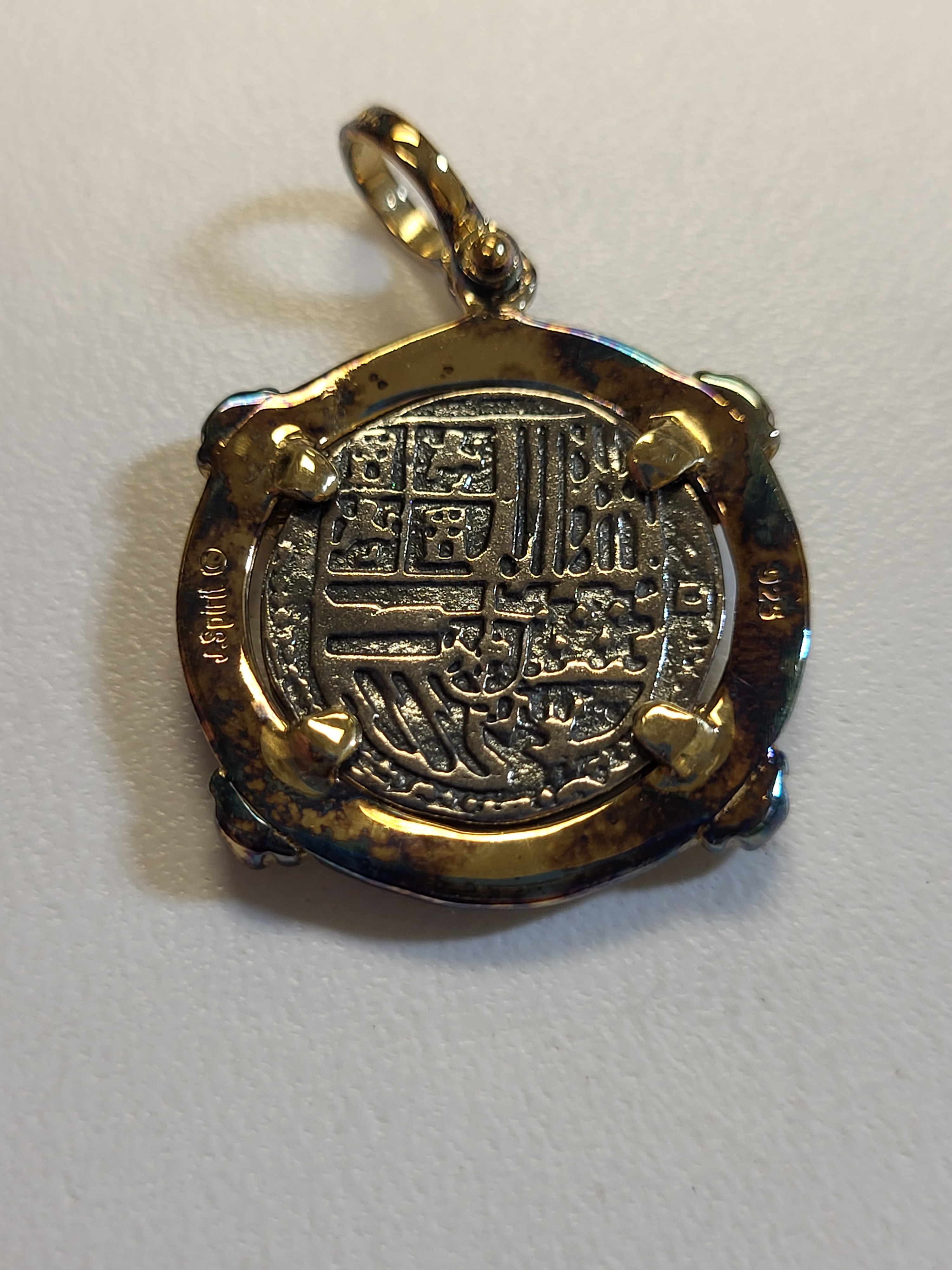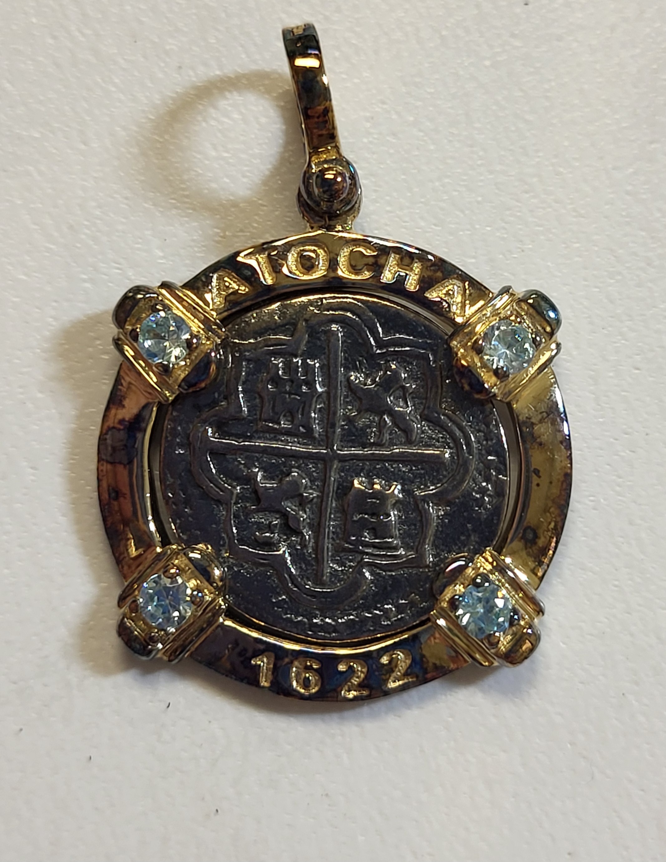 1622 atocha replica coin in sterling w/14K gold wash on the rim & w/4 blue topaz prong set Gorgeous see pics