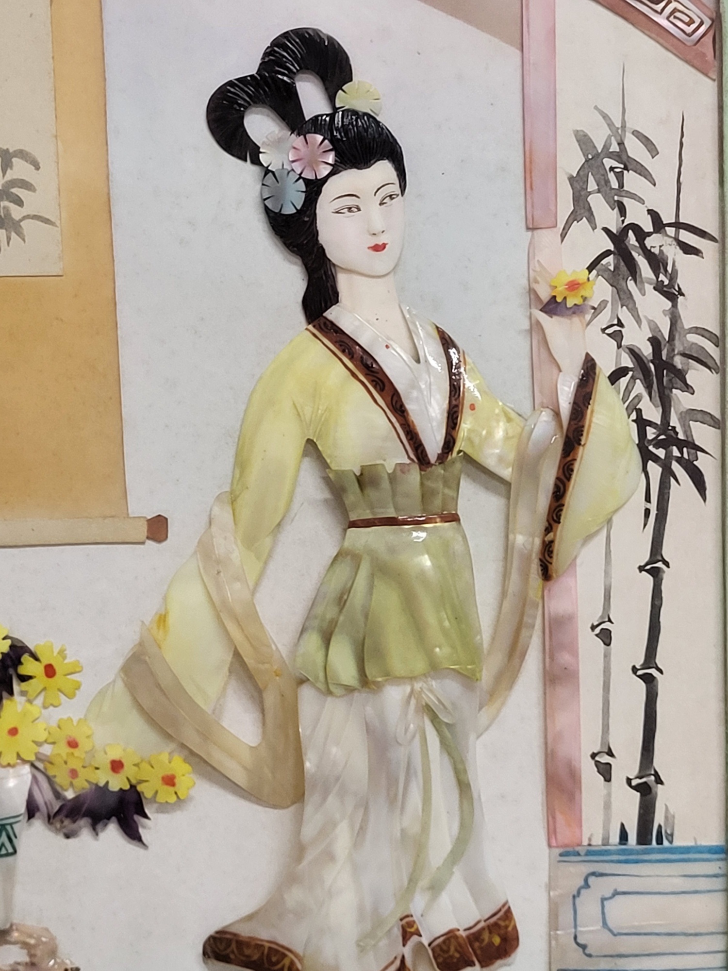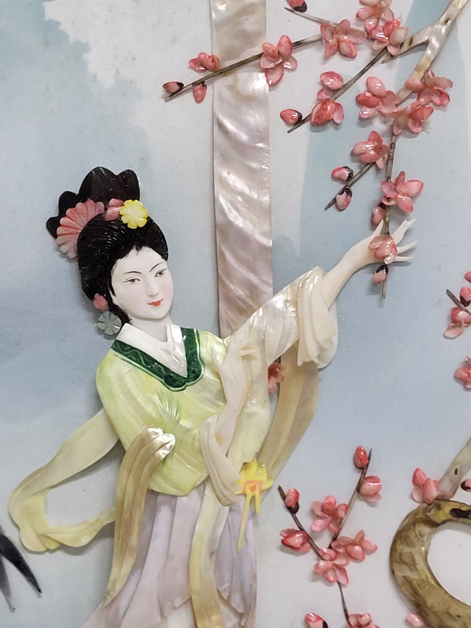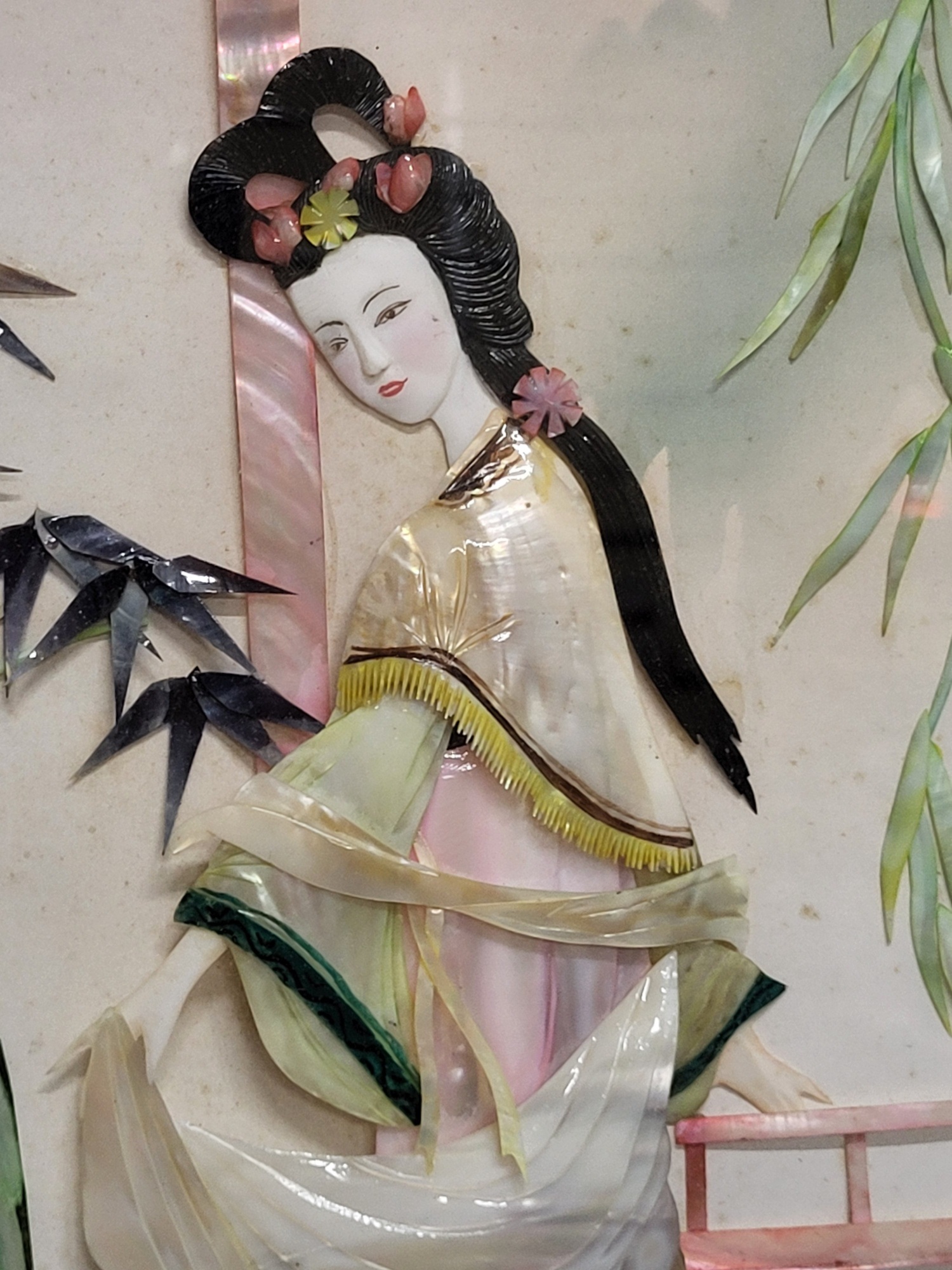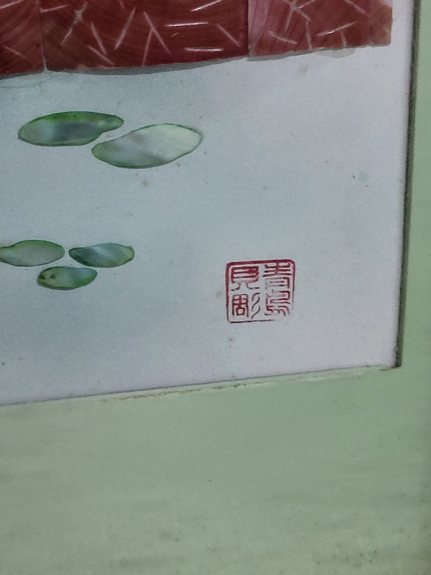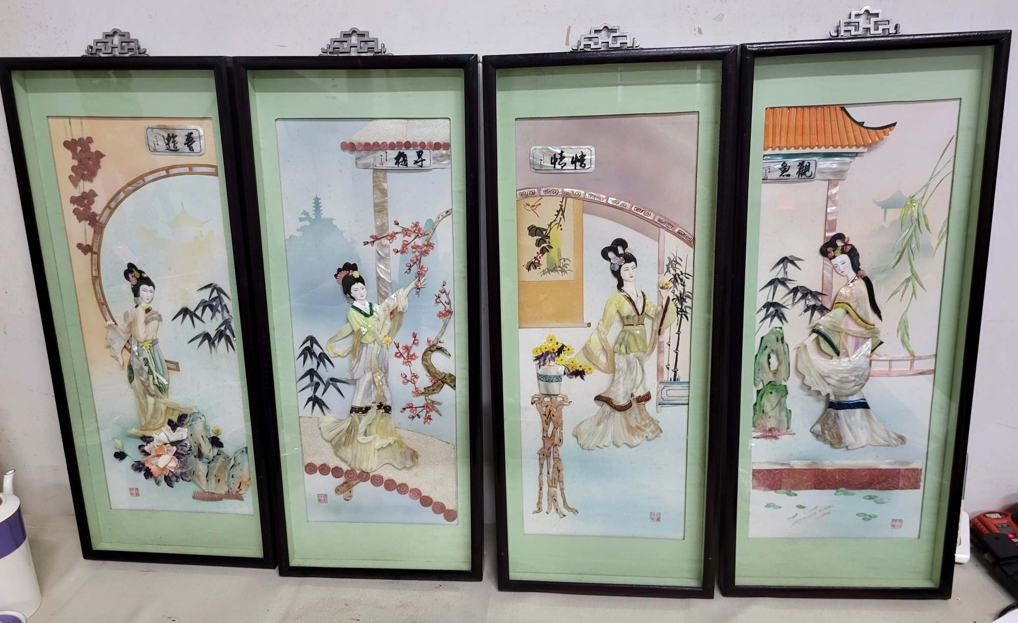 set of 4 32″ x 13″ each, rare shadow box Asian art signed, jade and mother of pearl just stunning all 4 for one bid! see pics don’t miss out on theses from the estate