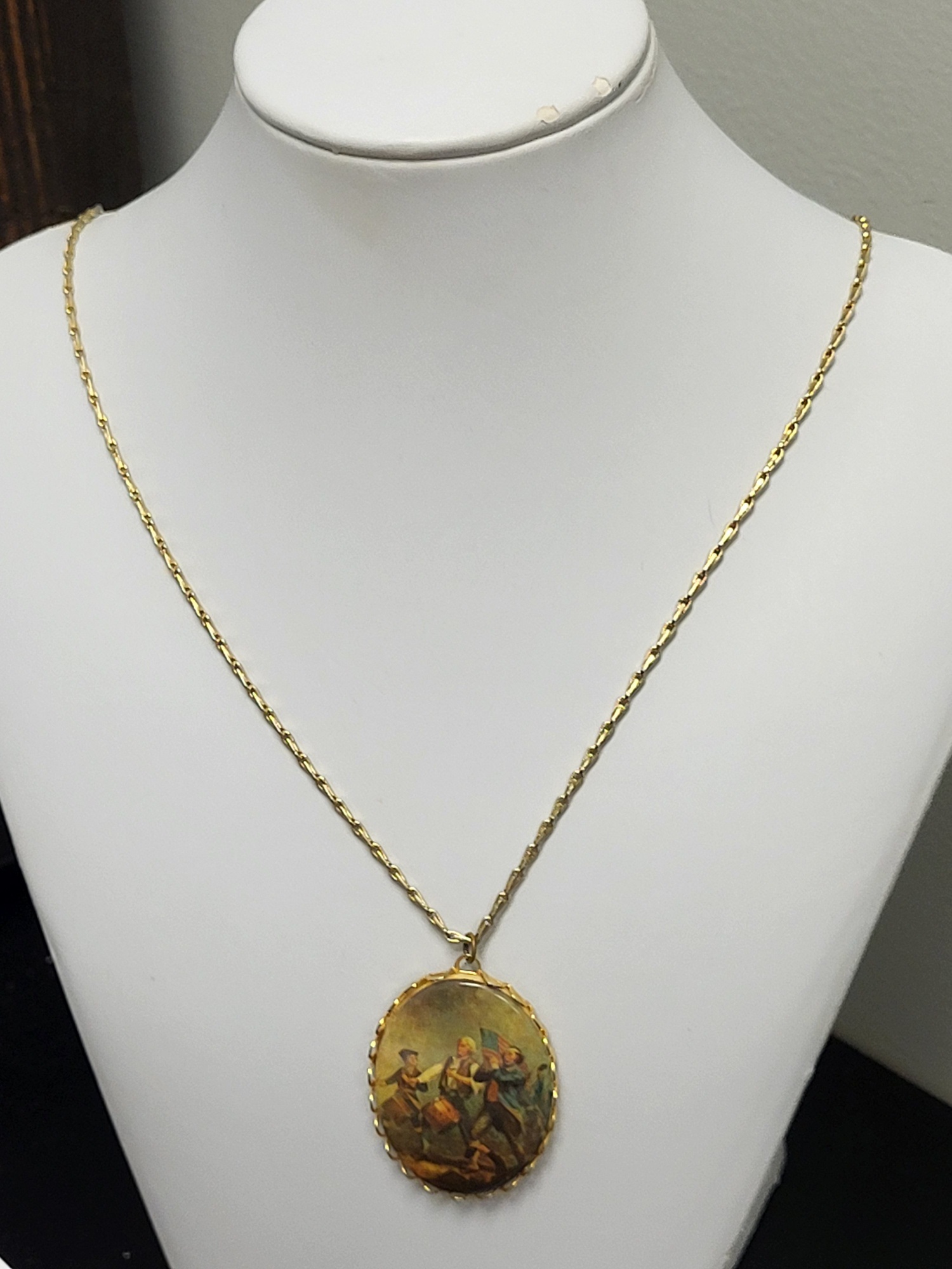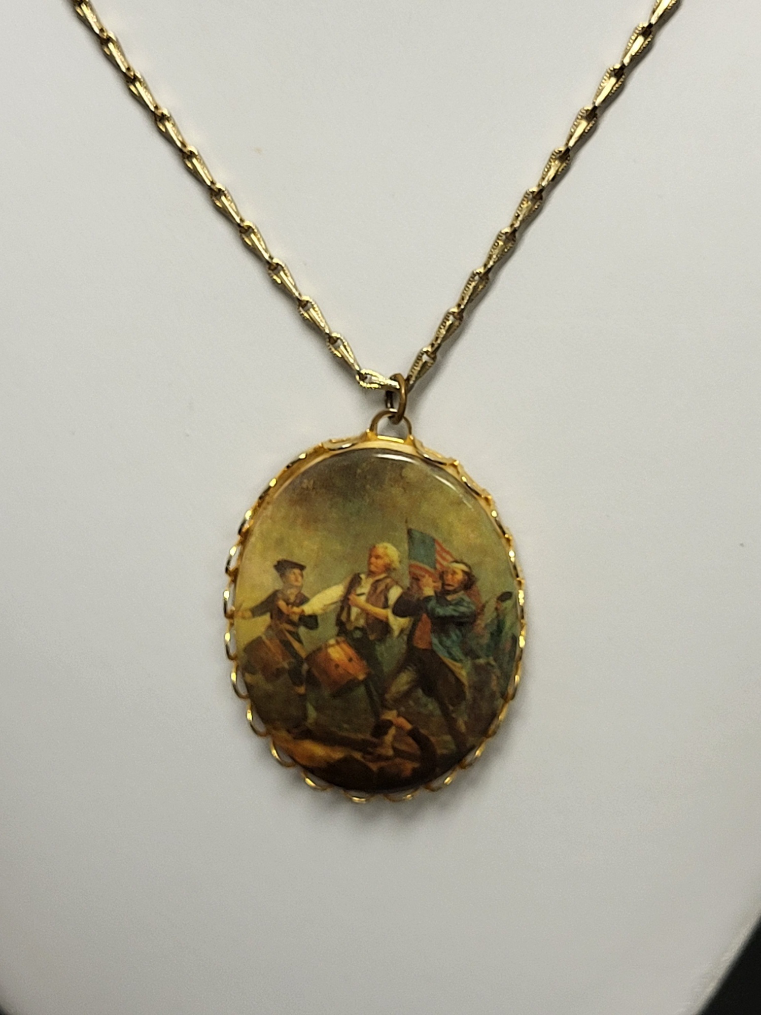 1 5/8″ x 1 1/4″ pendant w/revolutionary scene on gold tone necklace also called spirit 76! see pics
