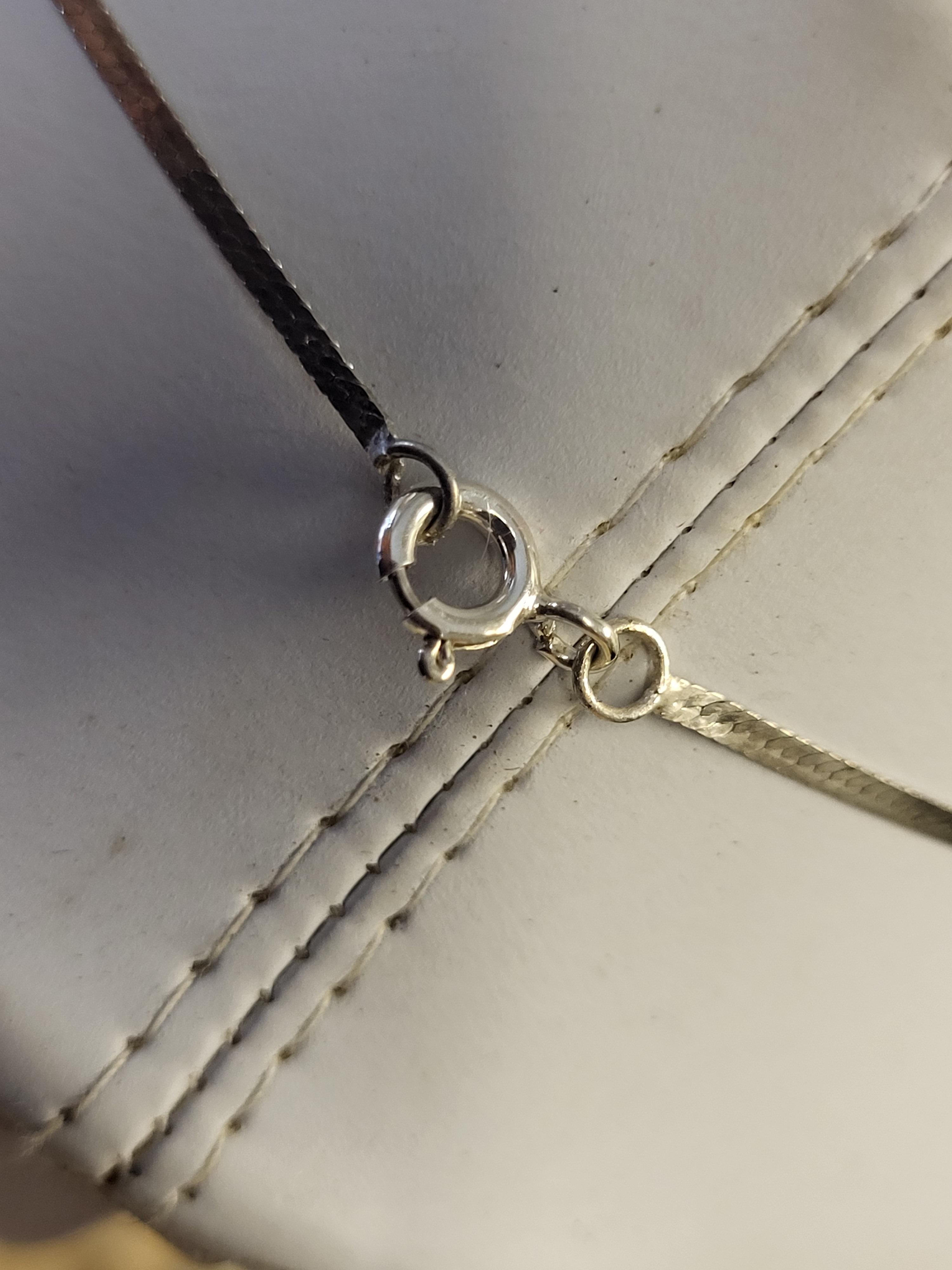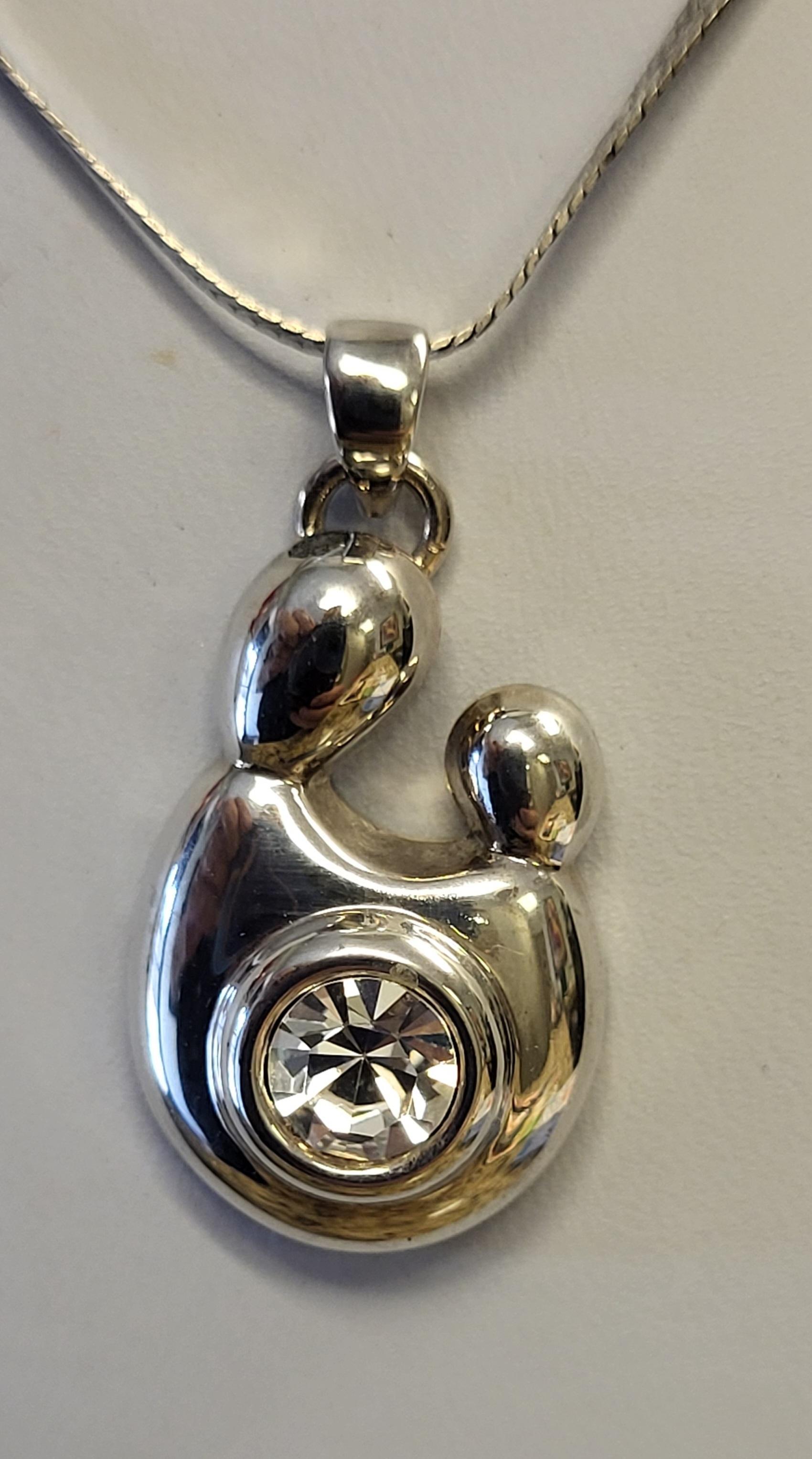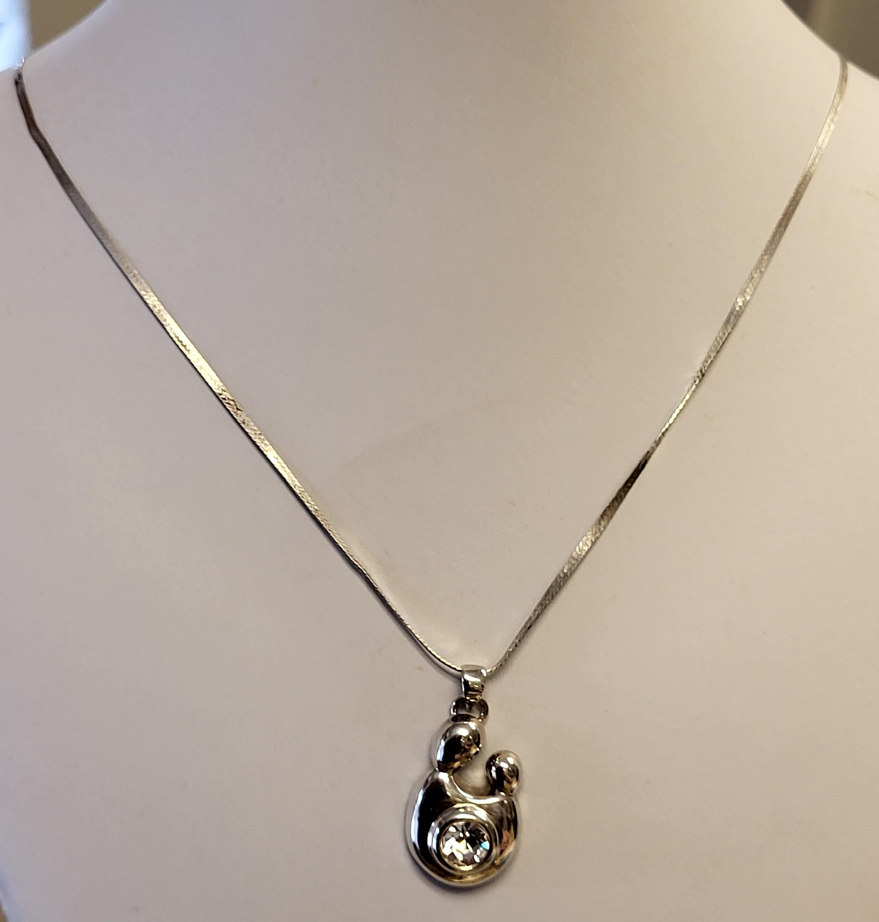 gorgeous 18″ herringbone sterling chain and mother and child pendant w/ appx 2 carat crystal 6.3 grams total see pics