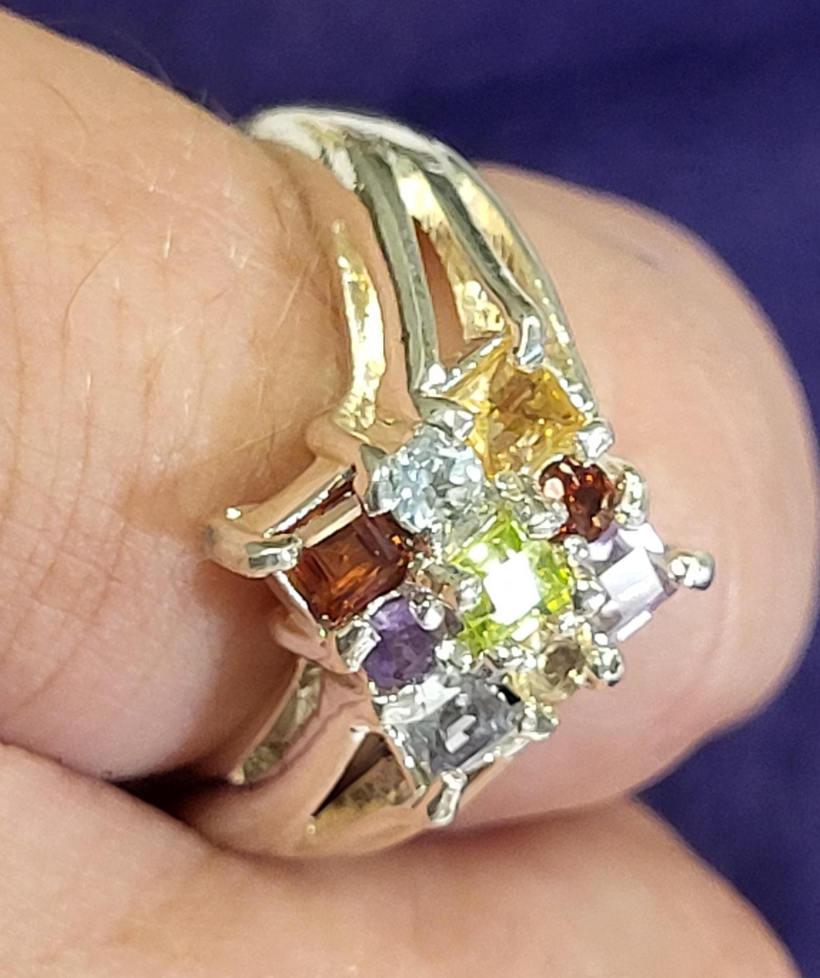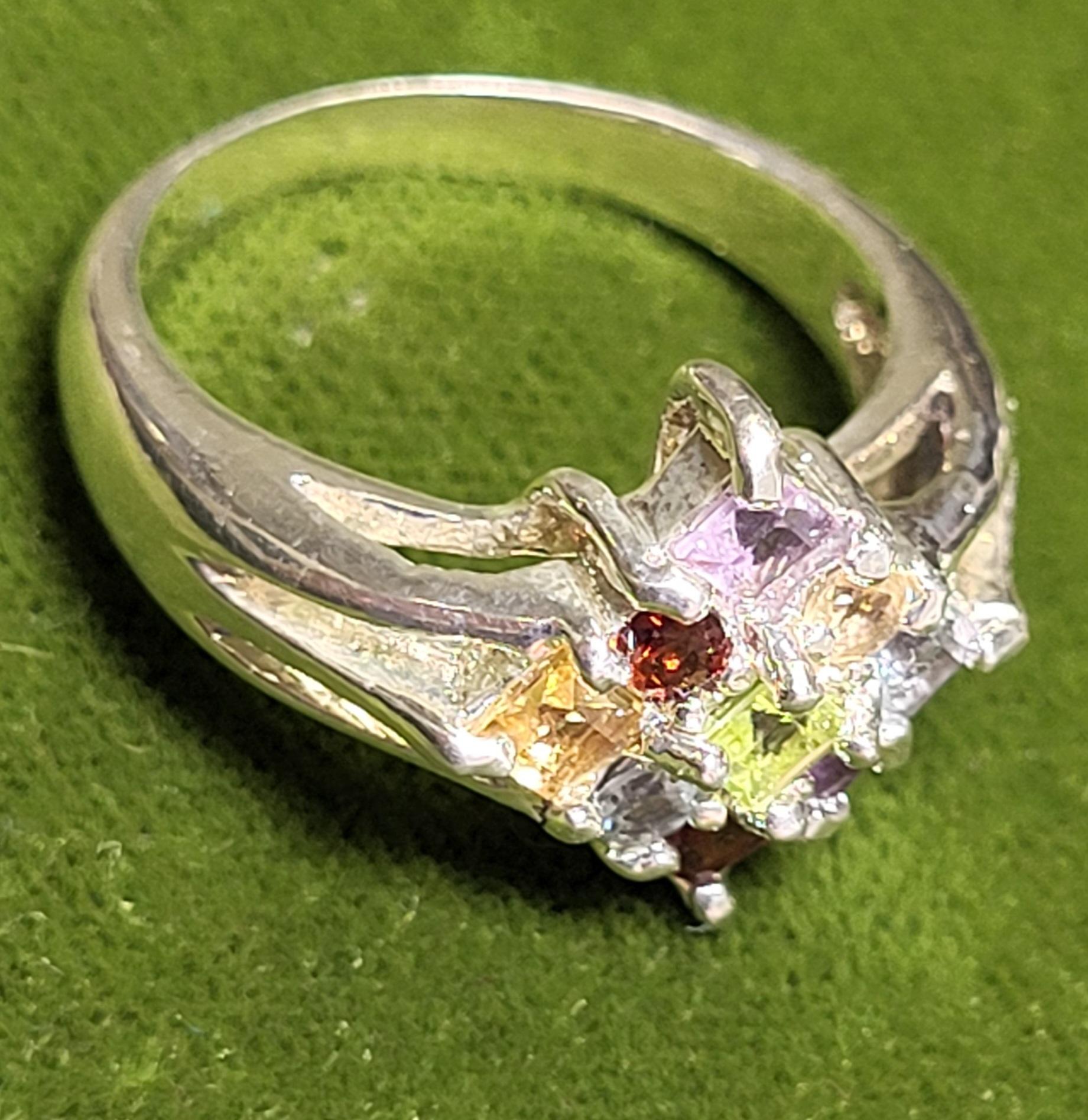 sterling silver multi gemstone ring ruby, garnet, Peridot++ beautiful ring size 7.5 sterling silver round brilliant and square cut stones see pics 5.5 grams