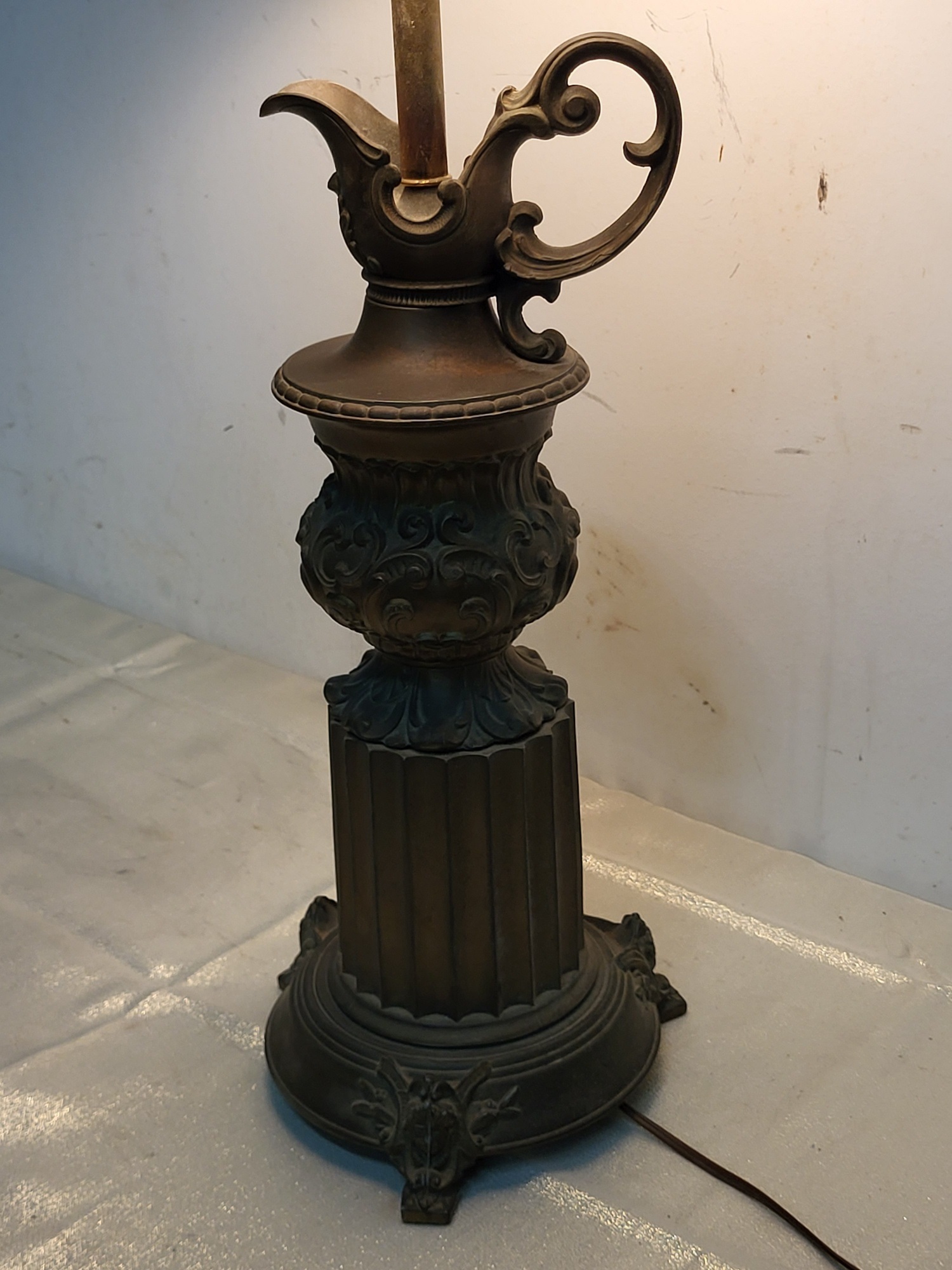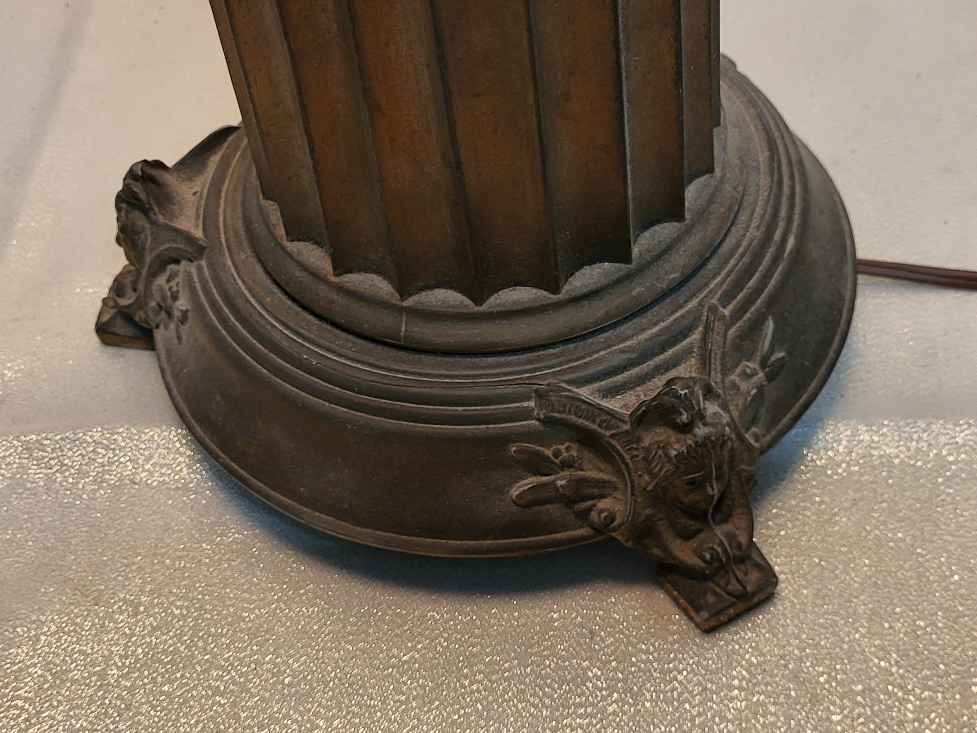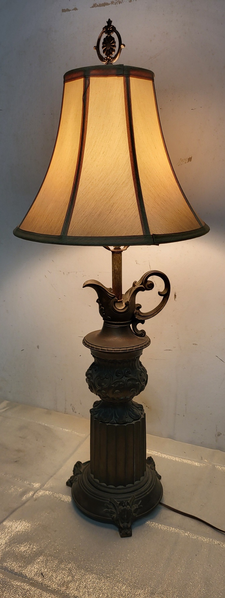 32″ tall with 14″ wide silk style shade fluted column cherub on the base see pics