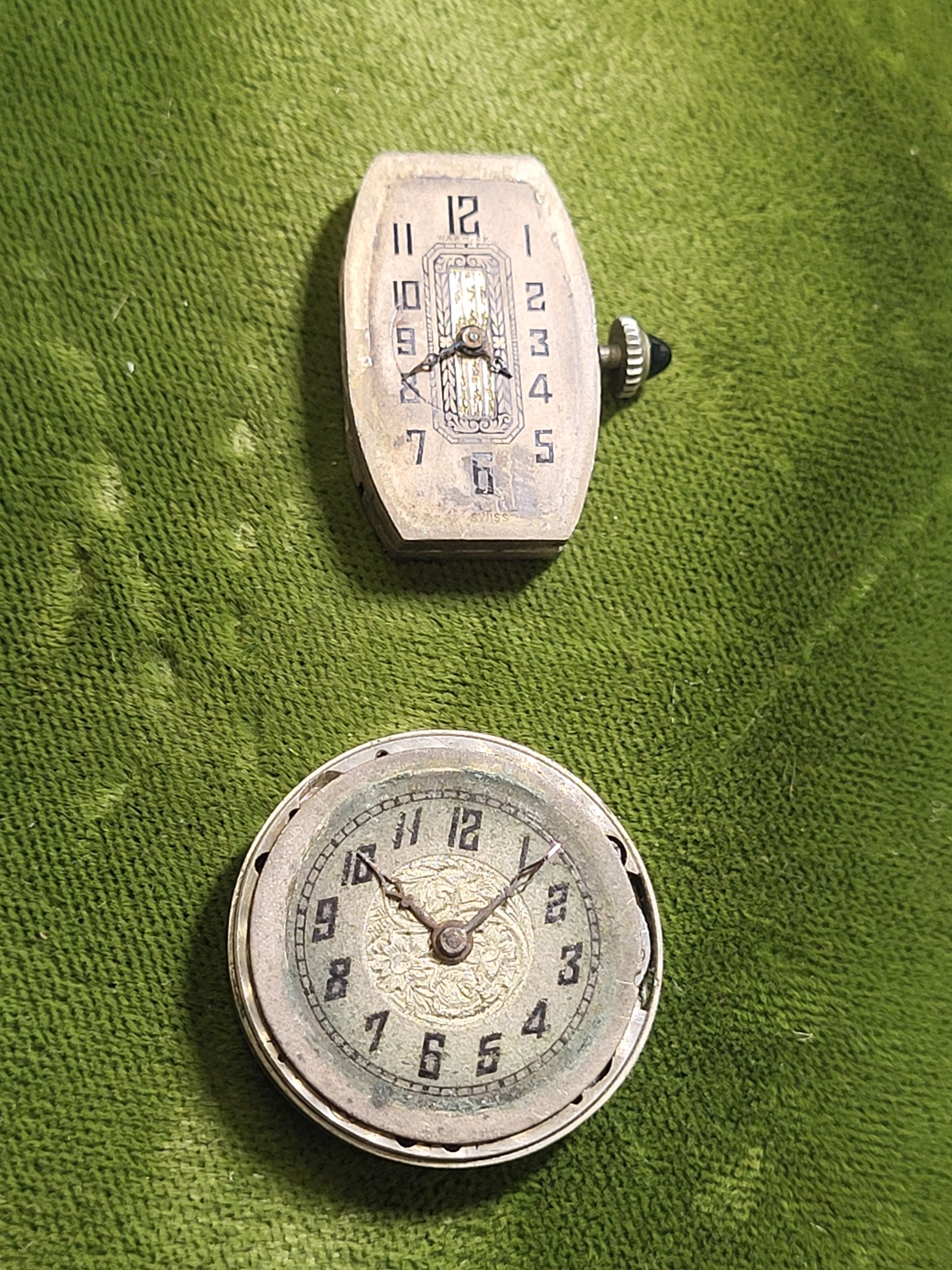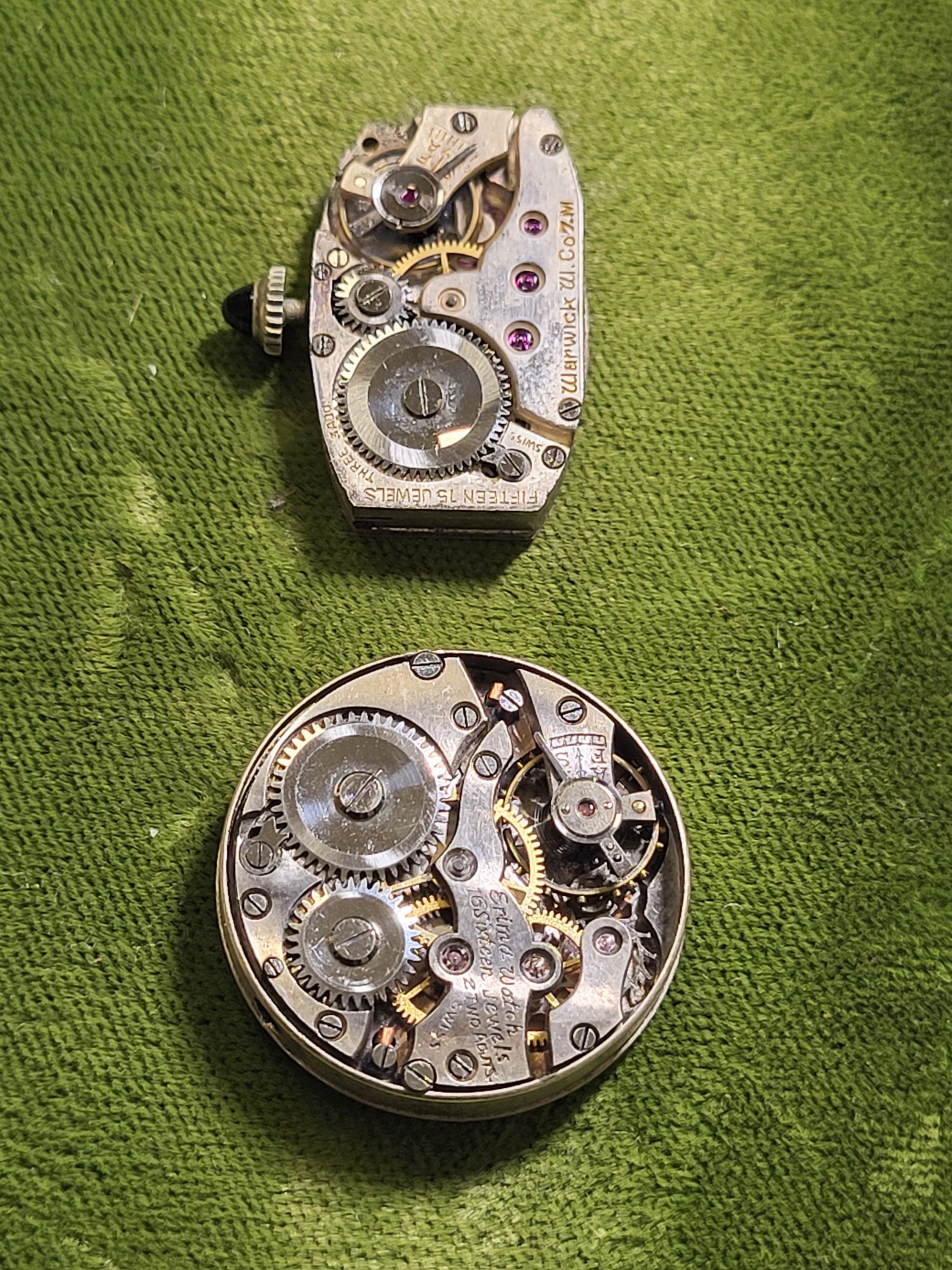 warwick 15 jewel 3 adj working and erlma watch 16 jewel 2 adj needs stem no watch cases see pics both fo rone bid
