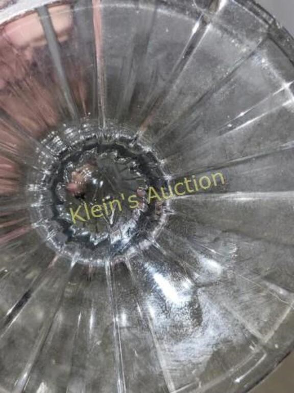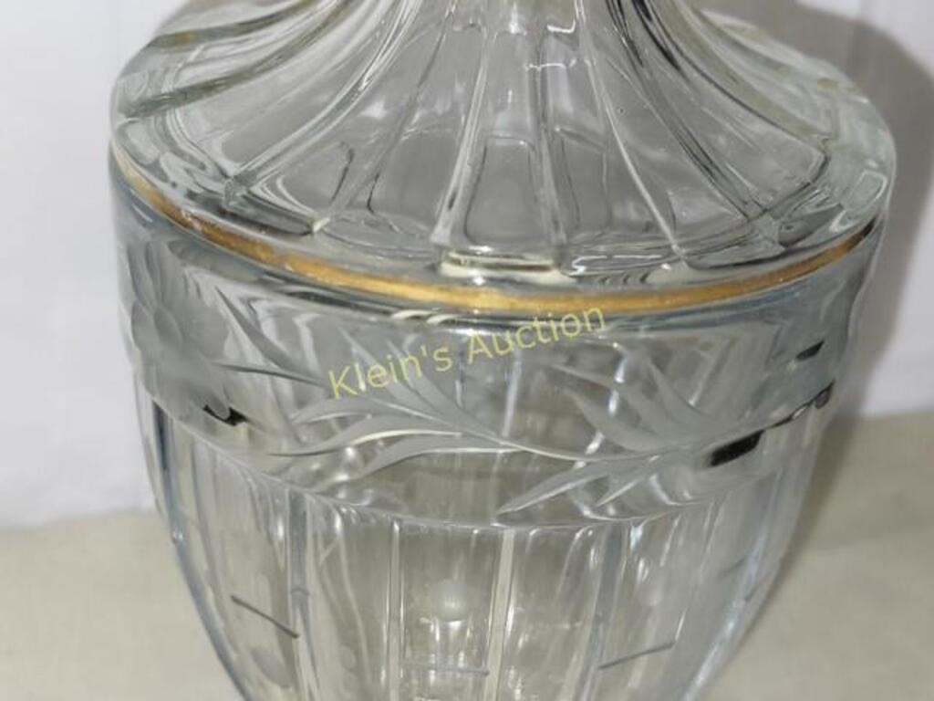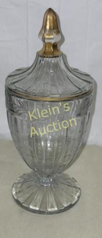 Clear glass with decorative gold trim on the finial and rim. 10 1/2″ tall with lid pedestal base, panelled sides, and a lidded top with a distinct finial. produced between 1915 and 1932.